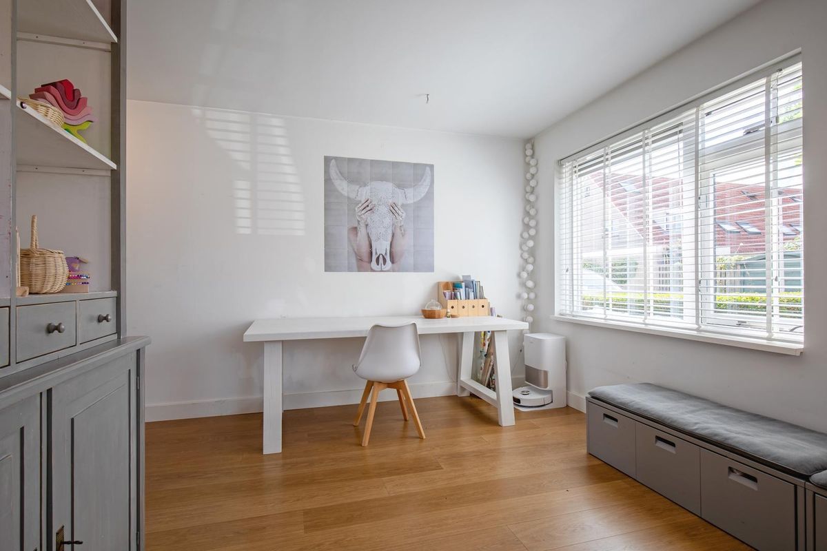 Via een vaste trap bereikt u de tweede verdieping, waar zich twee slaapkamers bevinden die dankzij de fijne lichtinval ook uitstekend geschikt zijn als hobby- of werkkamer. Eén van de slaapkamers is bovendien voorzien van een Velux Cabrio balkonvenster, dat niet alleen zorgt voor extra daglicht, maar ook een uniek buitengevoel creëert. Ook deze verdieping is afgewerkt met een laminaatvloer, wat zorgt voor een rustige en verzorgde uitstraling door het hele huis.