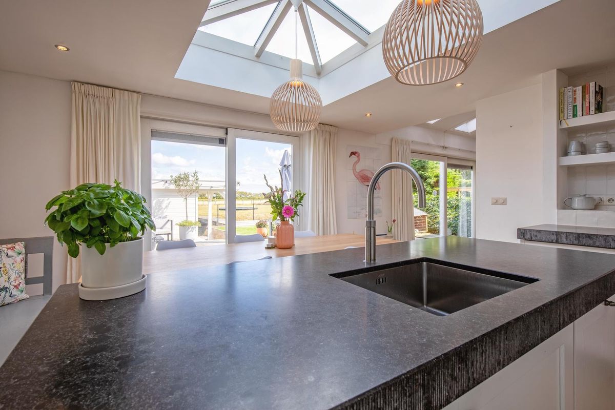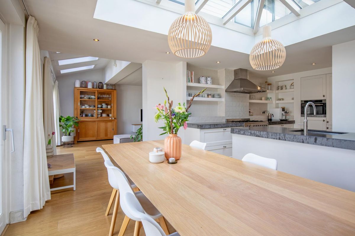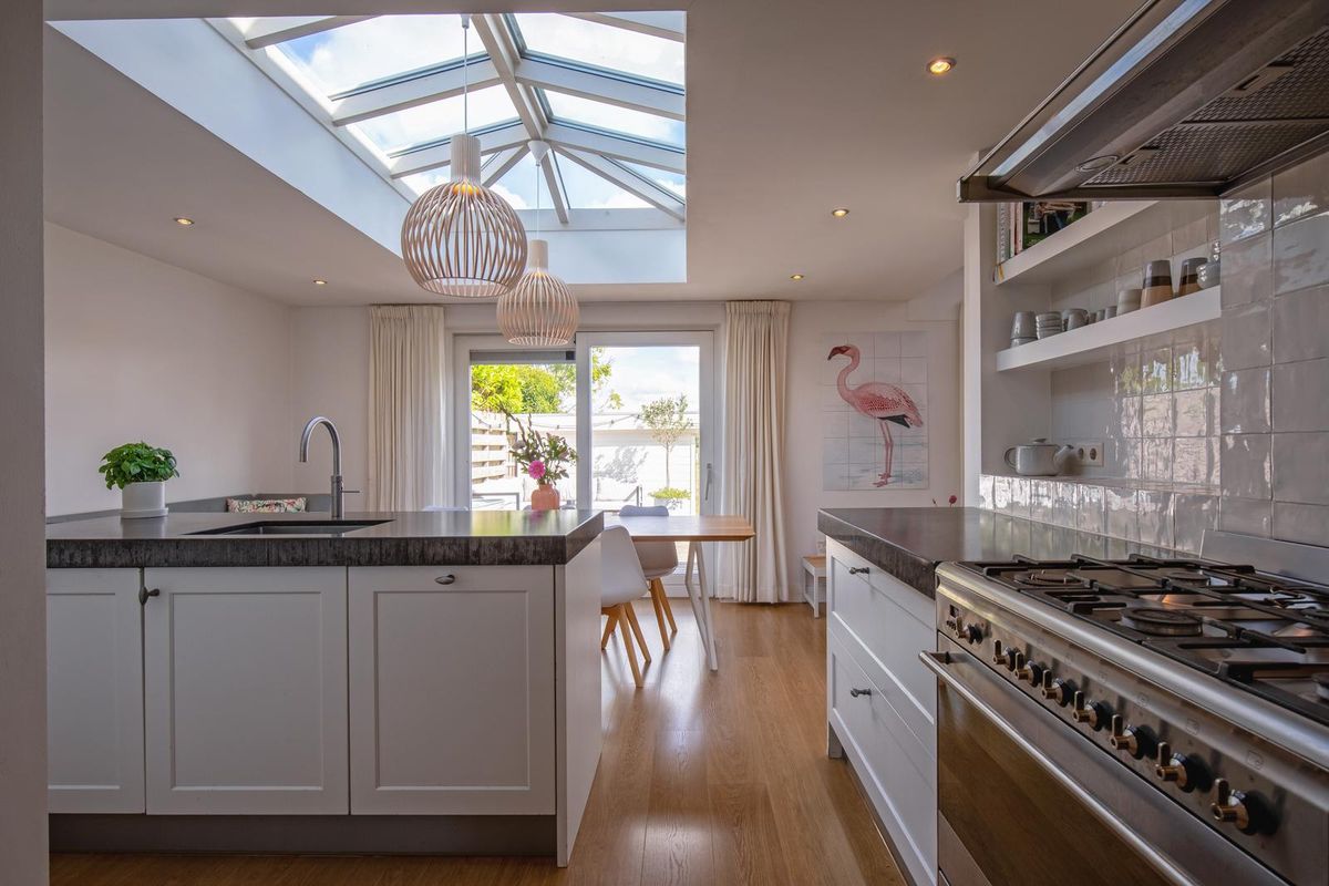 Aansluitend aan de woonkamer bevinden zich de eethoek en de open keuken. Deze keuken is voorzien van een kookeiland en royale kastruimte: ideaal voor de kookliefhebber. Een lichtstraat zorgt voor extra daglicht en een prettige, open sfeer. De keuken is daarnaast uitgerust met diverse inbouwapparatuur, waaronder een vaatwasser, Smeg fornuis met oven, afzuigkap, combimagnetron, koelkast en Quooker kraan (met kokend, gekoeld & bruisend water). Ook vanuit de keuken is er via een schuifpui directe toegang tot de tuin.