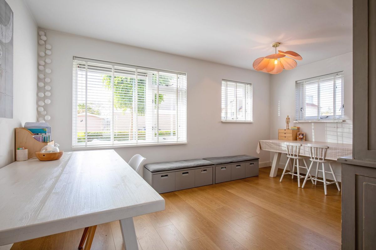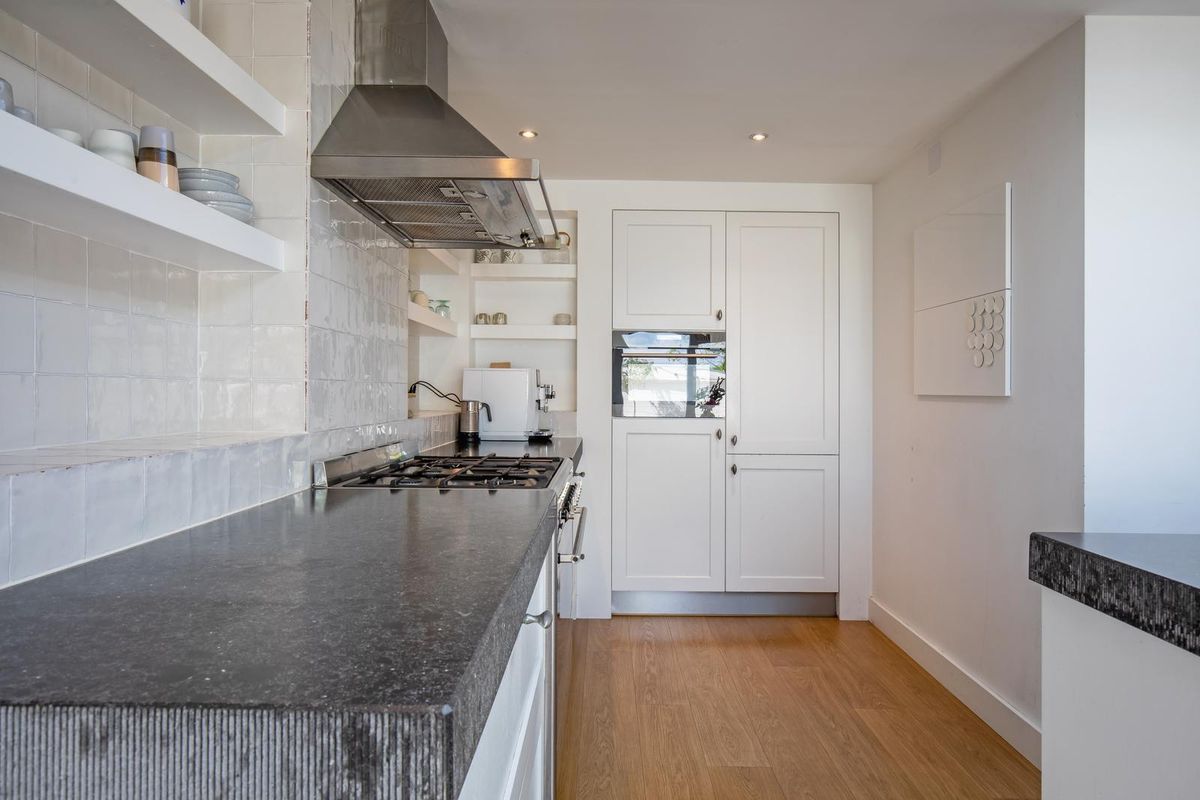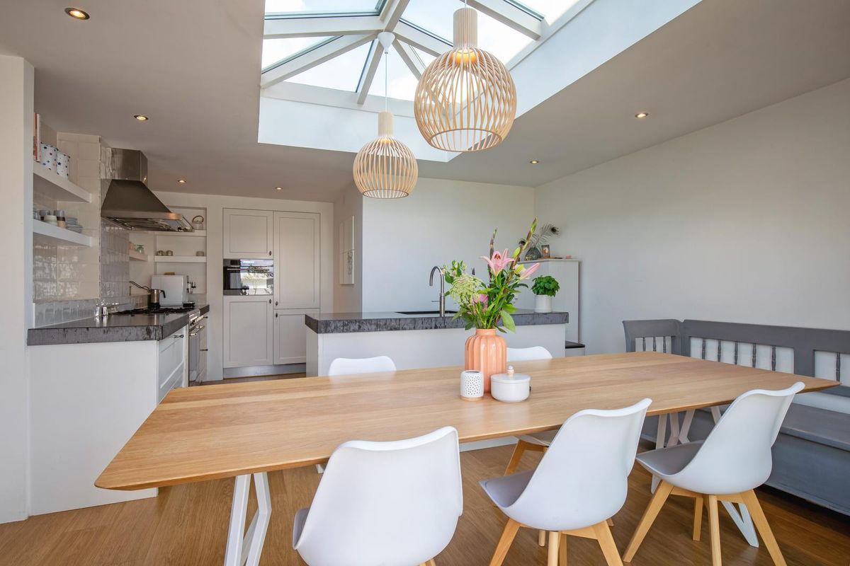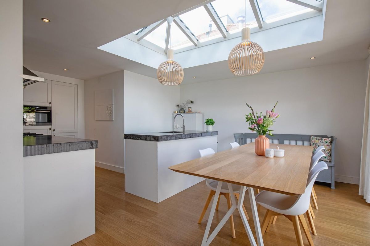 Aansluitend aan de woonkamer bevinden zich de eethoek en de open keuken. Deze keuken is voorzien van een kookeiland en royale kastruimte: ideaal voor de kookliefhebber. Een lichtstraat zorgt voor extra daglicht en een prettige, open sfeer. De keuken is daarnaast uitgerust met diverse inbouwapparatuur, waaronder een vaatwasser, Smeg fornuis met oven, afzuigkap, combimagnetron, koelkast en Quooker kraan (met kokend, gekoeld & bruisend water). Ook vanuit de keuken is er via een schuifpui directe toegang tot de tuin.