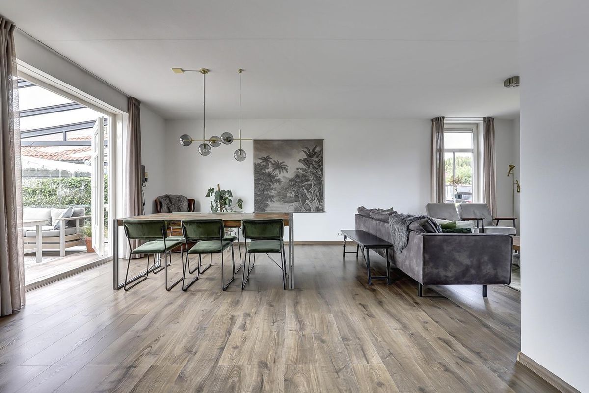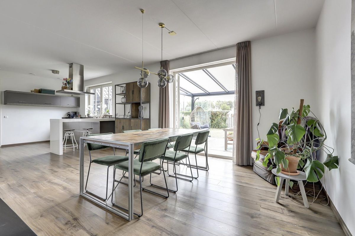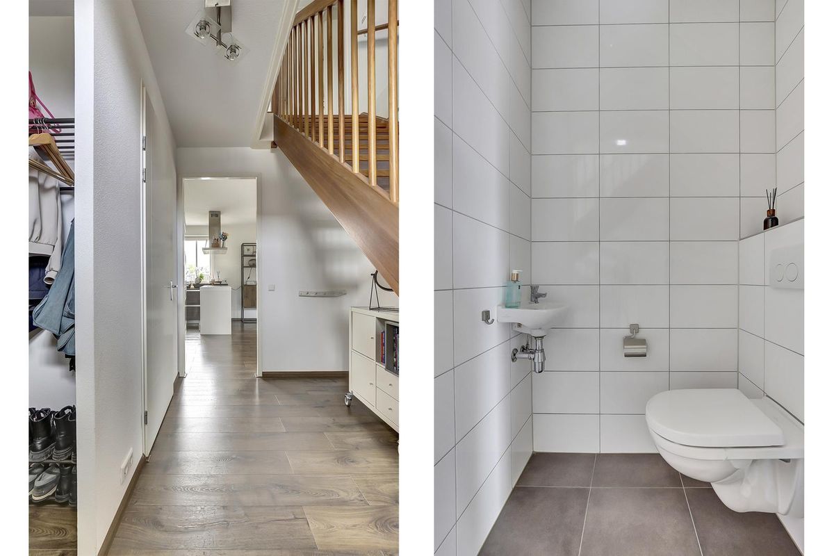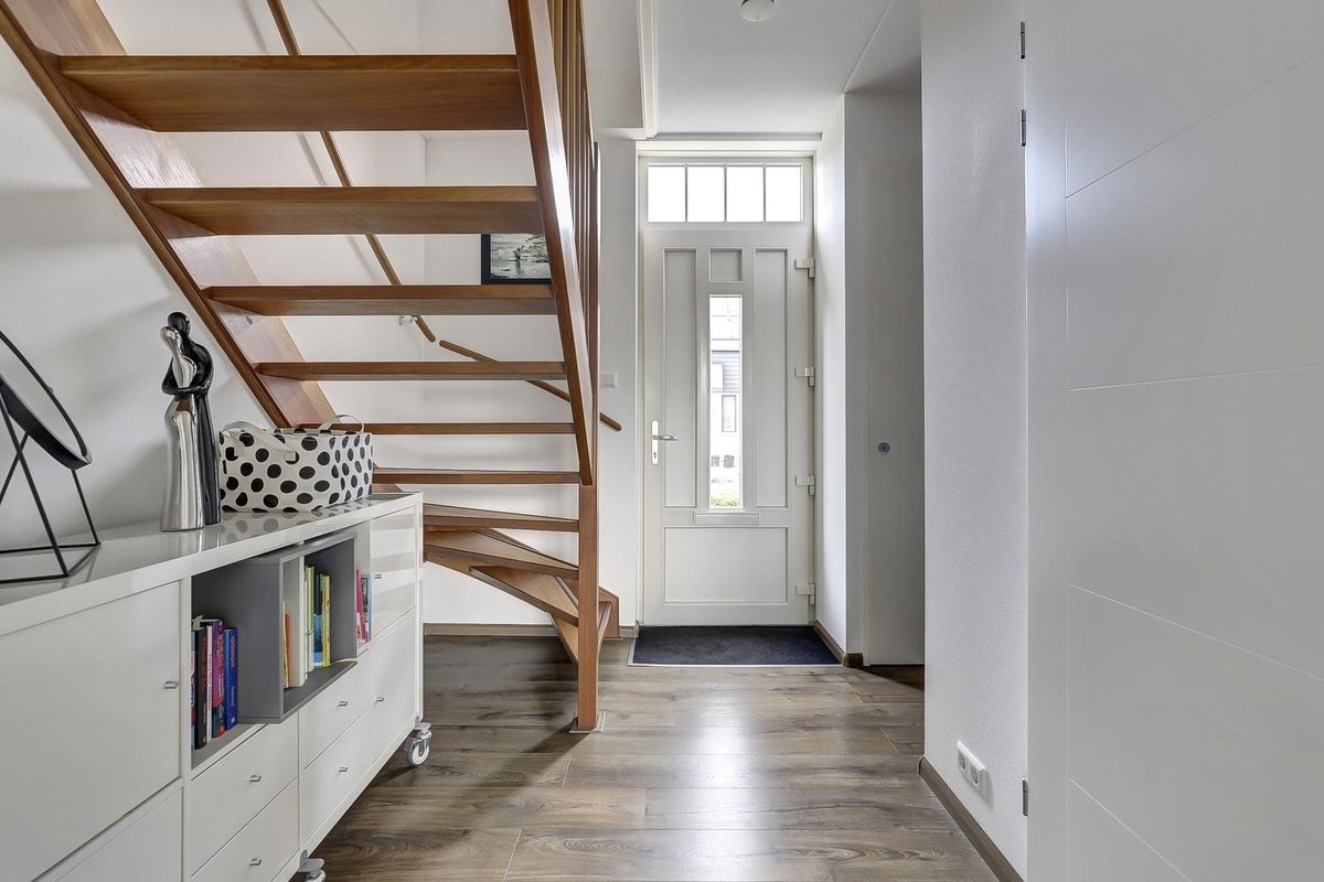 Entree in de hal met meterkast en toiletruimte. Via de hal loopt u de ruime woonkamer in met grote ramen, een eigentijdse afwerking en openslaande deuren naar de tuinkamer/serre. Deze lichte, glazen aanbouw verlengt het woonseizoen en verbindt binnen met buiten.