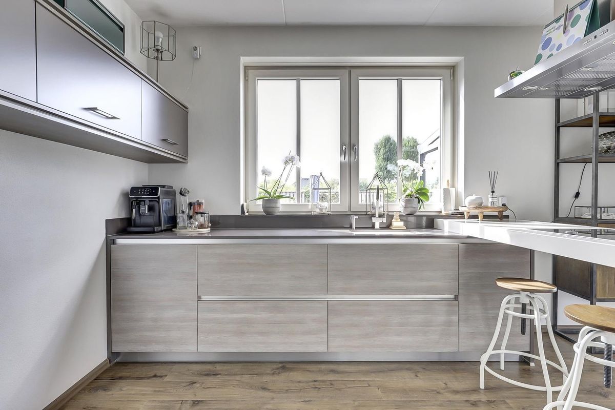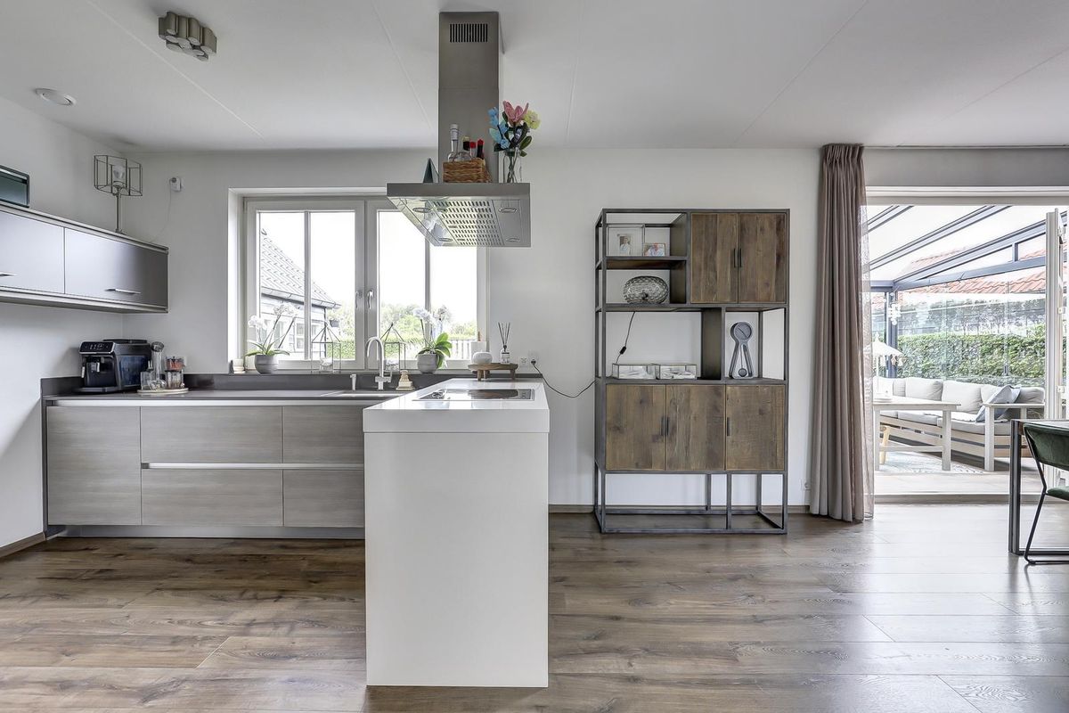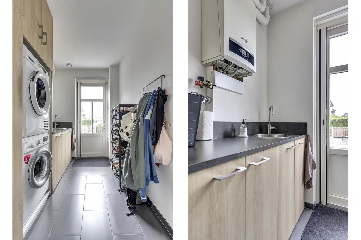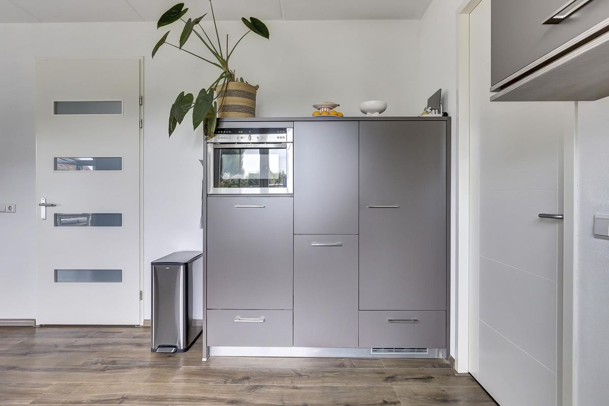De open keuken heeft een strakke opstelling met een werkeiland en bargedeelte en is uitgerust met inbouwapparatuur. Aansluitend ligt een bijkeuken met was- en bergruimte en een praktische zij-entree. De bijkeuken is in 2024 voorzien van een op maat gemaakte kastenwand. Verder is er op deze verdieping een slaap- of werkkamer, ideaal voor thuiswerken of slapen op de begane grond.