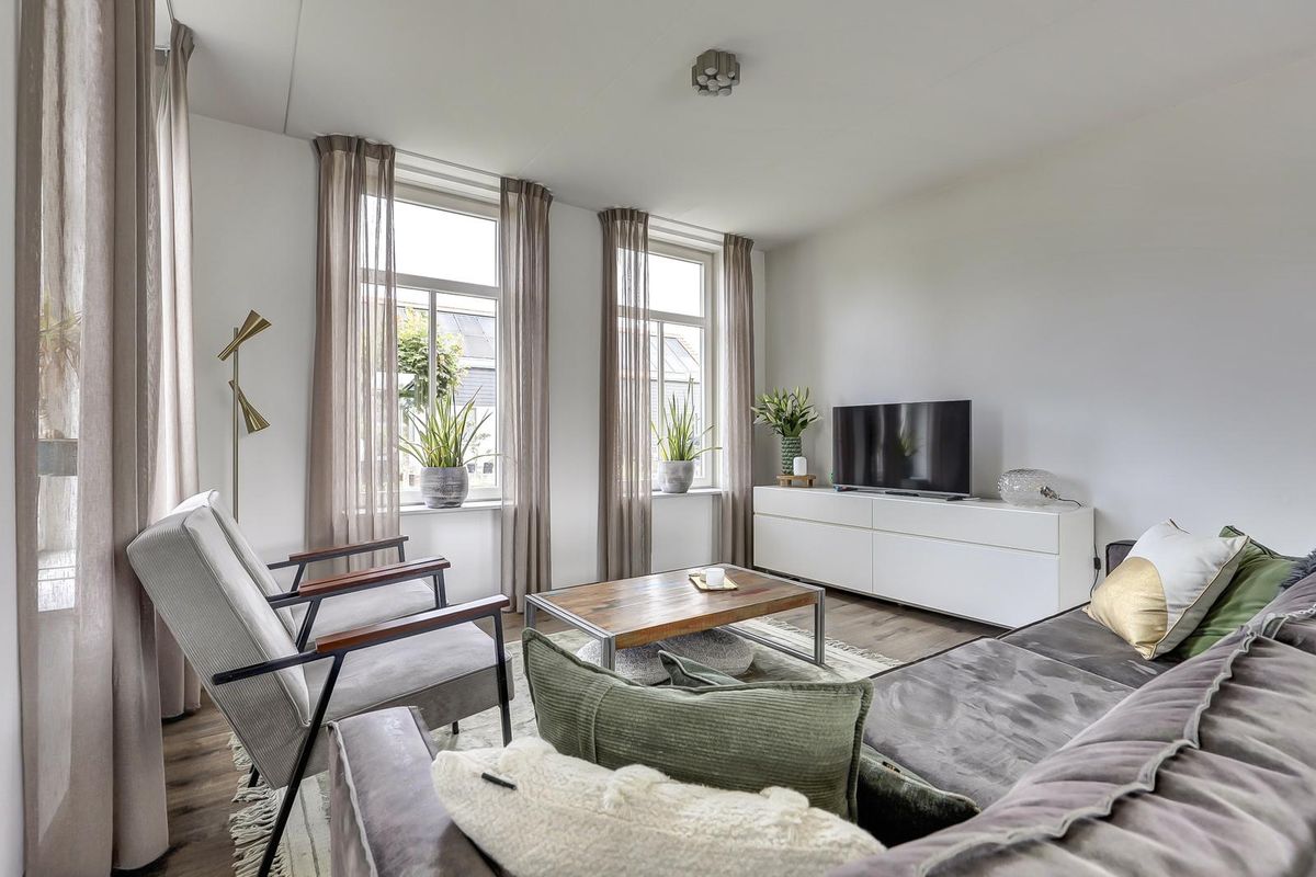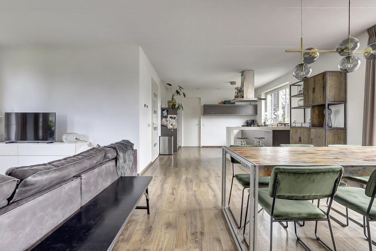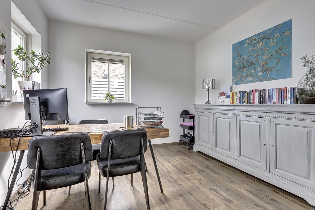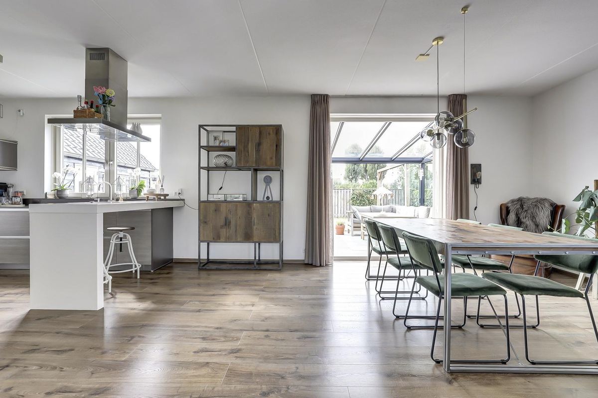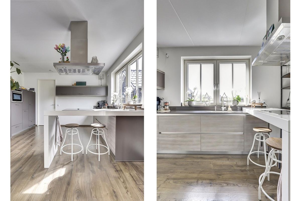 De open keuken heeft een strakke opstelling met een werkeiland en bargedeelte en is uitgerust met inbouwapparatuur. Aansluitend ligt een bijkeuken met was- en bergruimte en een praktische zij-entree. De bijkeuken is in 2024 voorzien van een op maat gemaakte kastenwand. Verder is er op deze verdieping een slaap- of werkkamer, ideaal voor thuiswerken of slapen op de begane grond.