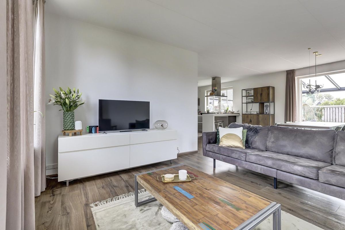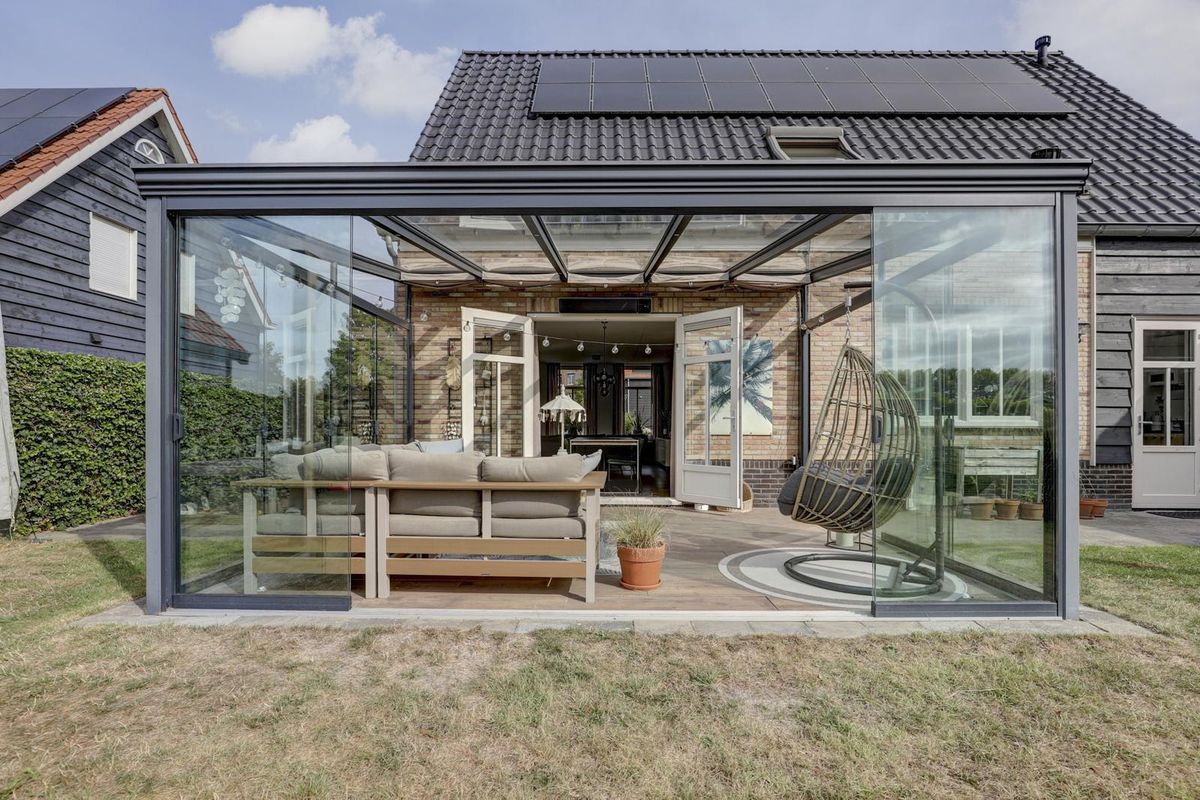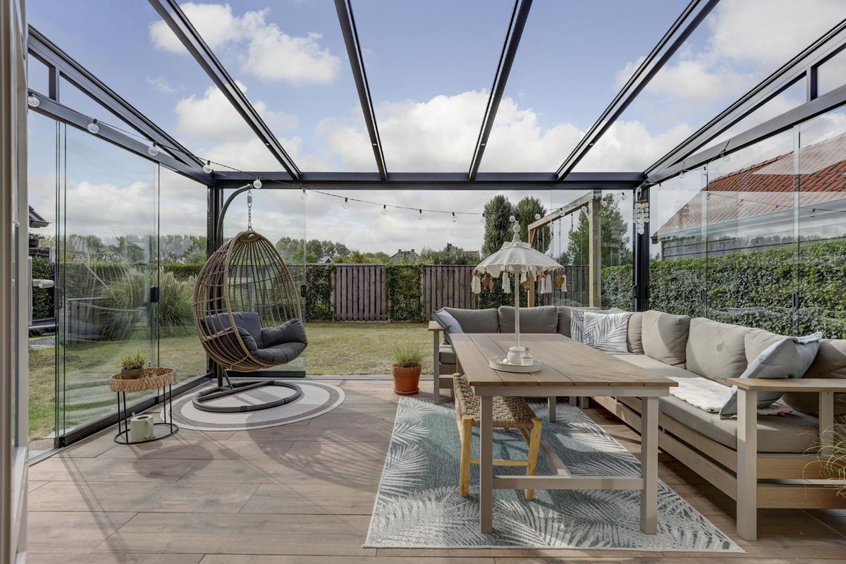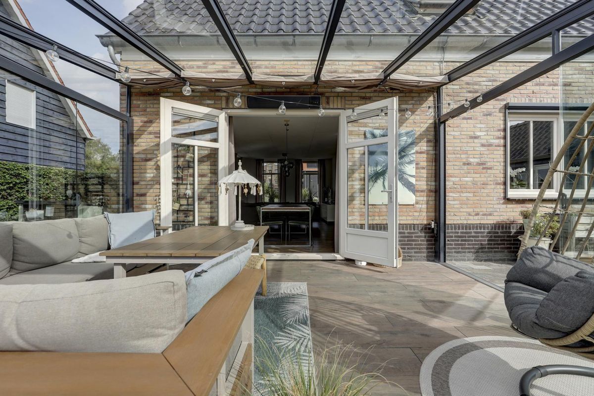 De woning staat op een riant perceel met aan de voorzijde een oprit op eigen terrein en via de zijkant een brede doorloop naar de achtertuin. Achter het huis strekt zich een ruime, groene en zonnige tuin met bovendien een achteruitgang. Blikvanger is de glazen overkapping/serre aan de achtergevel met schuifwanden. Een heerlijke plek om van vroeg in het voorjaar tot ver in het najaar buiten te zitten. Er is volop ruimte voor een grote eettafel én een loungehoek, terwijl kinderen zich kunnen uitleven bij het speeltoestel. Verder staat er een vrijstaande schuur/berging met elektra voor fietsen en tuingereedschap. Dankzij de buitenzonwering en de besloten ligging geniet je hier comfortabel en in alle rust van het buitenleven.