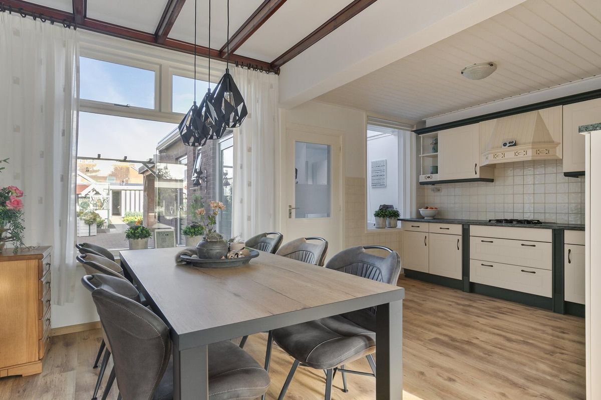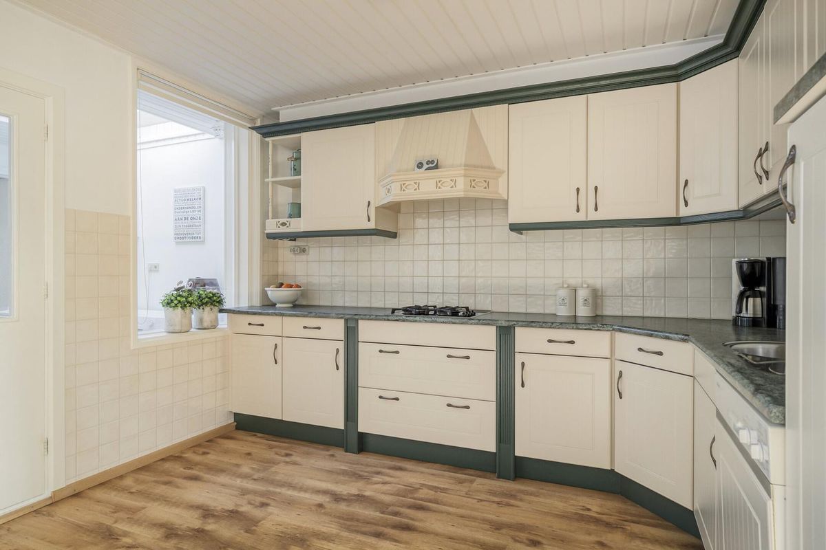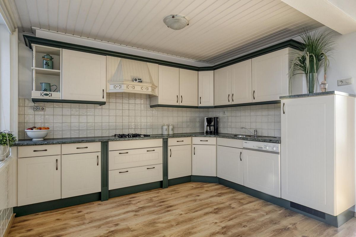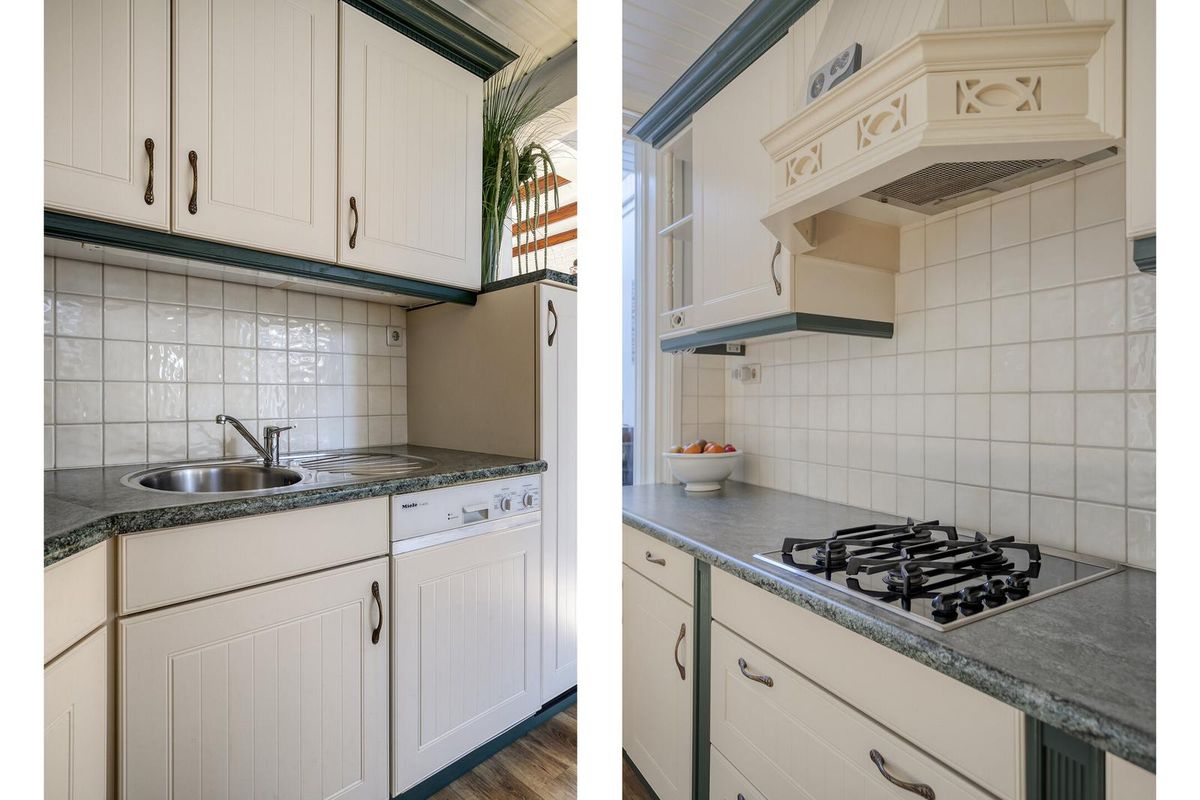 Aan de achterzijde bevindt zich de eethoek, met aangrenzend de ruime open keuken in hoekopstelling. De keuken is voorzien van een koelkast, vaatwasser, 4-pits gasfornuis en afzuigkap.