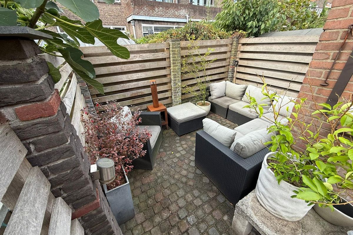 Via de keuken loop je zo de zonnige achtertuin in. Dankzij de ligging op het zuidwesten geniet je hier de hele dag van de zon. De tuin beschikt over een stenen berging met verwarming en aansluitingen voor wasmachine en -droger. Achter de berging is nog een comfortabel terras waar een grote loungehoek geplaatst kan worden.