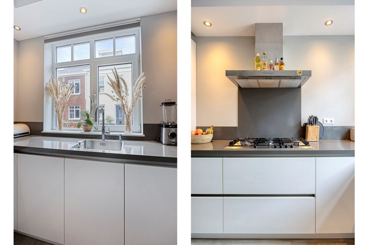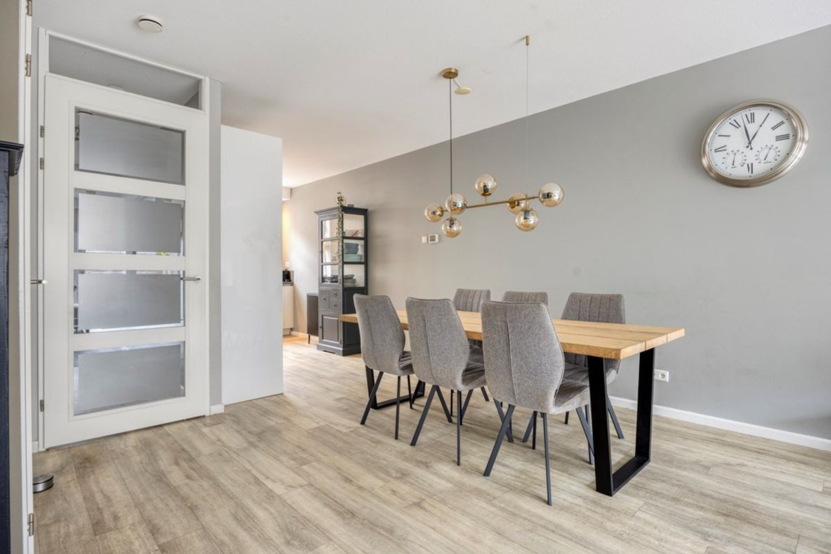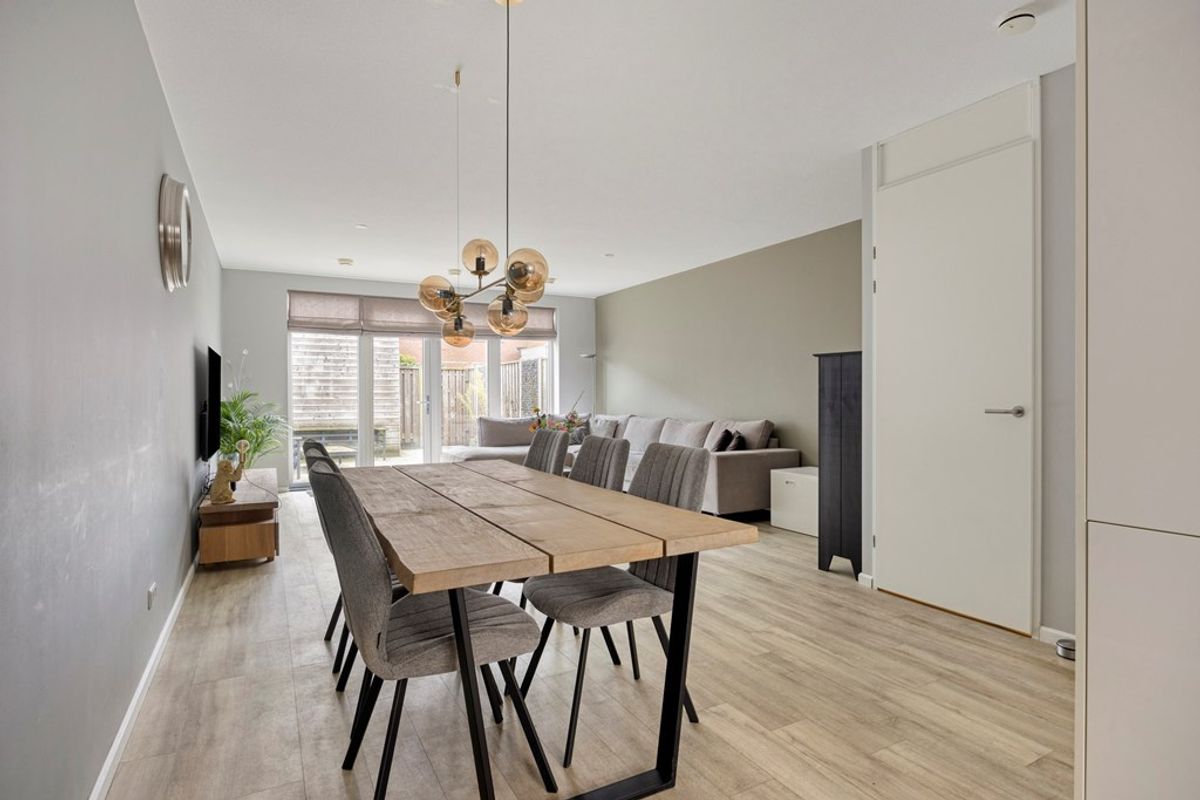 Aan de voorzijde ligt de luxe hoekkeuken, volledig uitgerust met inbouwapparatuur en slechts 8 jaar oud. Zo is er een Quooker, een vaatwasser, een combi-oven en een gewone oven, de koelkast, een vriezer en een 5-pits gaskookplaat met afzuigkap> door zijn hoek is er ook heel veel kastruimte aanwezig. We zo fijn als je van koken houdt. Terug naar de woonkamer. De woonkamer voelt echt als één grote leefruimte die je naar de zonnige achtertuin trekt.
