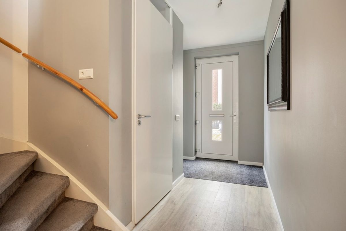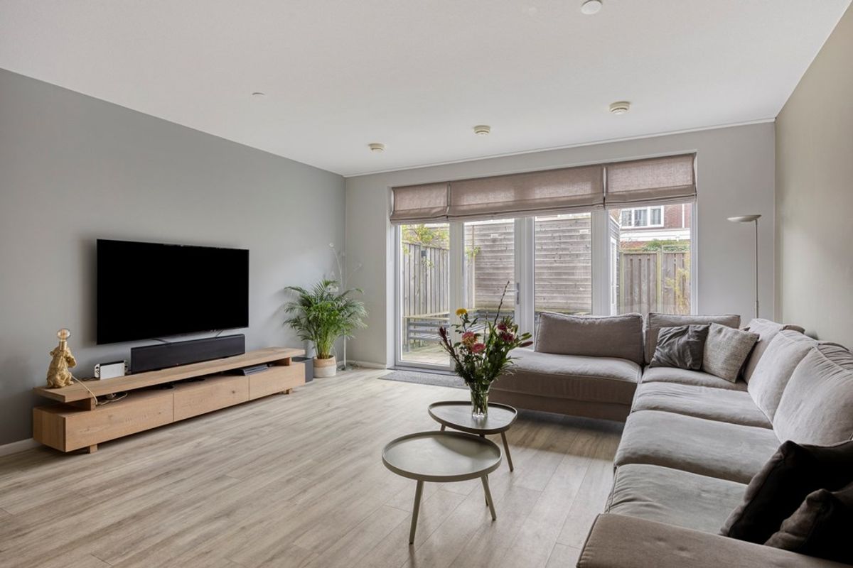 Wandel de straat in, want je kan niet met de auto hier komen. Heerlijk voor spelende kinderen en de rust. Je komt binnen in een ruime entree met de meterkast, het moderne toilet met een fontein en de trap naar boven. De breedte en het gevoel van ruimte vallen direct op. En dat is pas in de gang. Door naar de woonkamer. Die is echt uitzonderlijk ruim: bijna 5 meter breed en circa 7,5 meter diep. Vanuit de bouw is al gekozen voor een uitbouw waardoor je echt ruimte hebt. Dankzij de openslaande deuren stroomt het licht naar binnen en loopt je zo de tuin in. Het geheel is mooi en straks afgewerkt op de vloer (PVC) en de wanden en genoeg ruimte voor al je meubels.