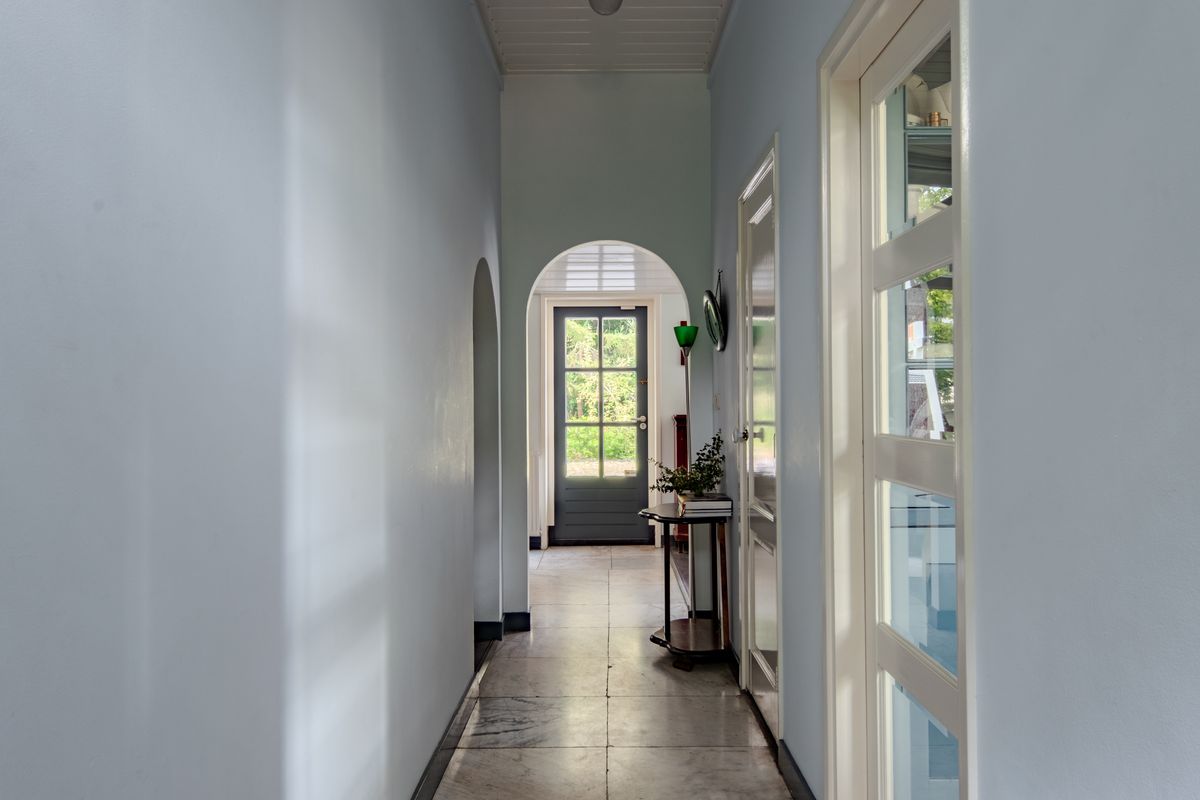 Bij binnenkomst via de originele voordeur wordt u verwelkomd in een royale hal met originele marmeren vloer en garderobe, waar het karakter en de elegantie van de woning direct voelbaar zijn.