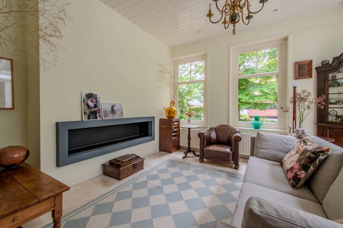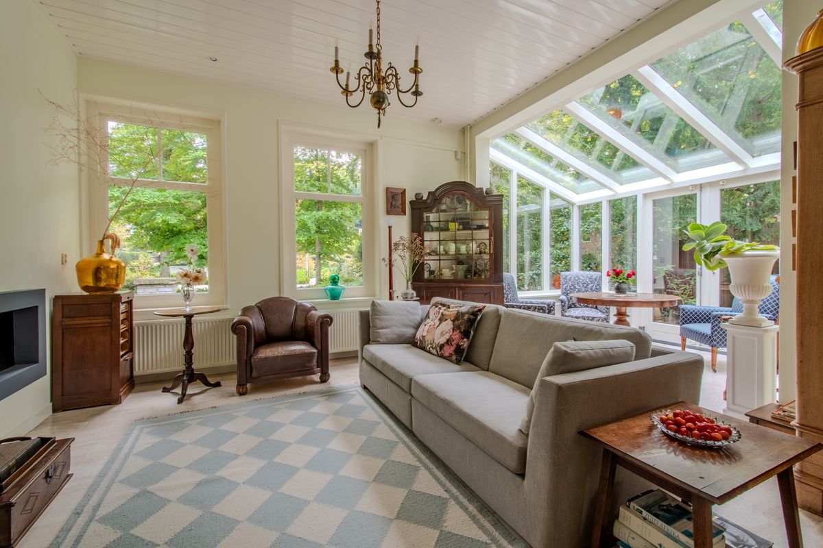 De tweede woonkamer straalt warmte en karakter uit. Hoge ramen laten veel licht binnen, terwijl de openhaard en de serre met openslaande deuren naar de tuin een uitnodigende sfeer creëren. De travertinvloer en het grote deels overdekte terras maken het gemakkelijk om binnen- en buitenleven te combineren en het hele jaar door te genieten van de heerlijke tuin.