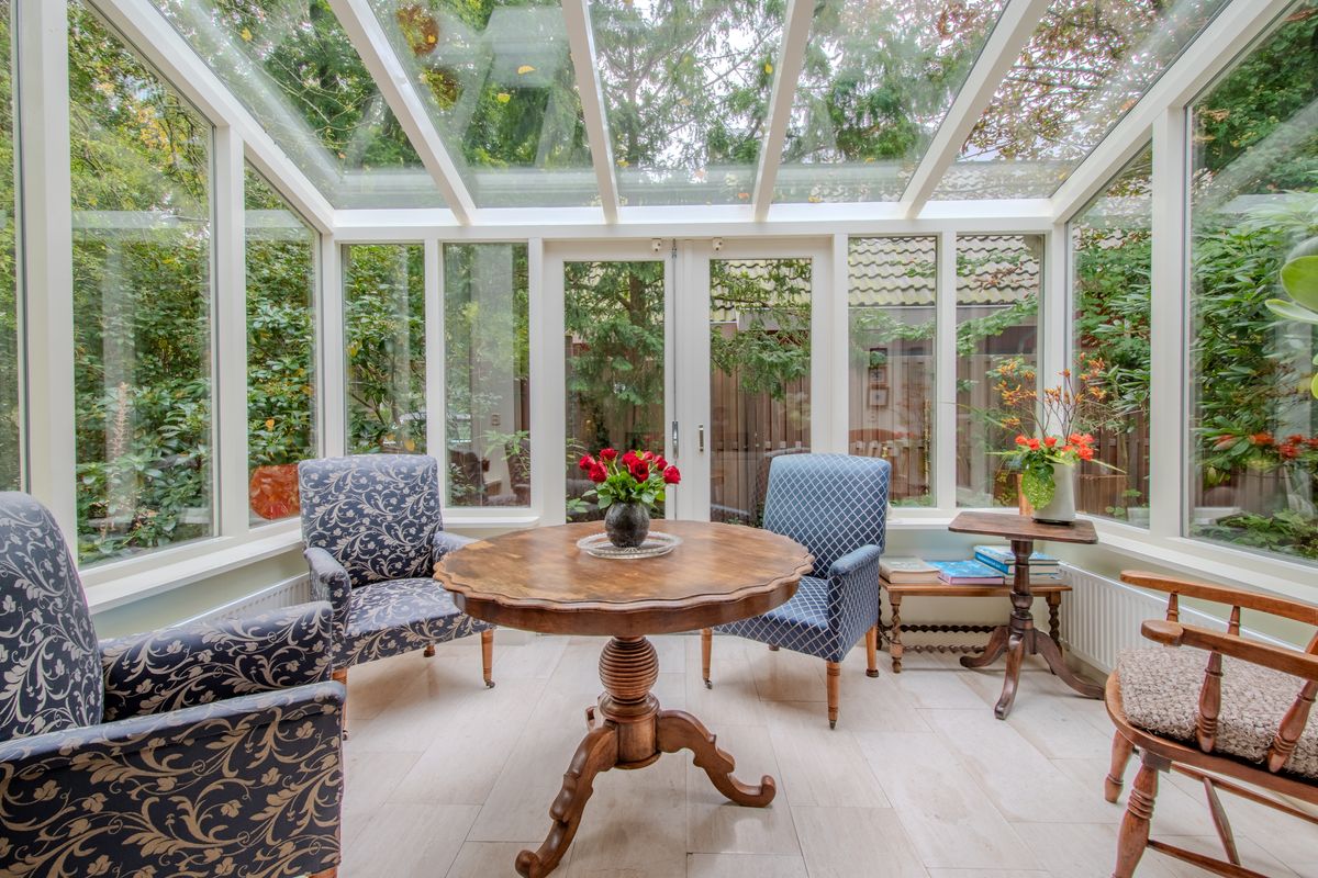 The second living room exudes warmth and character. Tall windows let in plenty of light, while the fireplace and conservatory with French doors to the garden create an inviting atmosphere. The travertine floor and the large partly covered terrace make it easy to combine indoor and outdoor living, allowing enjoyment of the beautiful garden all year round.