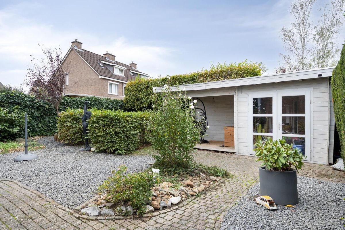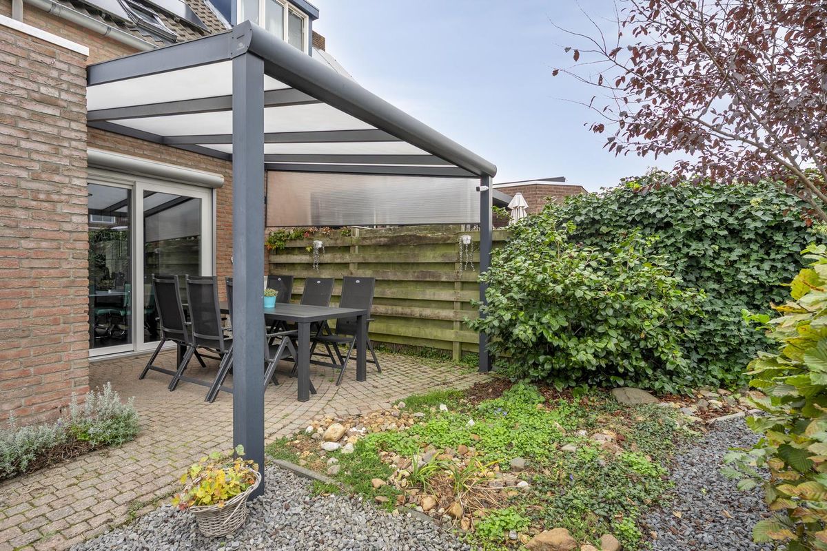 Aan straatzijde is de woning voorzien van een leuke voortuin en een ruime eigen oprit met wel plek voor 3 tot 4 auto's. De achtertuin is eveneens mooi aangelegen, voorzien van een houten tuinberging en door de Zuid-West ligging zonnig van aard. Het overdekt terras maakt het tot een zeer complete en aangename tuin.