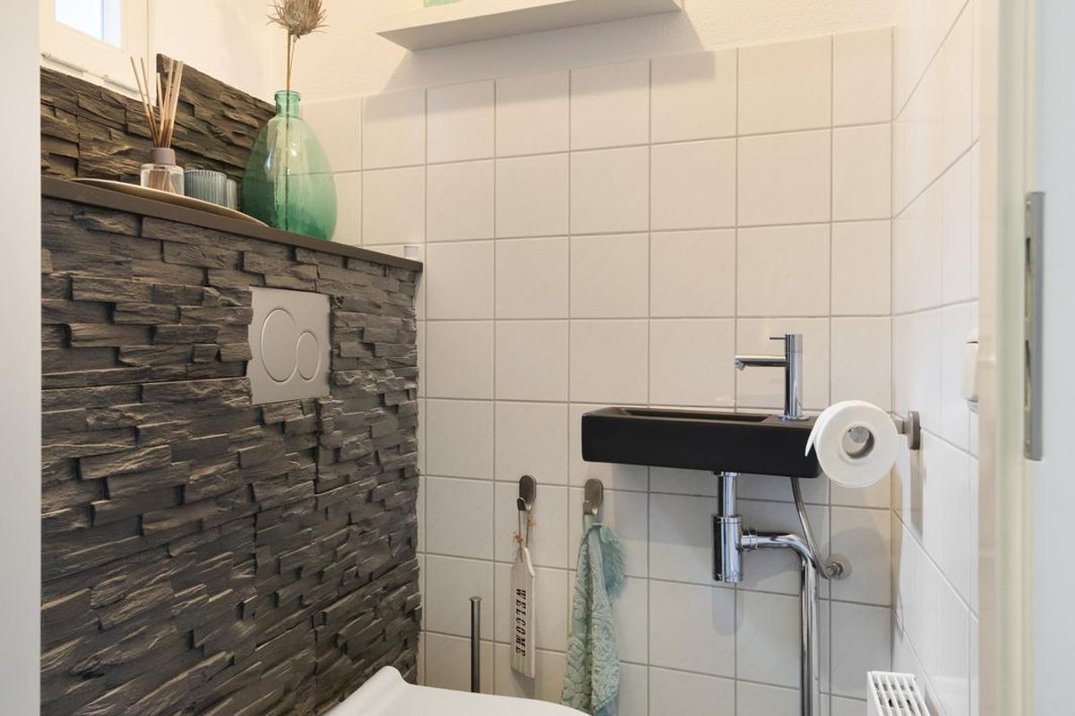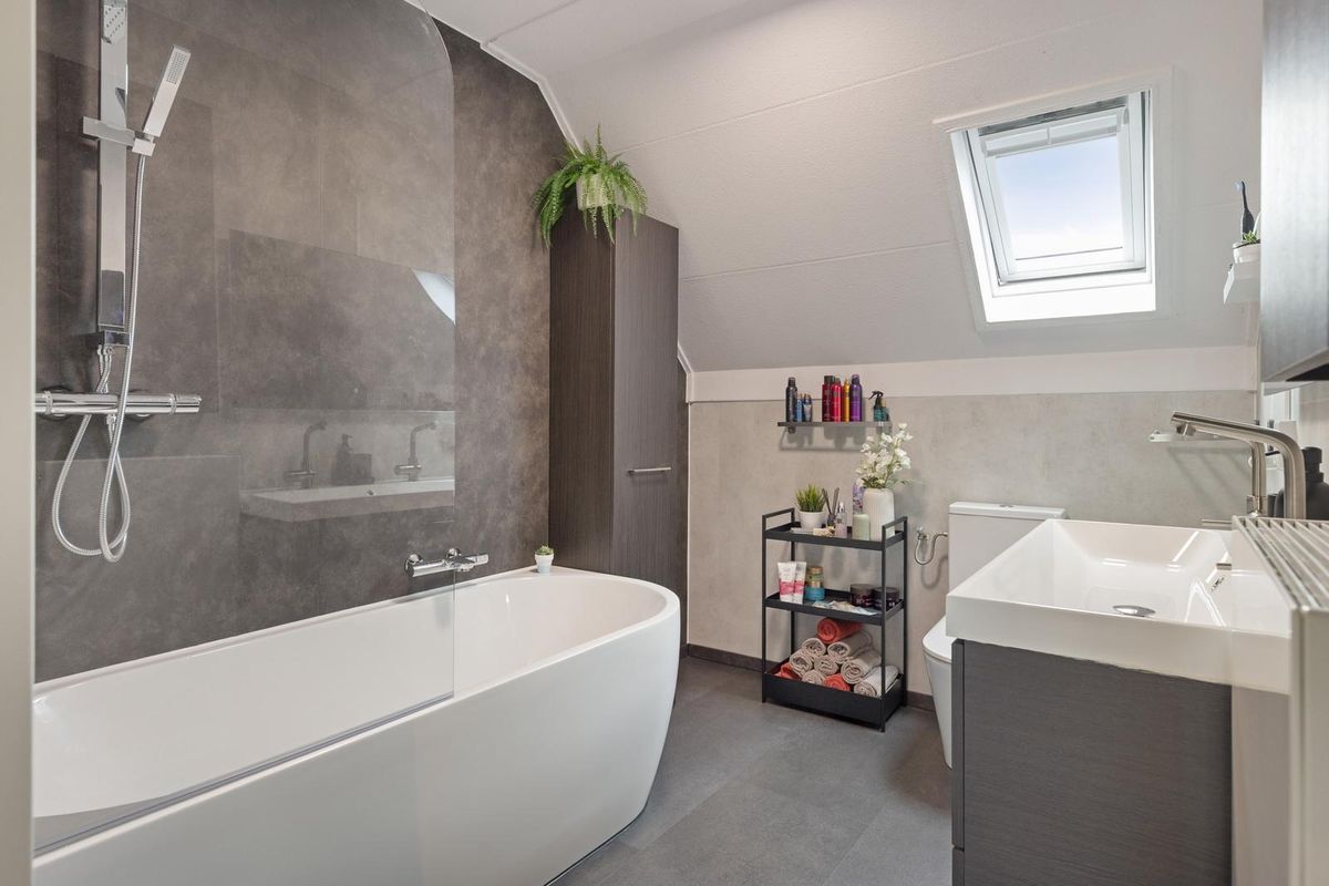 Centrale overloop met grote bergkast, toegang tot 3 ruime slaapkamers en de in 2025 gemoderniseerde badkamer, compleet met ligbad, extra toilet en wastafel met 2 kranen. Mooie toevoeging is het dakraam en de grote verwarmde spiegel.
