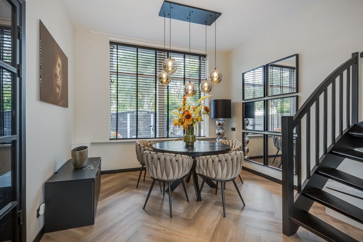 1e verdieping: Voortuin, Entree woning, hal met toilet, deur naar woonkamer, eetkamer en keuken in serre. De woonkeuken is voorzien van diverse inbouwapparatuur en schuifpui naar de zonnige achtertuin.