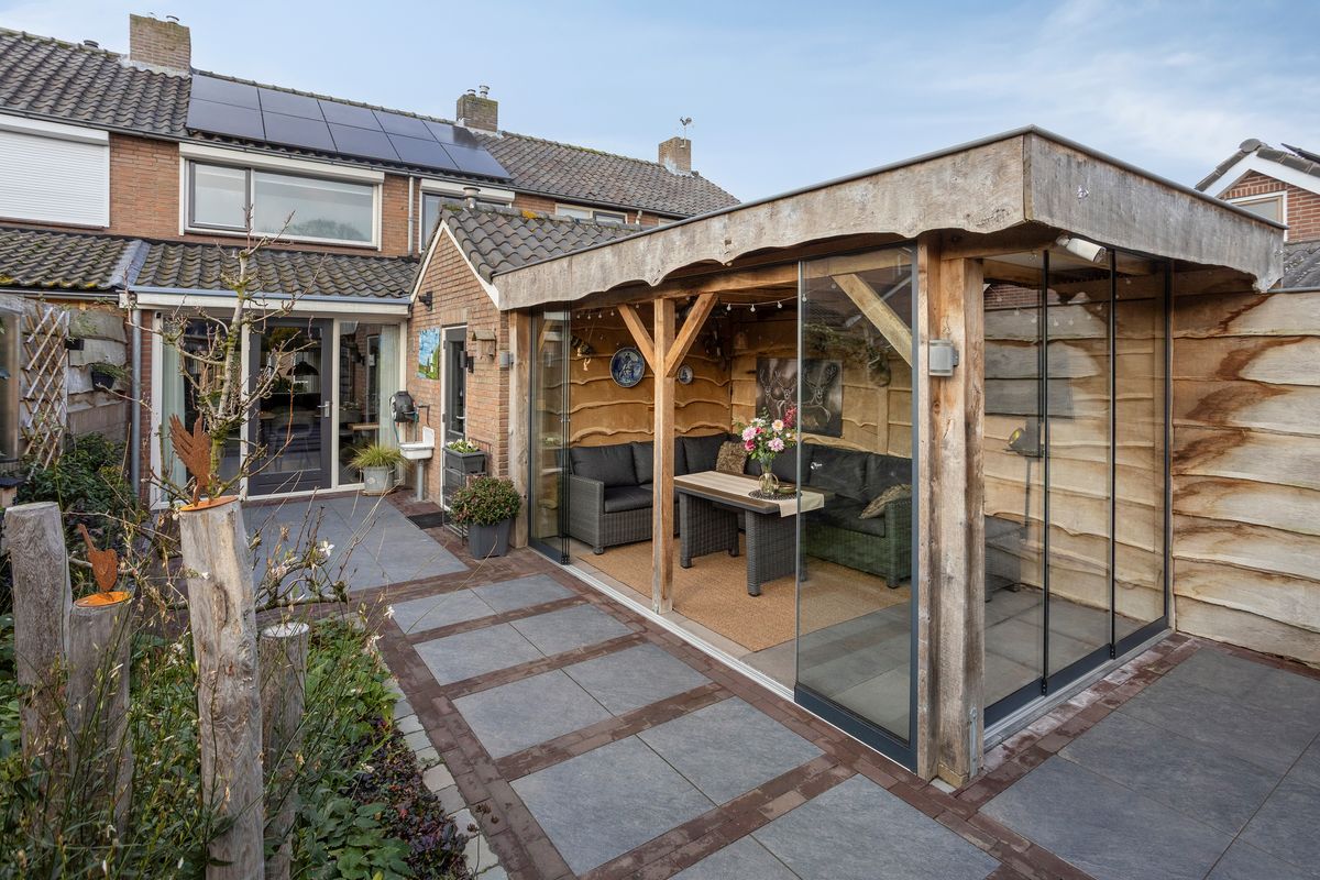 De diepe, fraai aangelegde achtertuin op het zuidoosten is een groot pluspunt. Mooie bestrating, een achterom, een grote overkapping achter in de tuin en een extra berging maken het geheel compleet. De gezellige veranda, met glazen schuifwanden aan twee kanten, en de eikenhouten afwerking geven deze plek een sfeer waar je elk seizoen van kunt genieten.