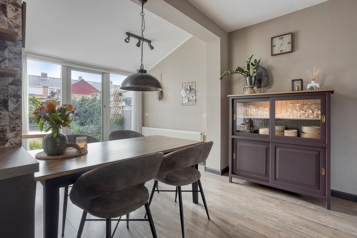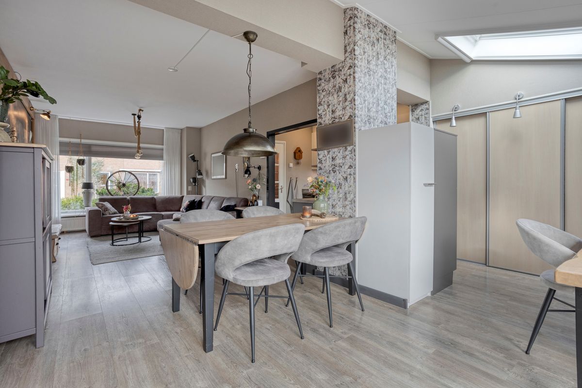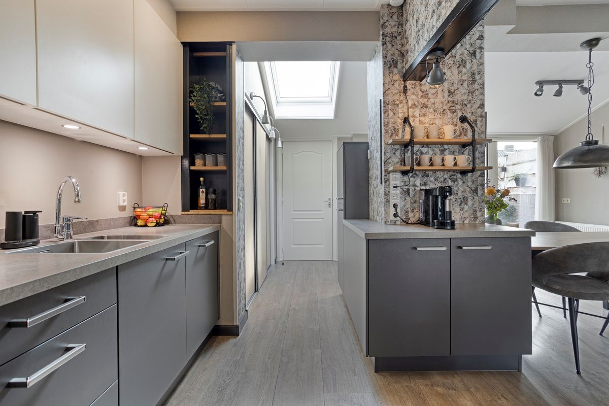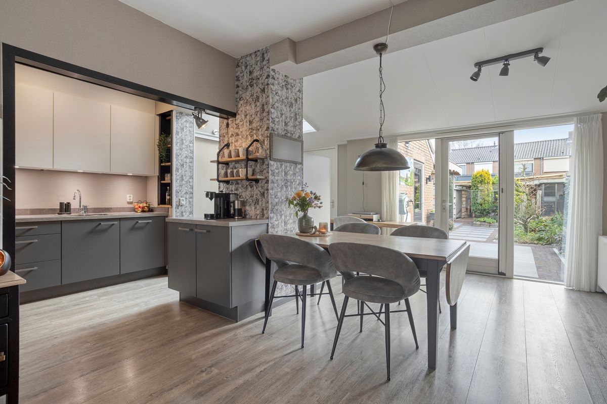 Je komt binnen in de hal met meterkast, trapkast en een vernieuwde toiletruimte met zwevend toilet. Vervolgens stap je de keuken en royale woonkamer in, waar aan de voorzijde een fijn zitgedeelte is gecreëerd. Dankzij de volle breedte-uitbouw aan de achterzijde is er bij de tuinzijde een ruim eetgedeelte ontstaan met zelfs nog genoeg plek voor een extra fauteuil of werkhoek. De terrasdeur, met aan weerszijde ramen tot aan de grond, zorgt voor een prachtige lichtinval én direct zicht op de diepe tuin. Centraal in huis ligt de open keuken met inbouwapparatuur. Ook hierachter loopt de uitbouw door, waardoor er een praktische kastenwand is geplaatst, ideaal voor extra opbergruimte. Het dakraam hierboven brengt extra daglicht naar binnen. Achteraan de woning bevindt zich de ruime bijkeuken met opstelling voor de C.V.-ketel en aansluitingen voor wasmachine en droger.