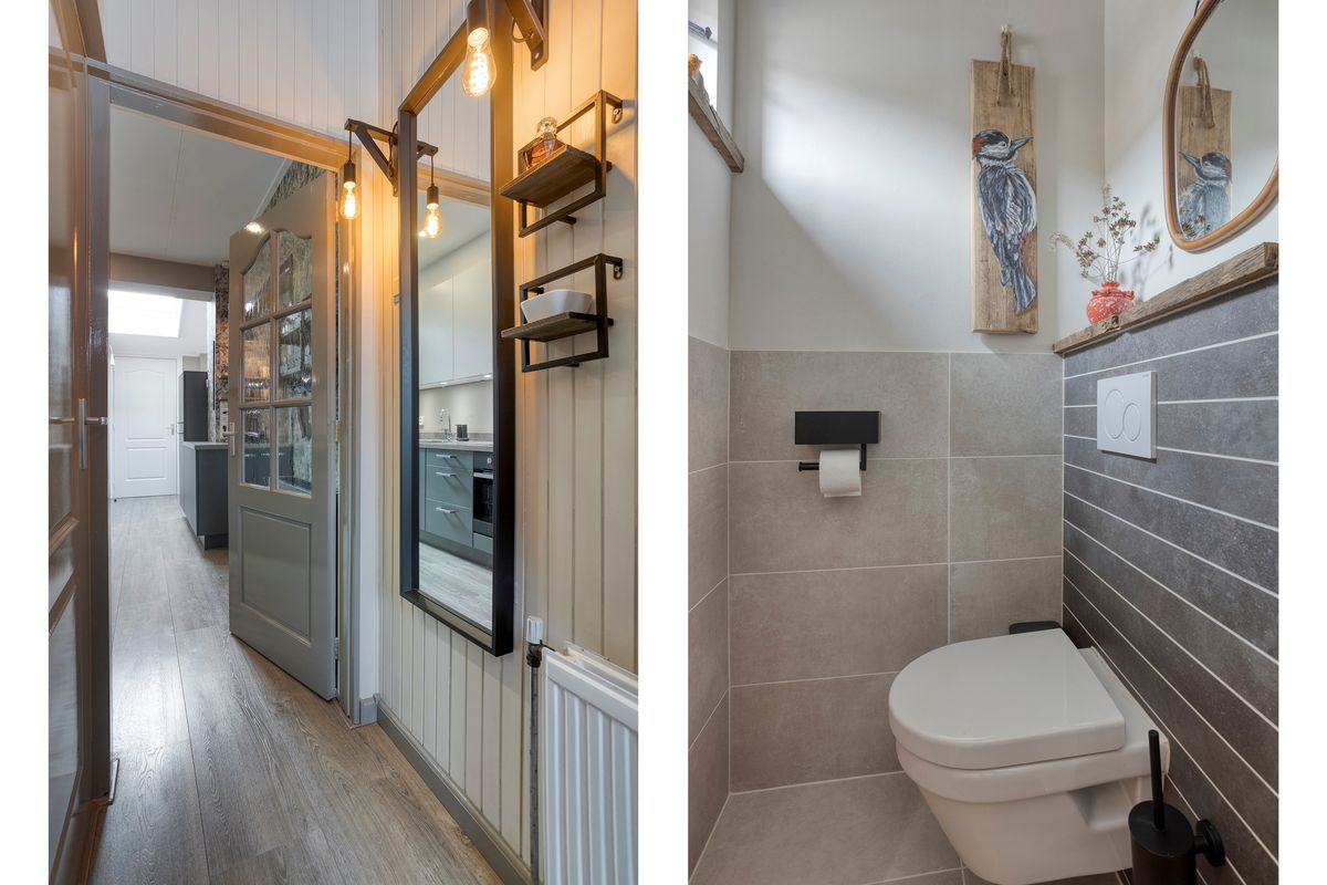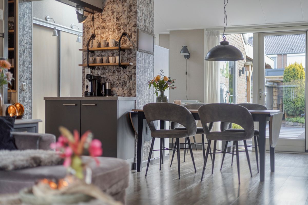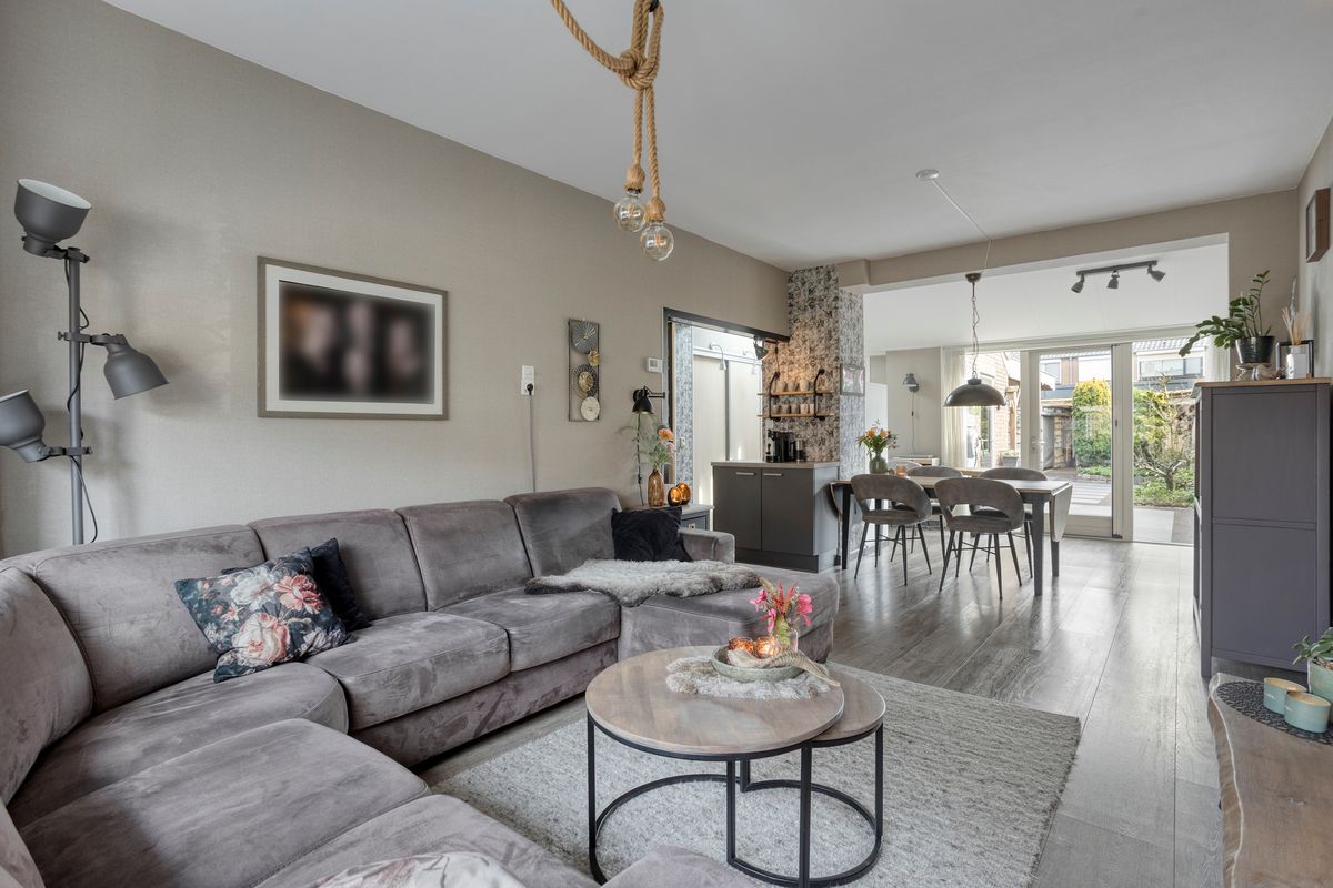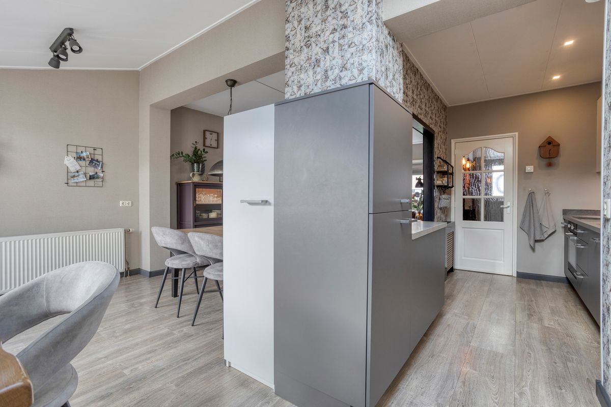 Je komt binnen in de hal met meterkast, trapkast en een vernieuwde toiletruimte met zwevend toilet. Vervolgens stap je de keuken en royale woonkamer in, waar aan de voorzijde een fijn zitgedeelte is gecreëerd. Dankzij de volle breedte-uitbouw aan de achterzijde is er bij de tuinzijde een ruim eetgedeelte ontstaan met zelfs nog genoeg plek voor een extra fauteuil of werkhoek. De terrasdeur, met aan weerszijde ramen tot aan de grond, zorgt voor een prachtige lichtinval én direct zicht op de diepe tuin. Centraal in huis ligt de open keuken met inbouwapparatuur. Ook hierachter loopt de uitbouw door, waardoor er een praktische kastenwand is geplaatst, ideaal voor extra opbergruimte. Het dakraam hierboven brengt extra daglicht naar binnen. Achteraan de woning bevindt zich de ruime bijkeuken met opstelling voor de C.V.-ketel en aansluitingen voor wasmachine en droger.