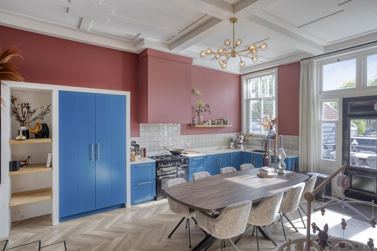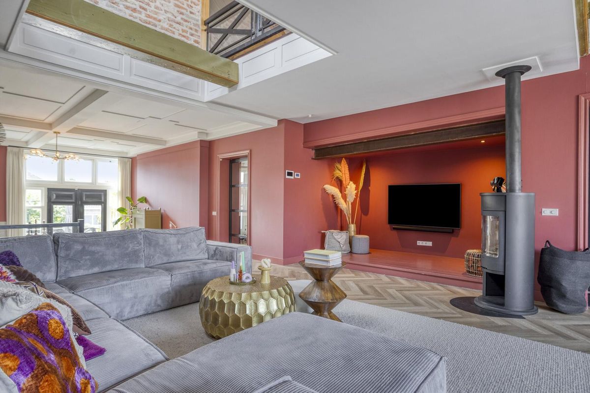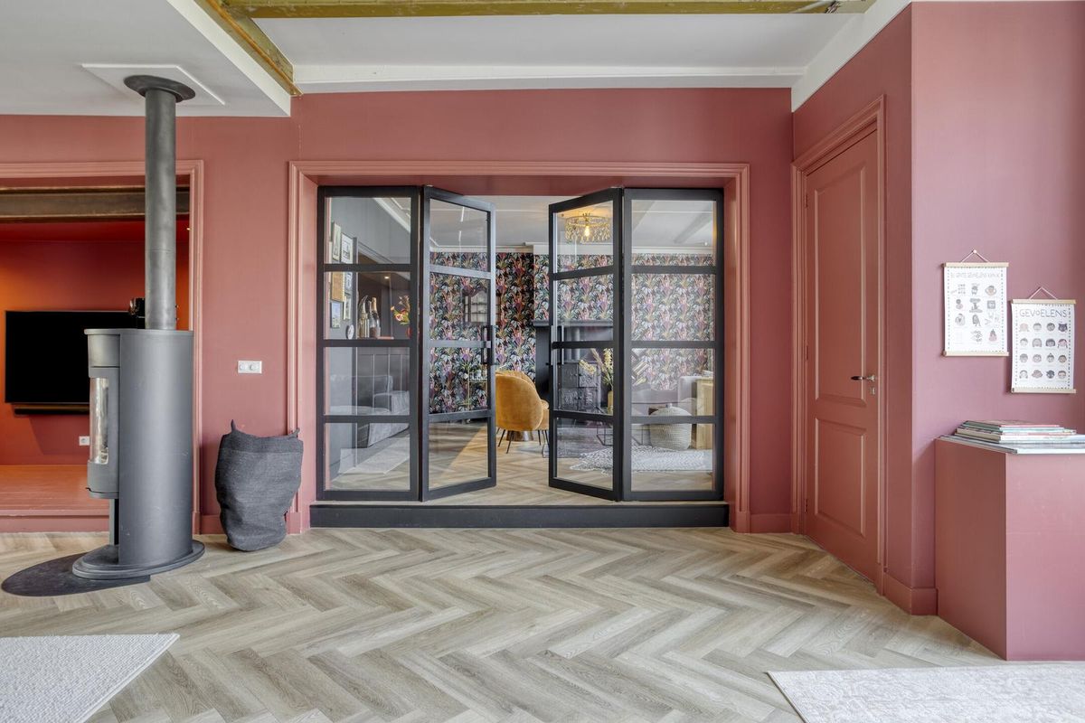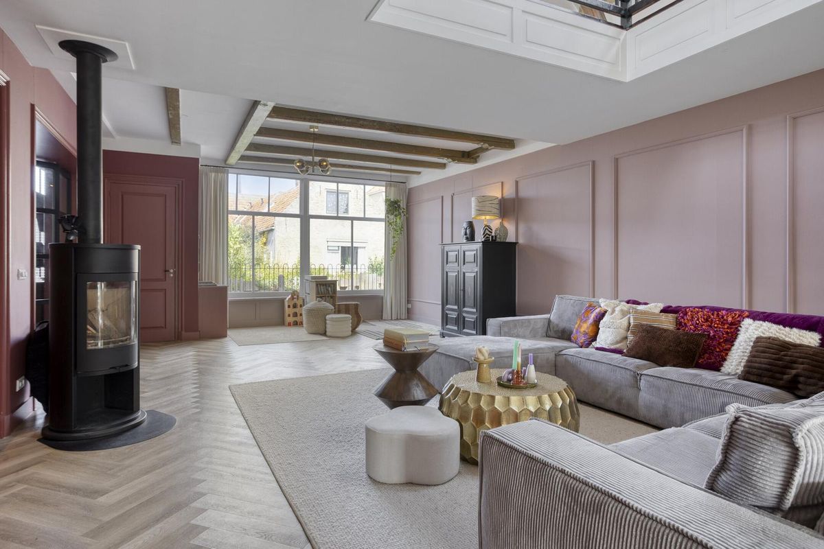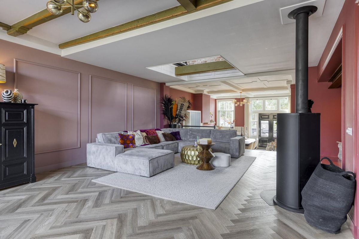 Aan de voorzijde valt direct de stijlvolle, gepleisterde gevel met de originele dakgootbeugels en rode voordeur op. Achter deze voordeur is er een voorportaal met toegang tot de fraaie woonkamer. De woonkamer met grote houtkachel is zeer ruim en mede door de aanwezige vide heel sfeervol. Er is ruim voldoende plaats voor een grote U-bank en de televisie heeft een mooie plek gekregen in de nis. Achterin bevindt zich de iets lager gelegen keuken voorzien van een Quooker, koelkast, oven, magnetron, vaatwasser en 5 pits gasfornuis. Aan de achterzijde zijn er tot slot openslaande deuren naar de fraaie, opnieuw aangelegde achtertuin.