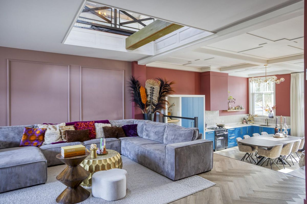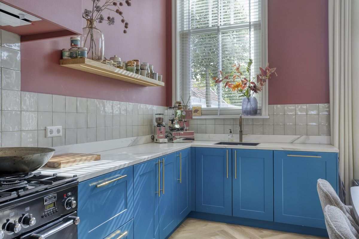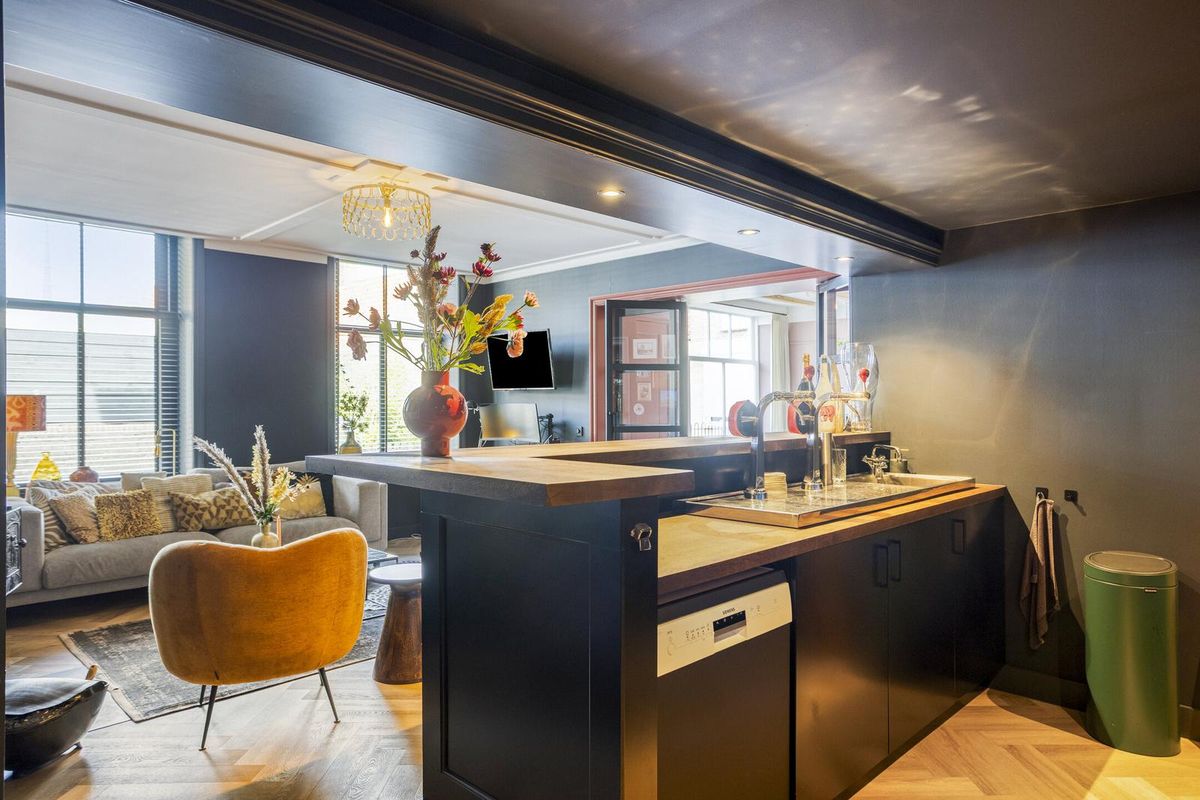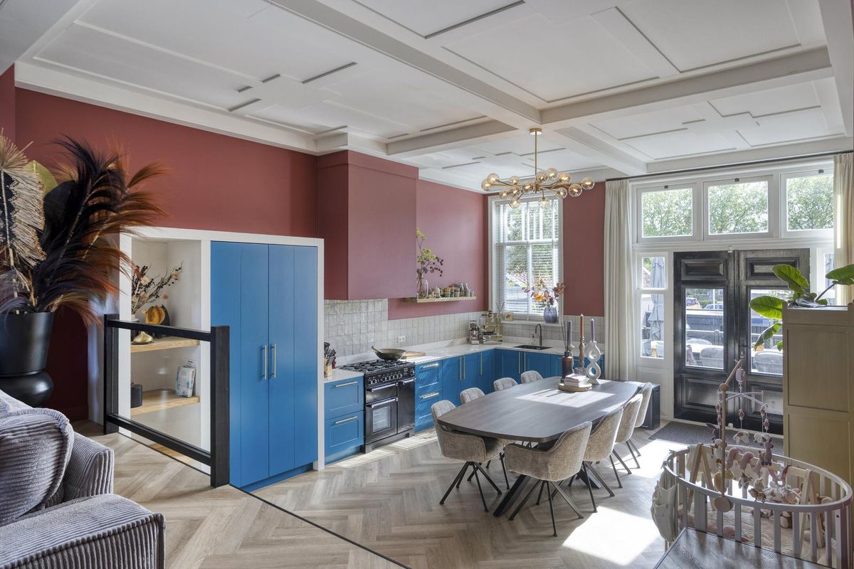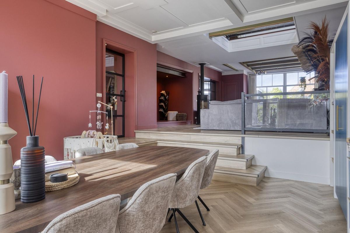 Aan de voorzijde valt direct de stijlvolle, gepleisterde gevel met de originele dakgootbeugels en rode voordeur op. Achter deze voordeur is er een voorportaal met toegang tot de fraaie woonkamer. De woonkamer met grote houtkachel is zeer ruim en mede door de aanwezige vide heel sfeervol. Er is ruim voldoende plaats voor een grote U-bank en de televisie heeft een mooie plek gekregen in de nis. Achterin bevindt zich de iets lager gelegen keuken voorzien van een Quooker, koelkast, oven, magnetron, vaatwasser en 5 pits gasfornuis. Aan de achterzijde zijn er tot slot openslaande deuren naar de fraaie, opnieuw aangelegde achtertuin.
