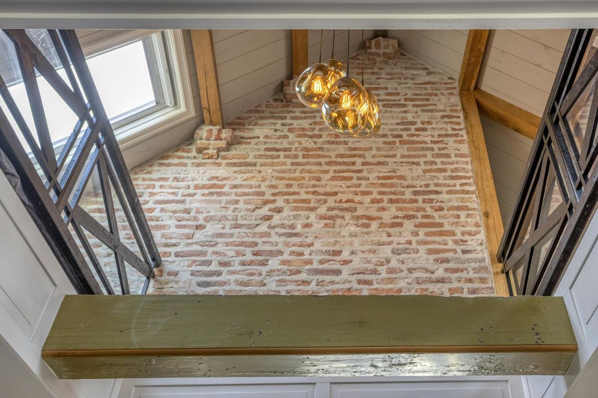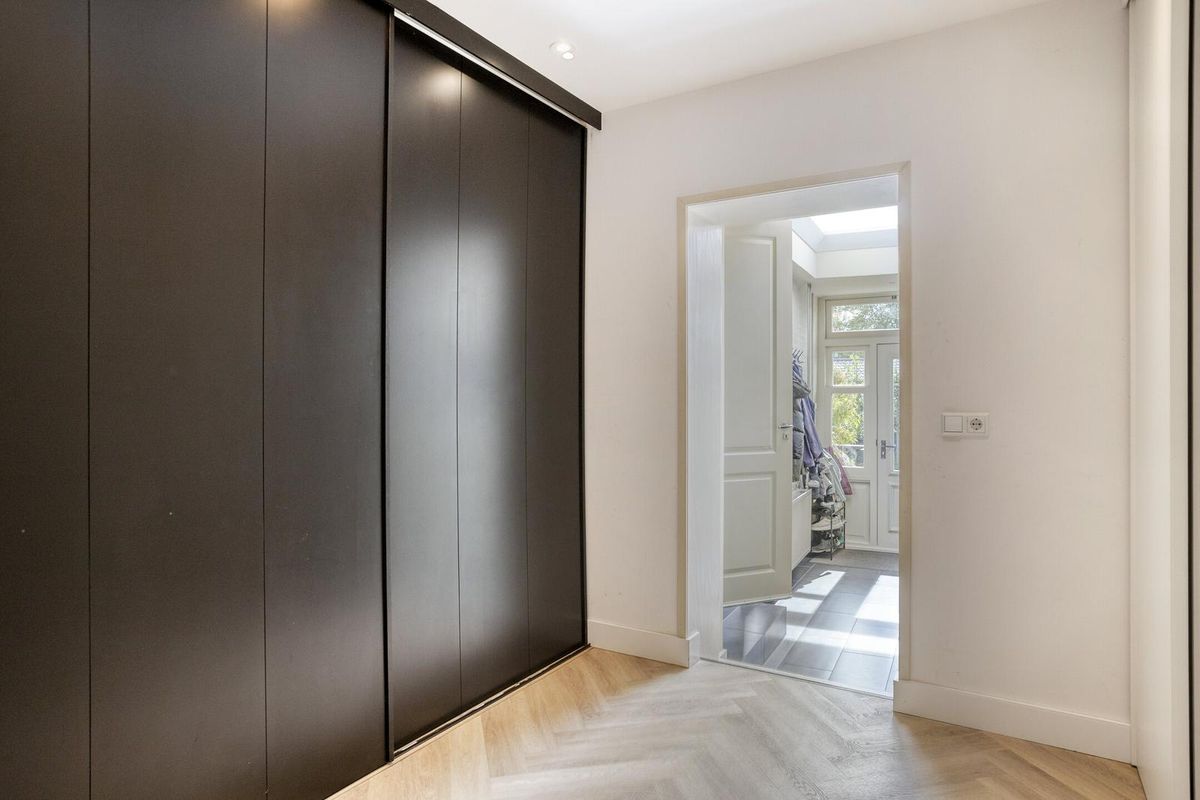 De masterbedroom bevindt zich aan de voorzijde van het huis en heeft een oppervlakte van zo’n 50 m2. Deze kamer heeft een eigen badkamer met inloopdouche, handdoekradiator en wastafelmeubel. De spanten in deze kamer geven het geheel veel sfeer. Door de riante afmetingen van deze ruimte is het goed mogelijk een inloopkast te creëren achter het bed zoals de huidige eigenaren gedaan hebben.