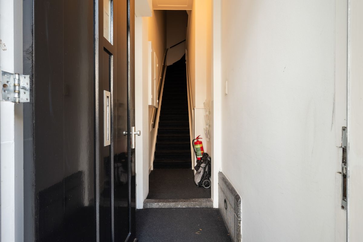 The main entrance is on street level, with stairs leading up to the apartment on the first floor.