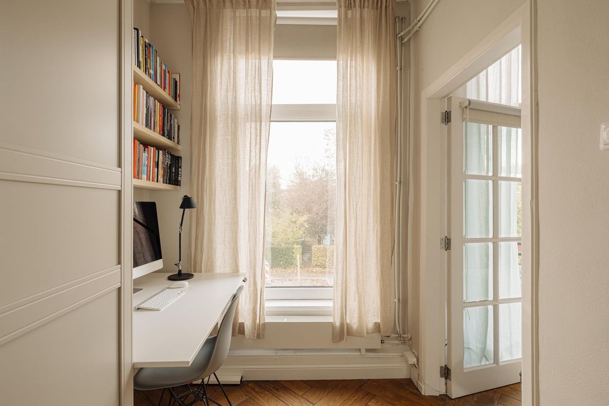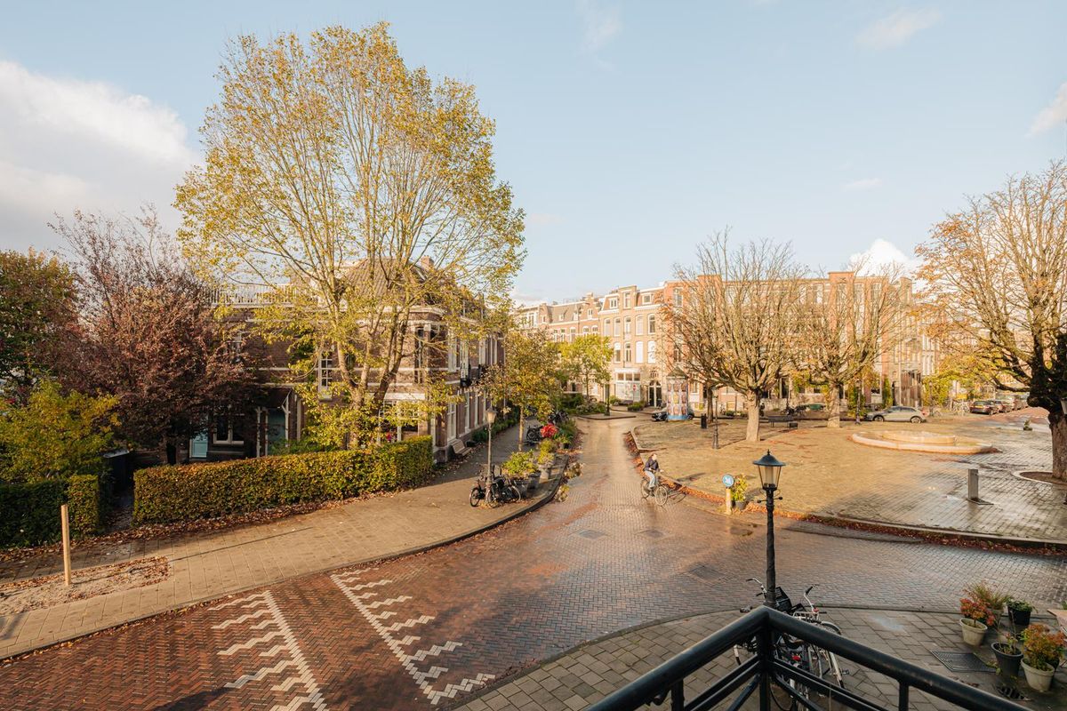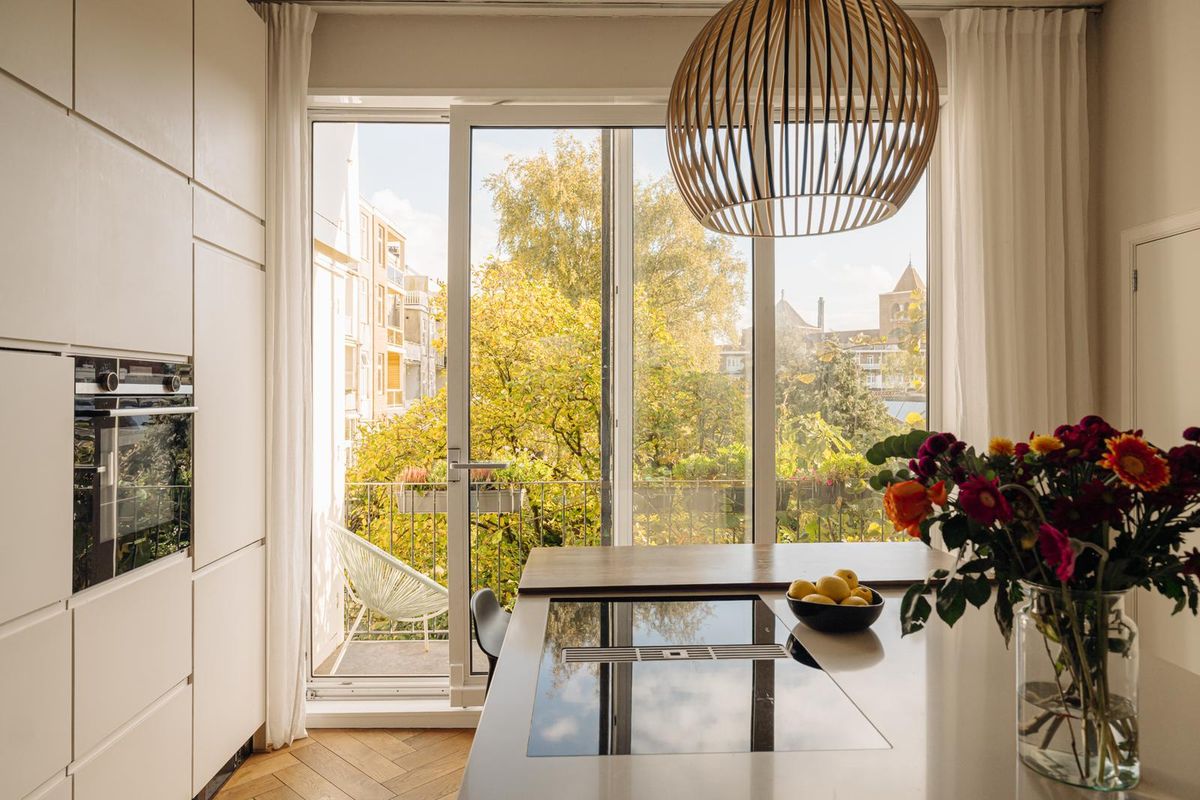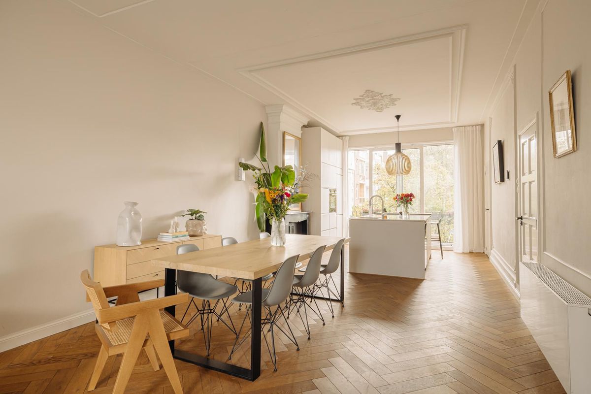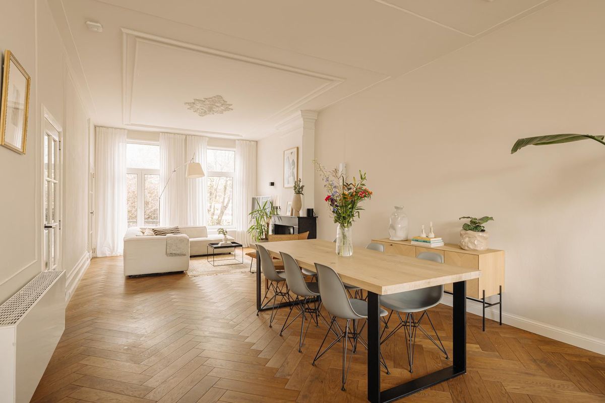 Via het gemeenschappelijke trappenhuis bereik je de entree van de woning op de eerste etage. Je komt binnen in een kleine hal met bergkast en ruimte voor de garderobe. De doorzon woonkamer van ruim 50 m² is bijzonder stijlvol. Originele details, zoals de plafonds met ornamenten en de 2 schouwen, combineren prachtig met de houten visgraatvloer en de moderne keuken met kookeiland. De grote raampartijen en de plafondhoogte van 3,10 meter zorgen voor een heerlijk ruimtelijk en licht gevoel. Via de keuken en slaapkamer heb je toegang tot het ruime balkon aan de achterzijde, gelegen op het zuidoosten. Hier geniet je van een fraai groen uitzicht. Aan de voorzijde geven openslaande deuren vanuit het zitgedeelte toegang tot een kleiner balkon met zicht op het levendige plein, waar in de middag de zon heerlijk naar binnen schijnt.