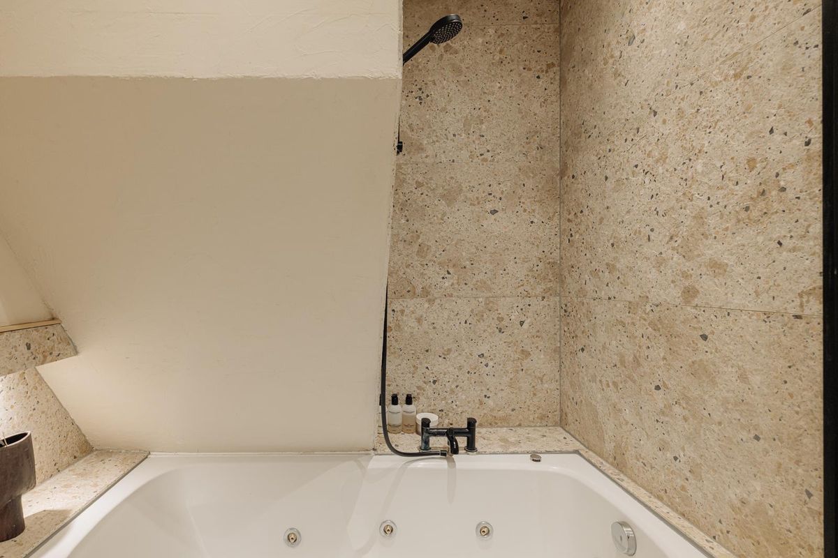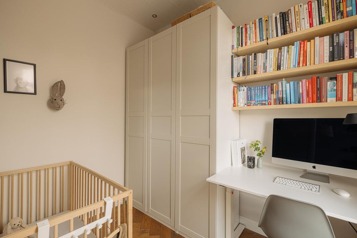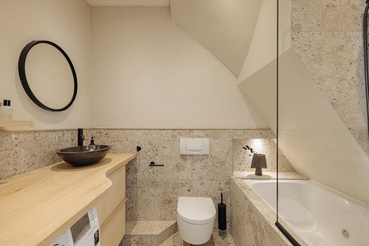 De woning beschikt over twee slaapkamers, verdeeld over de voor- en achterzijde. De badkamer ligt centraal en is in 2022 volledig gerenoveerd, voorzien van terrazzo tegels en een op maat gemaakt badkamermeubel.