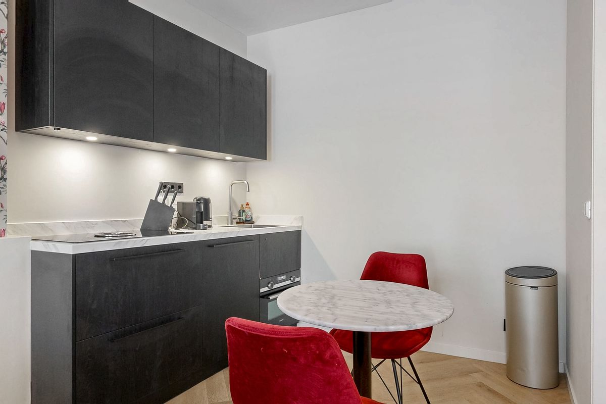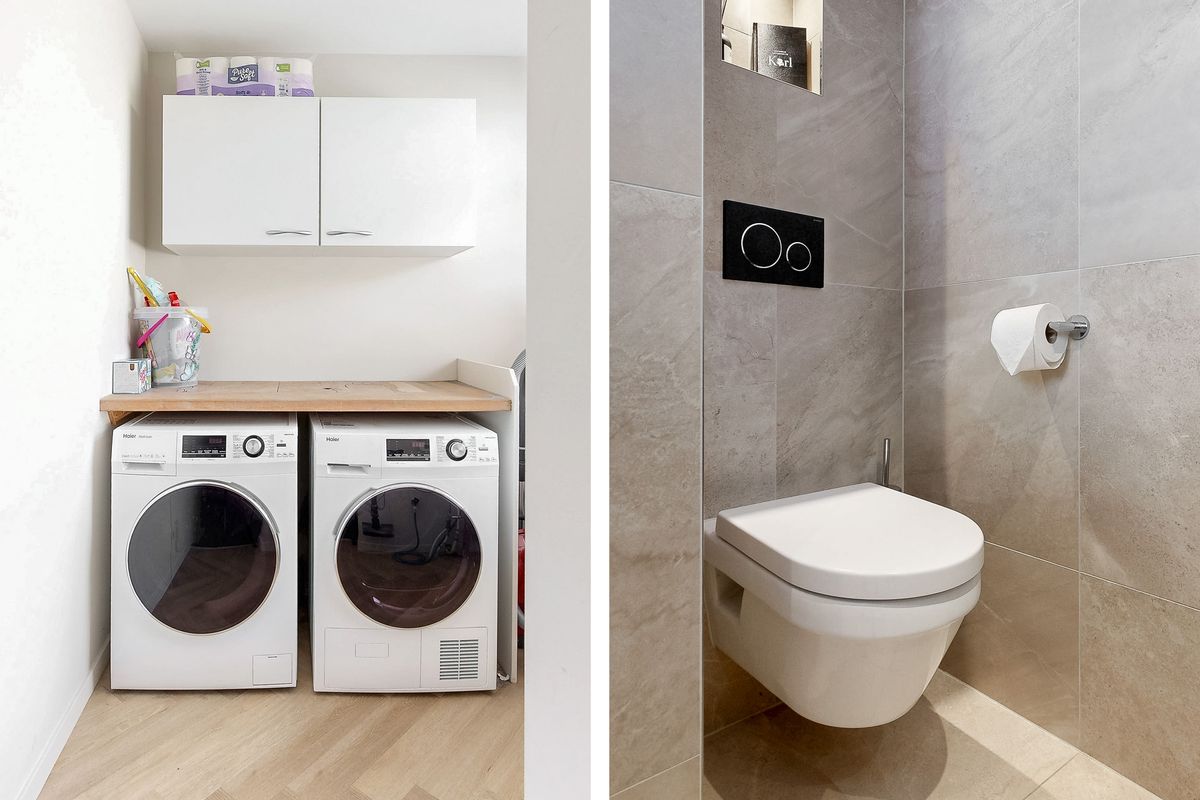 De open keuken is modern en van alle gemakken voorzien met diverse inbouwapparatuur, zoals een inductiekookplaat met afzuigsysteem, koelkast en combi-oven. De nette badkamer is strak afgewerkt en beschikt over een inloopdouche, toilet en wastafel, met eigentijdse materialen.