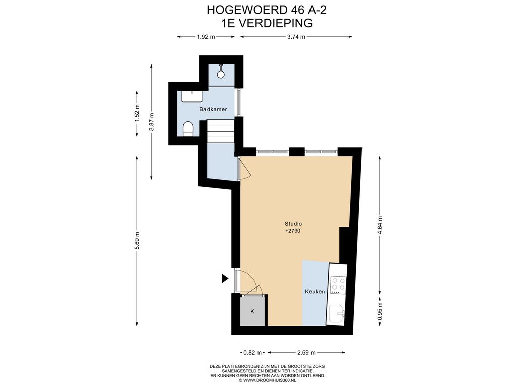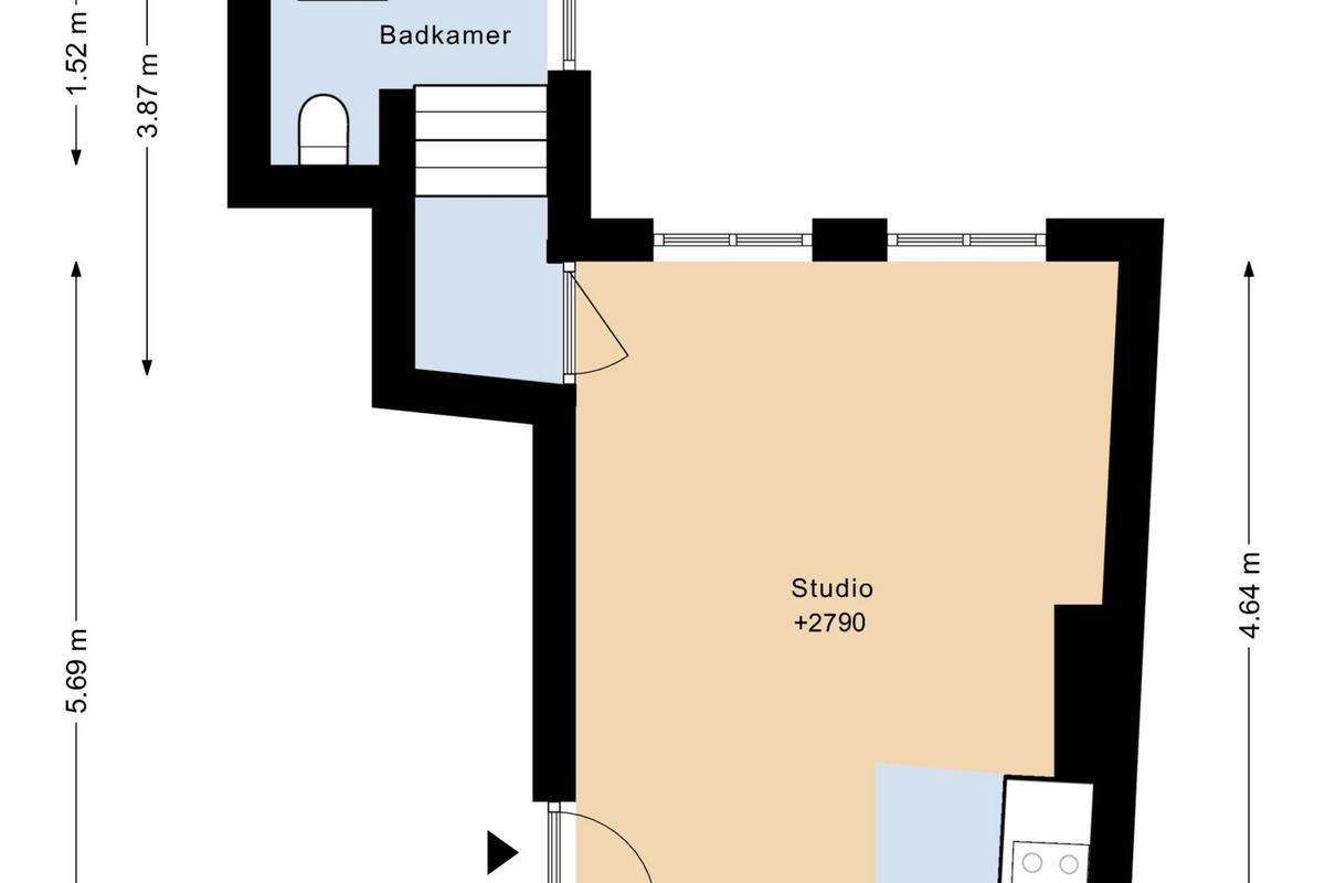 De studio is gelegen aan de achterzijde van het pand op de eerste verdieping, wat zorgt voor extra rust en privacy. De woon-/slaapruimte is praktisch ingericht, voorzien van een nette PVC-vloer die het geheel een luxe uitstraling geeft. Er is voldoende ruimte voor een zithoek, slaapgedeelte en een eettafel.