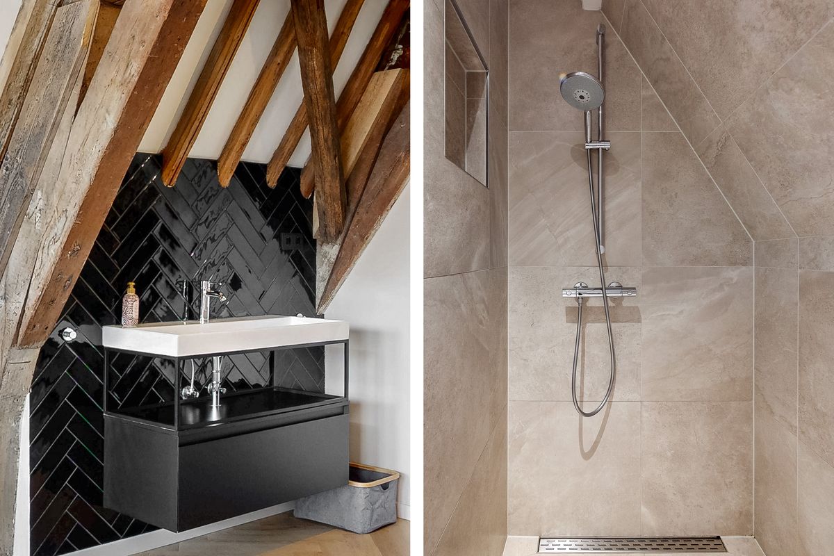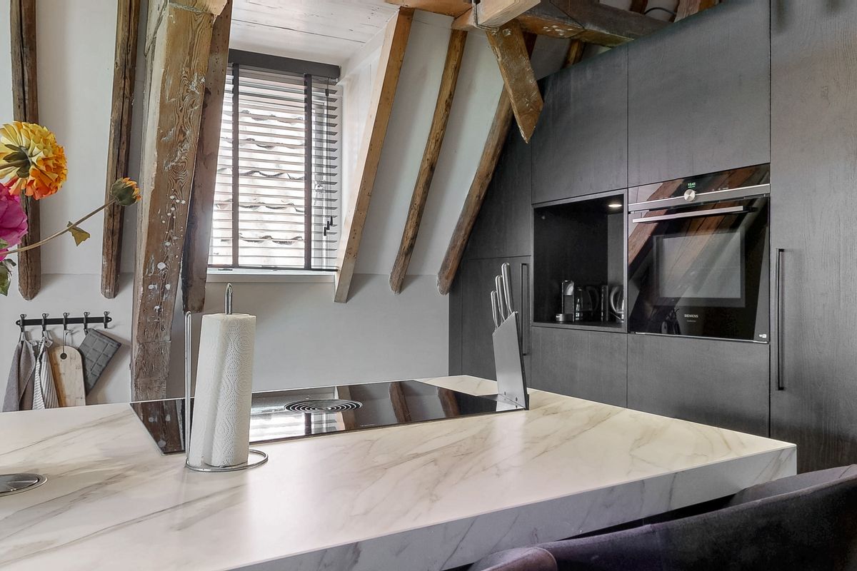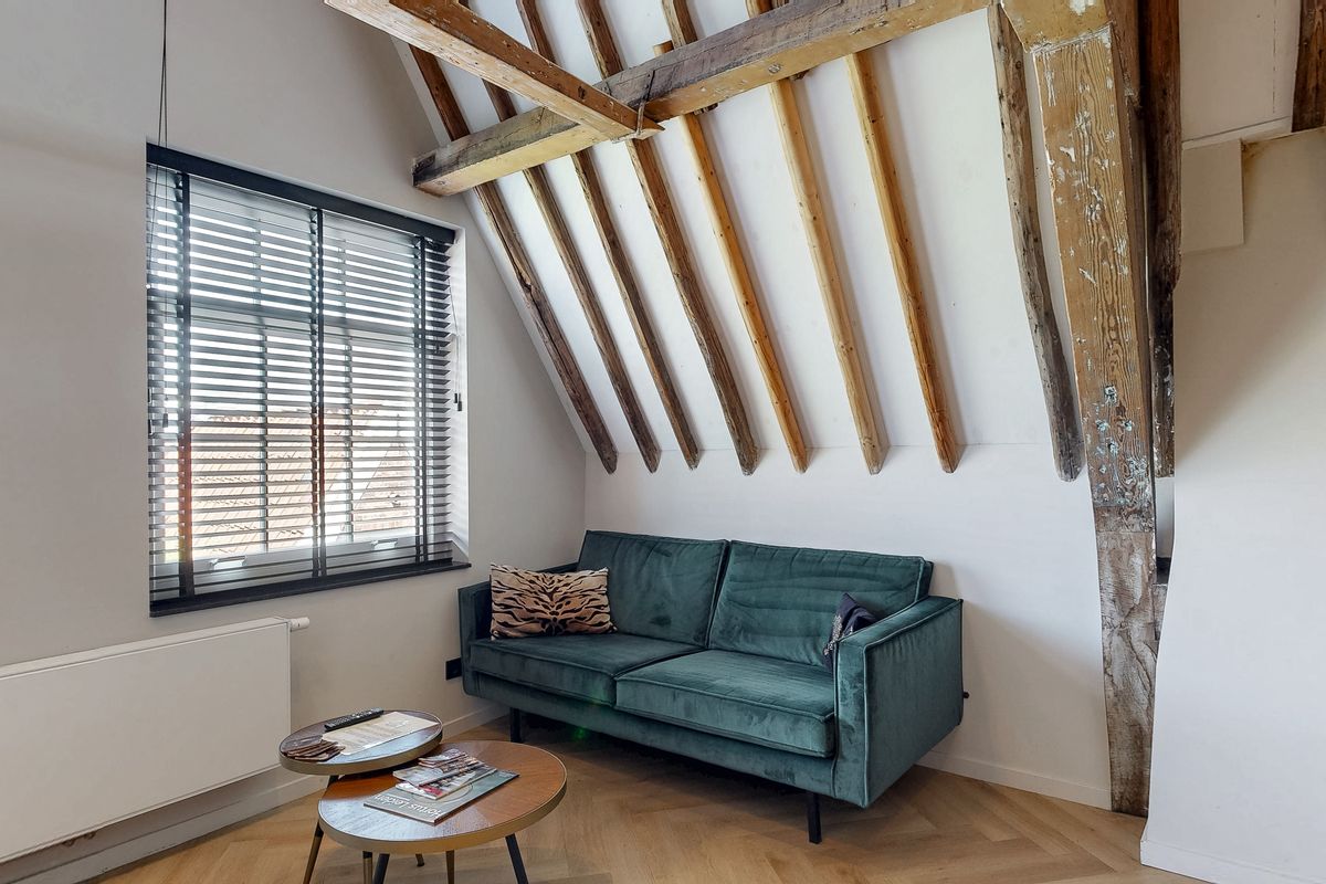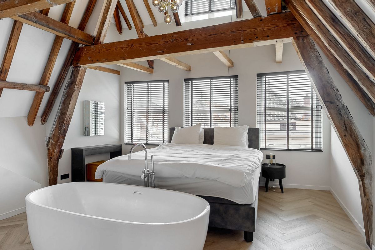 De slaapkamer is ruim en verrassend ingedeeld, met een losstaand bad en wastafel in de kamer zelf – een luxe en speelse touch die het appartement een exclusief karakter geeft. De kapconstructie is volledig in het zicht gebracht, wat zorgt voor een indrukwekkende, loftachtige sfeer. Daarnaast beschikt de woning over een moderne badkamer met een inloopdouche en toilet. Alles is afgewerkt met oog voor detail, en dat merk je in de gebruikte materialen en de strakke afwerking.