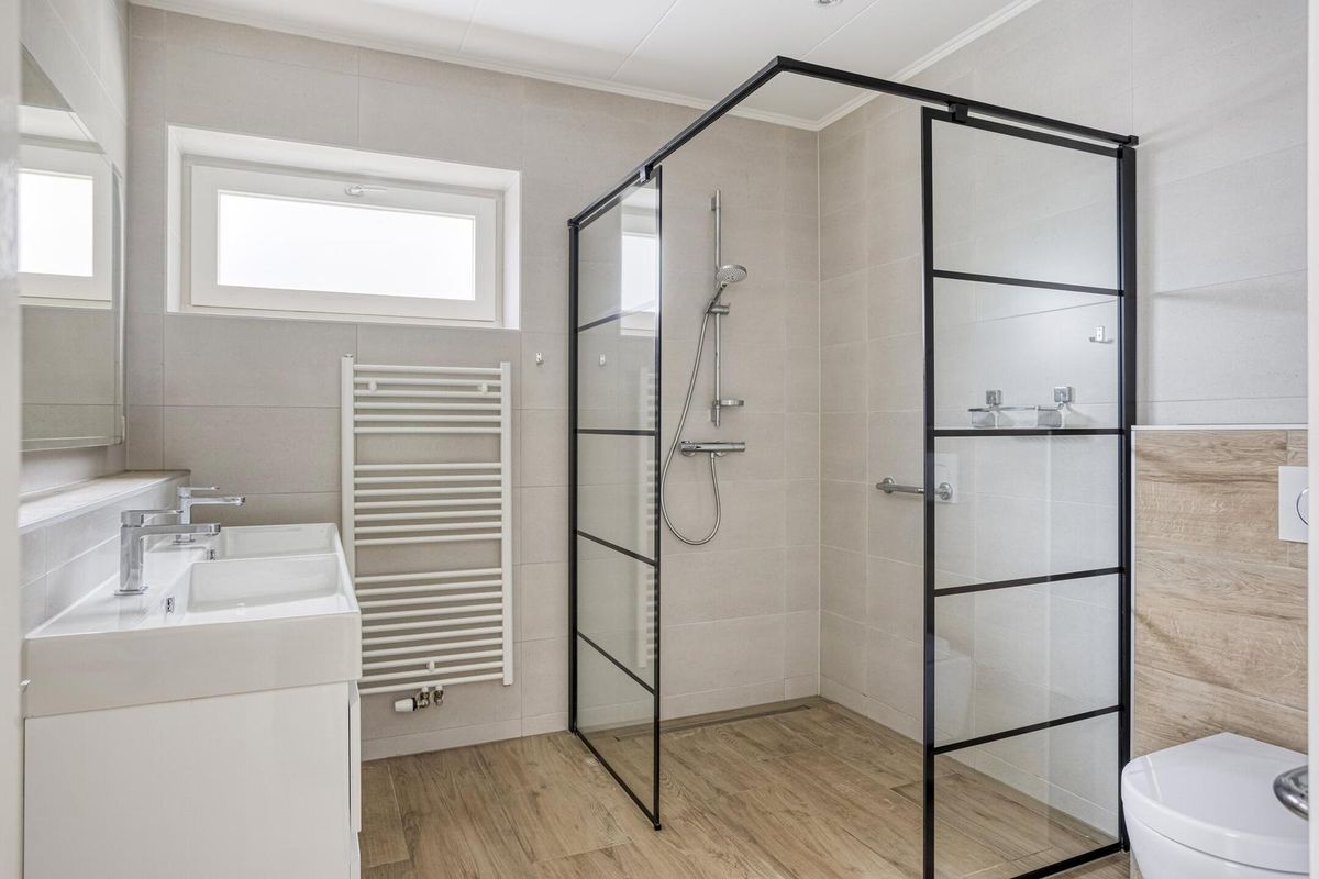 Op de etage zijn er nog eens drie zeer ruime slaapkamers en een tweede badkamer en een separaat toilet gesitueerd. De badkamer is uitgerust met een wastafelmeubel, grote inloopdouche, toilet, handdoekradiator en een whirlpool bad. De etage is net als de begane grond ook hoogwaardig en stijlvol afgewerkt met een fraaie laminaatvloer, gestuukte wanden en houten details van de constructie in het zicht.