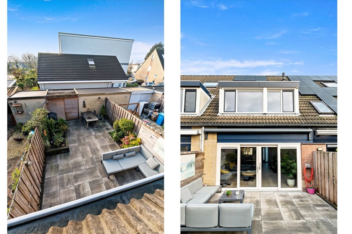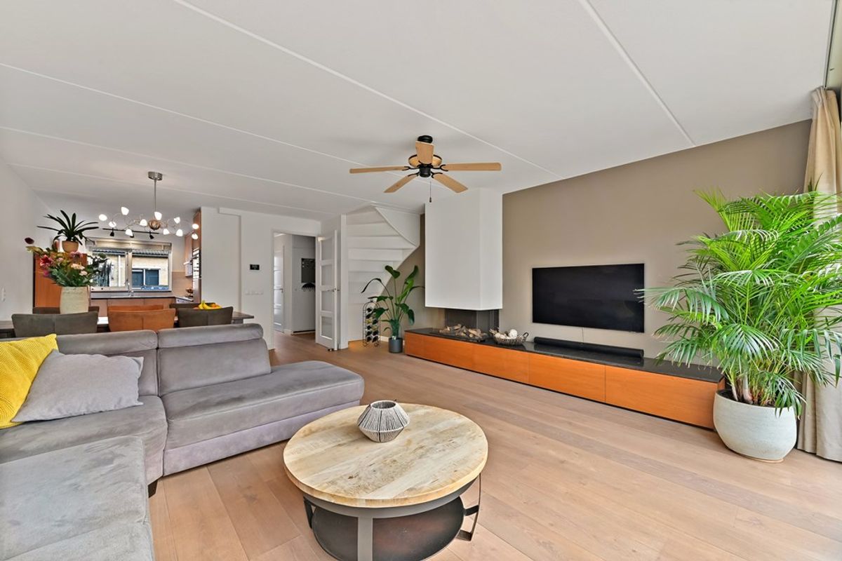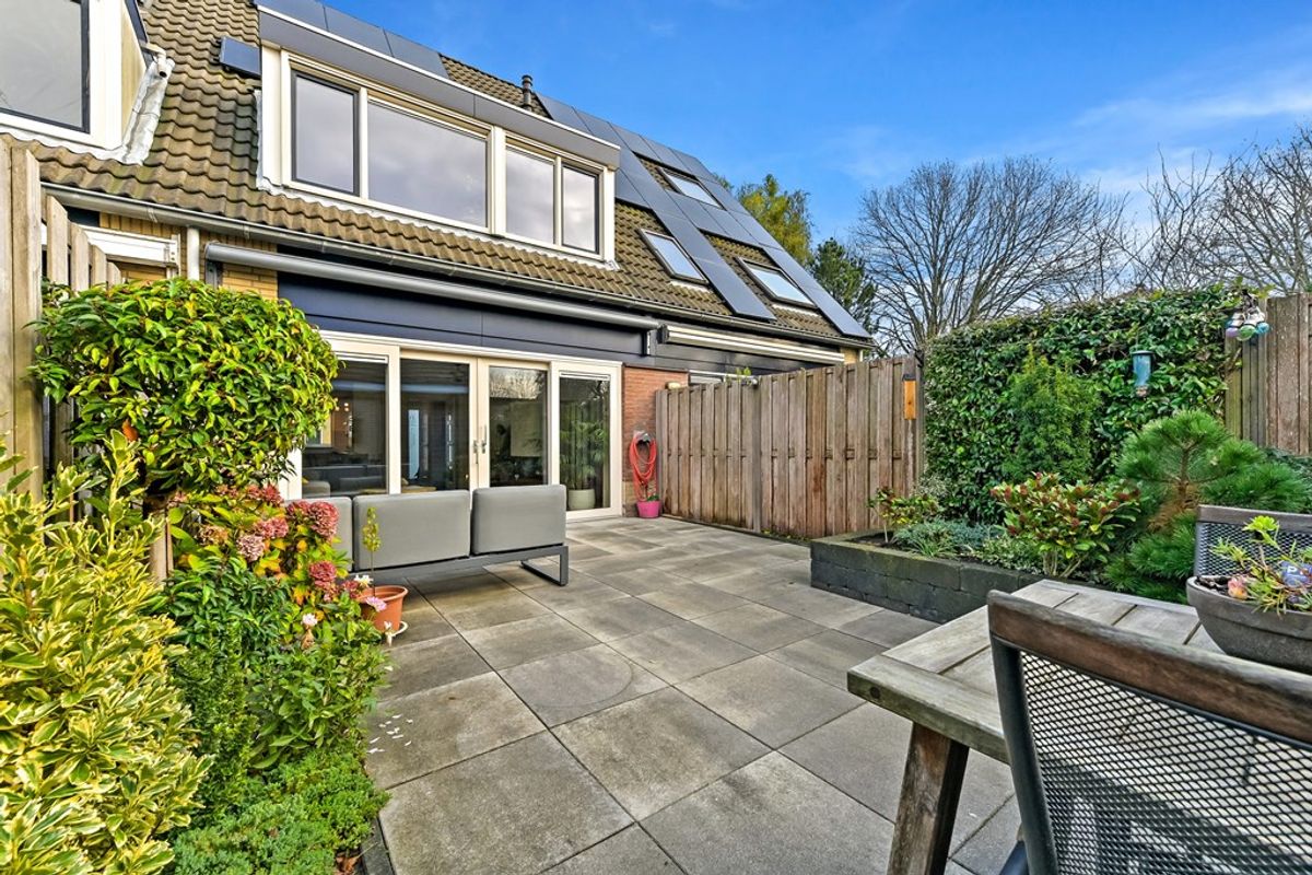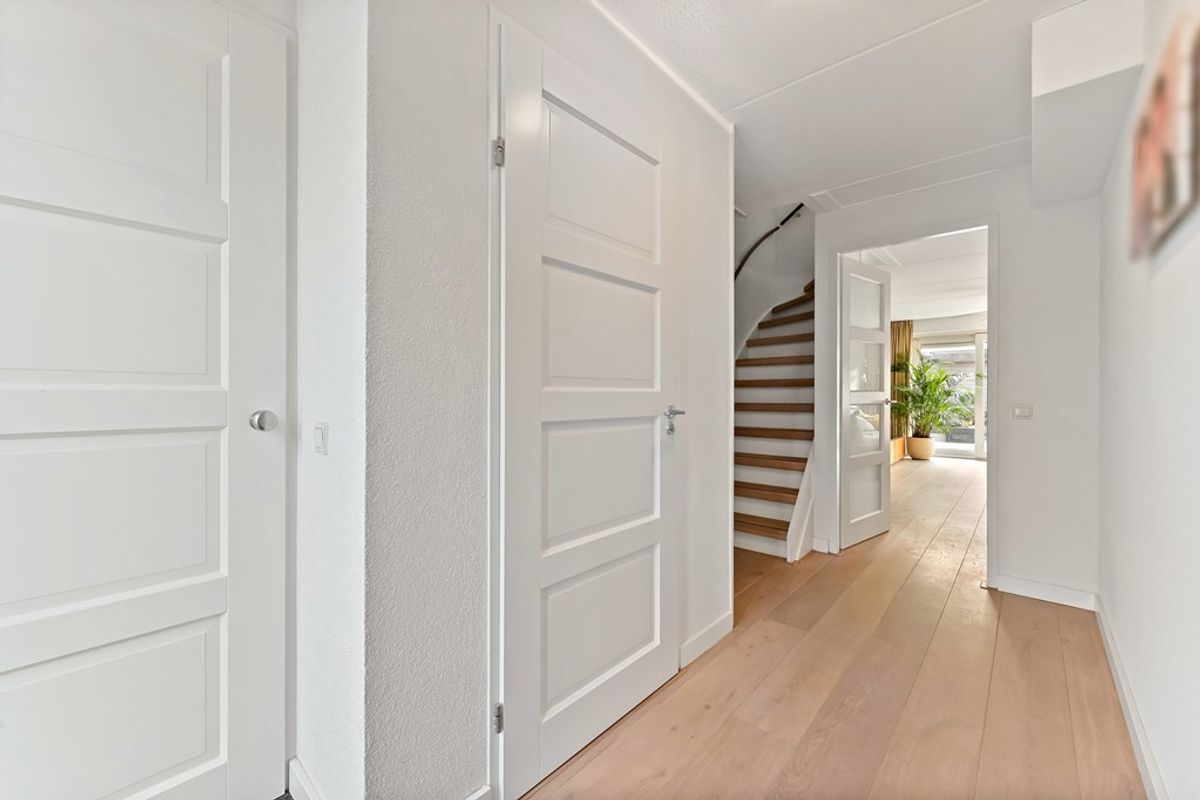 Via de voortuin met eigen oprit en buitenkraan bereikt u de entree van de woning. In de ruime hal vindt u de meterkast, trapopgang naar de eerste verdieping en een bergkast met de verdeler van de vloerverwarming. De toiletruimte is voorzien van wandcloset en fonteintje. Vanuit de hal bereikt u de tuingerichte woonkamer met dubbele schuifpui naar de zonnige achtertuin op het zuidwesten. De woonkamer is sfeervol ingericht en voorzien van een wandmeubel met gashaard, welke in de woning achterblijft. De eethoek grenst aan de keuken welke aan de voorzijde van de woning te vinden is. De keuken in L-opstelling is ruim van formaat en voorzien van diverse inbouwapparatuur, waaronder een 5 pits gaskookplaat, RVS afzuigkap, koelkast met vriesvak, combi-magnetron en vaatwasser. Ook is er een 10 liter boiler aanwezig waardoor u snel beschikt over warm water. Op de begane grond is een houten lamel vloer aanwezig welke indien gewenst nog meerdere keren kan worden opgeschuurd. De zonnige tuin is verzorgd aangelegd en gelegen op het zuidwesten, deze is bereikbaar vanuit de woning en via het achterom waar tevens plek is voor het stallen van de afvalcontainers. In de achtertuin is een stenen berging aanwezig en aangrenzende overkapping; perfect voor bijvoorbeeld het stallen van de fietsen. Aan de achtergevel is een elektrisch bedienbaar zonnescherm en buitenkraan gemonteerd.