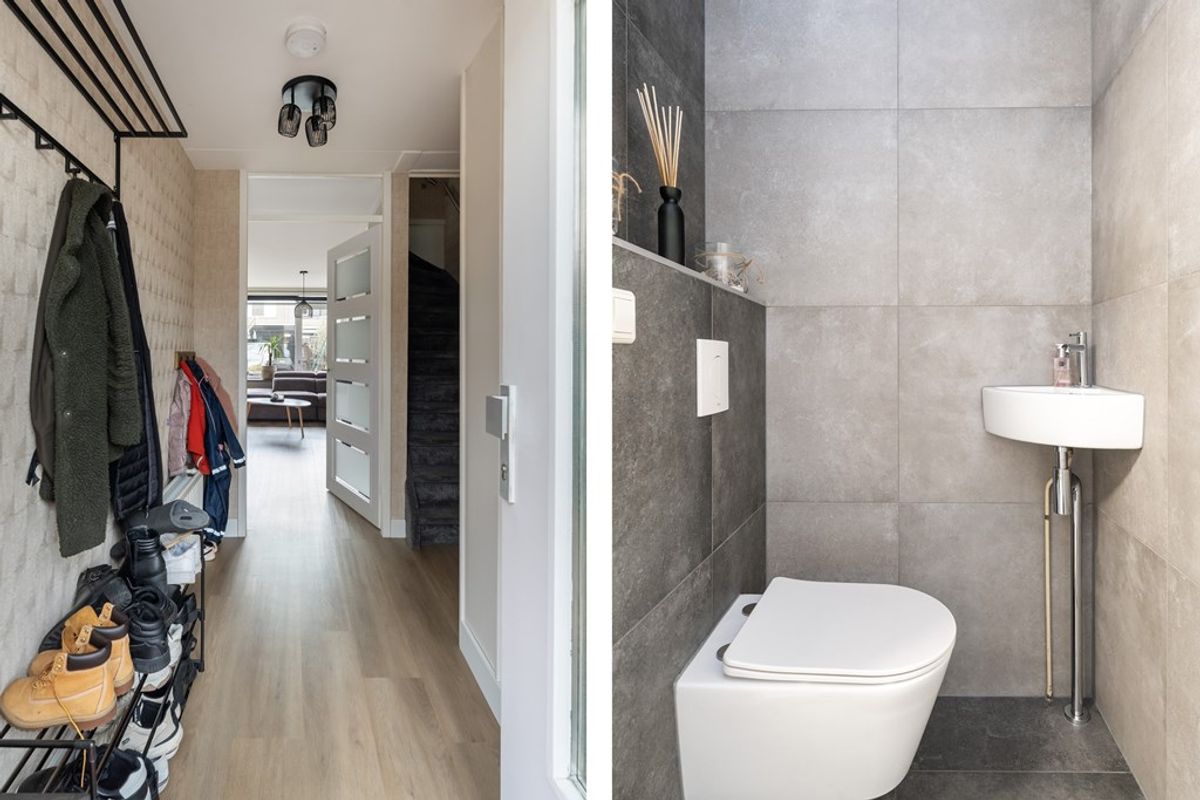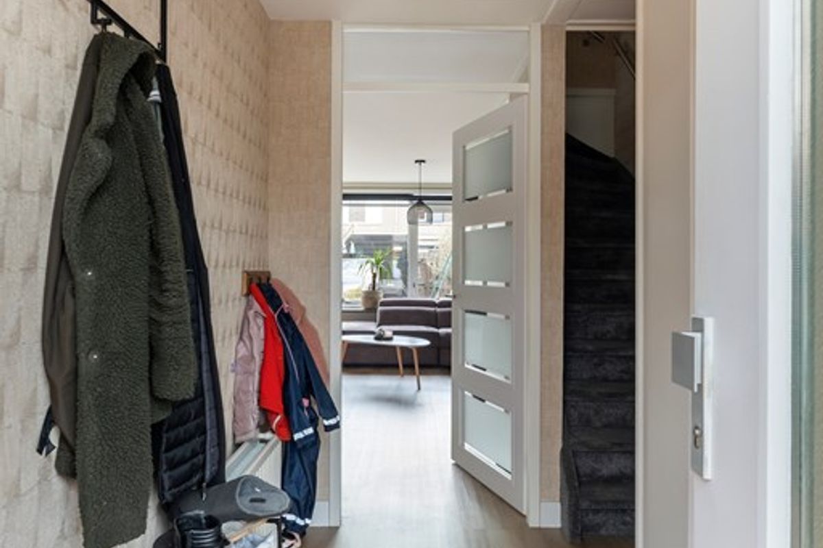 Via de entree komt u in de hal met modern toilet (2021) met fonteintje, garderoberuimte, uitgebreide meterkast en de trapopgang naar de eerste verdieping.