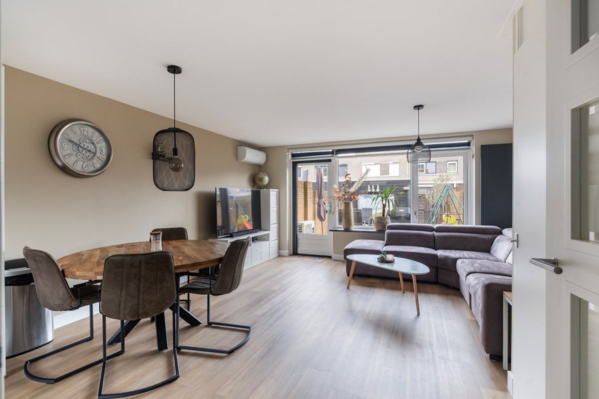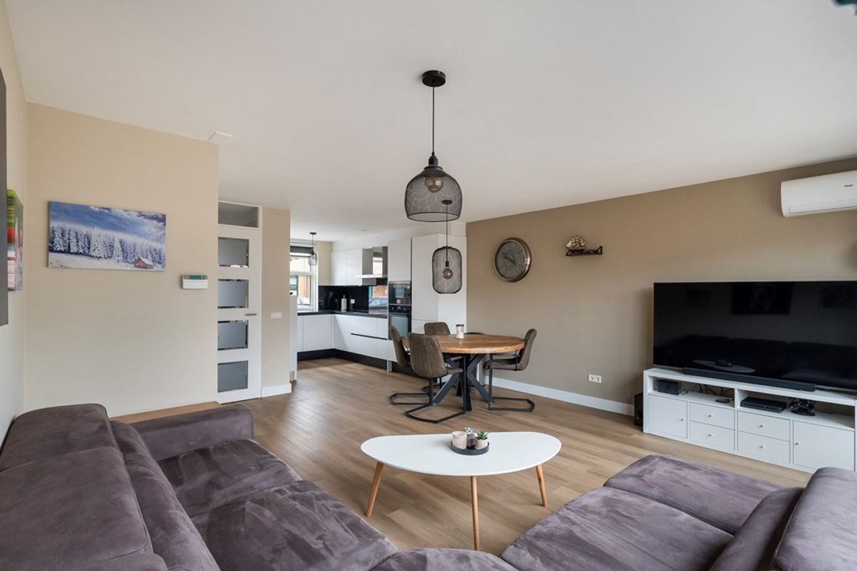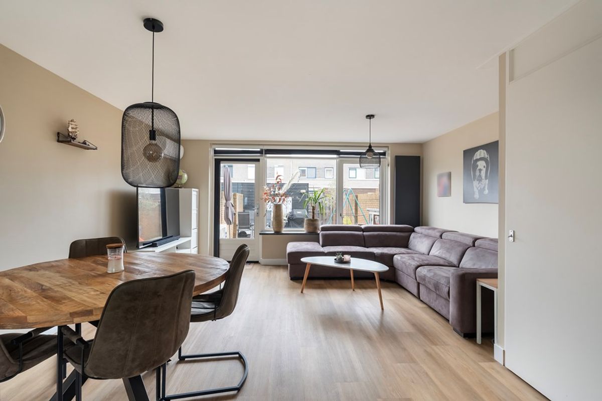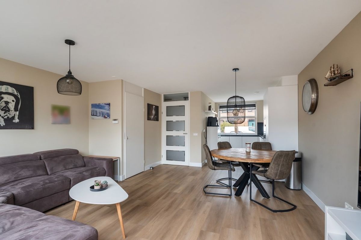 De ruime en lichte woonkamer is gesitueerd aan de achterzijde van de woning en kijkt uit op de achtertuin. Dankzij de grote raampartijen is er veel daglicht aanwezig. De gehele begane grond is voorzien van een strakke pvc vloer met comfortabele vloerverwarming. In de praktische trapkast bevindt zich de bediening van de vloerverwarming.