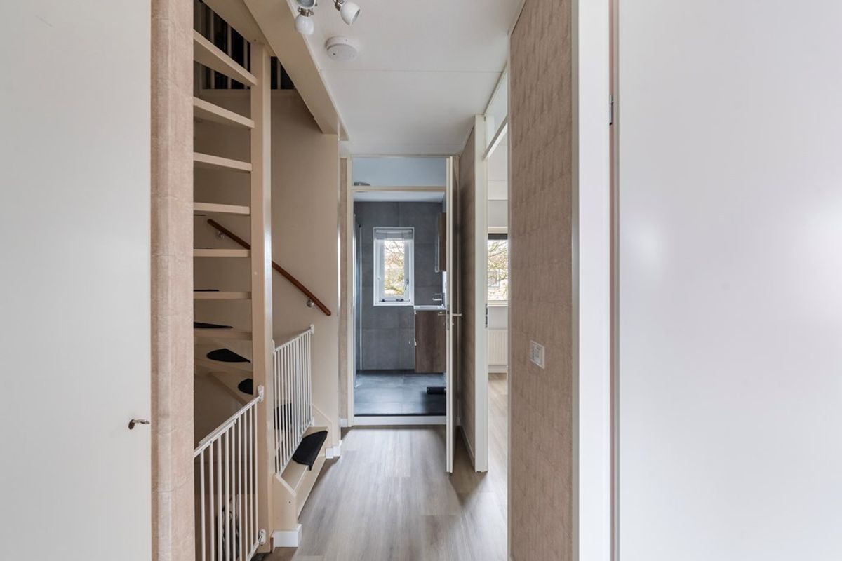 Overloop met vaste kast en toegang tot drie slaapkamers en de badkamer. De badkamer is in 2021 volledig gemoderniseerd en heeft een frisse en moderne uitstraling. De badkamer beschikt over: