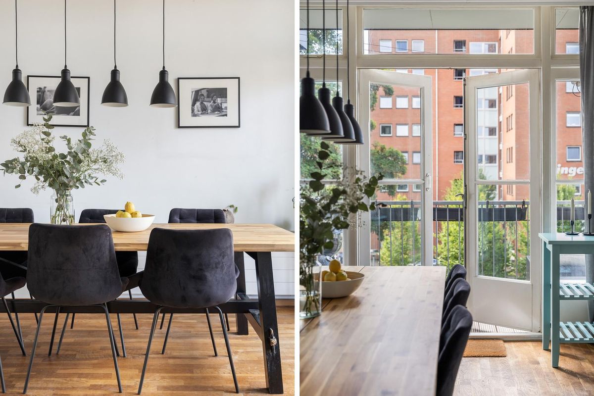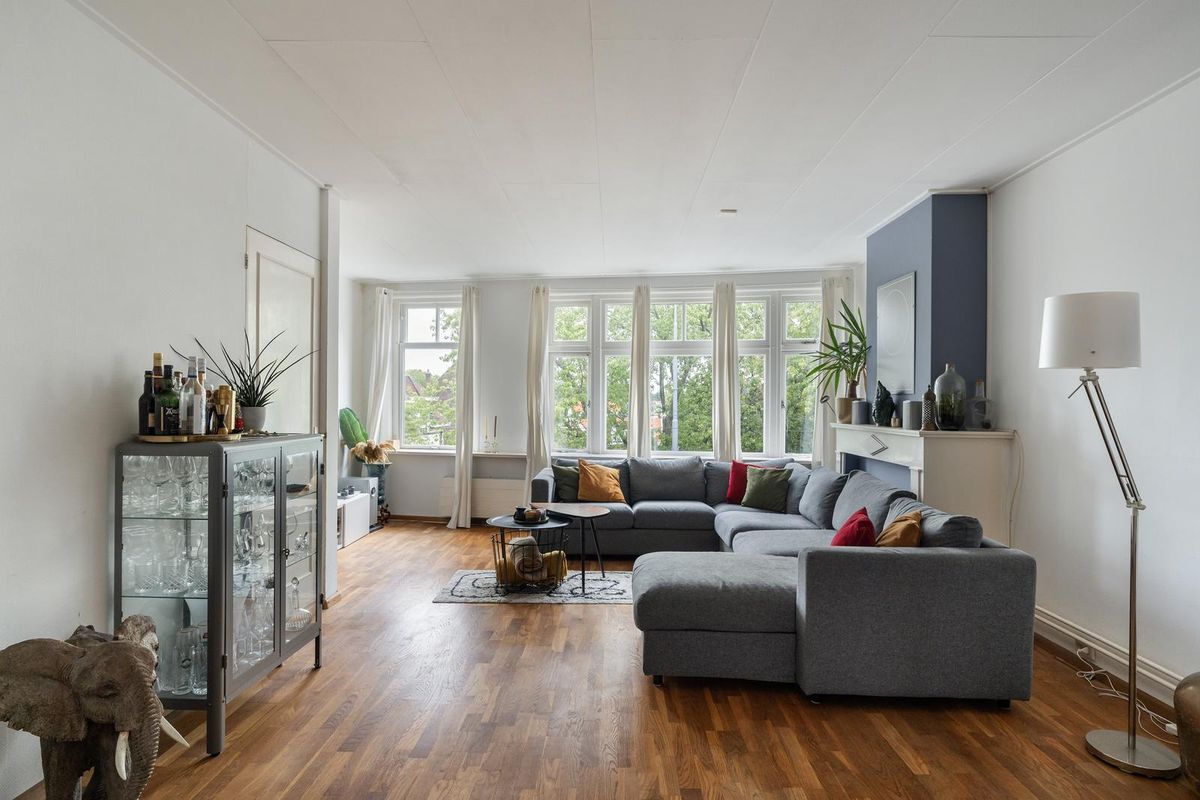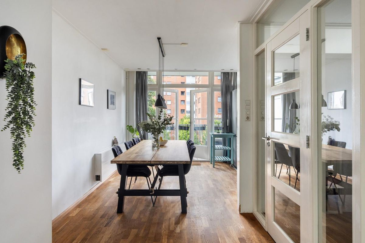 Hier vindt je de hal en toiletruimte, waarna je binnenstapt in de royale woonkamer. De hoge plafonds, grote raampartijen en de authentieke schouw geven de ruimte een elegante uitstraling, terwijl de laminaatvloer voor een warme basis zorgt. Het eetgedeelte sluit hier prachtig op aan en biedt via openslaande deuren toegang tot een zonnig balkon.