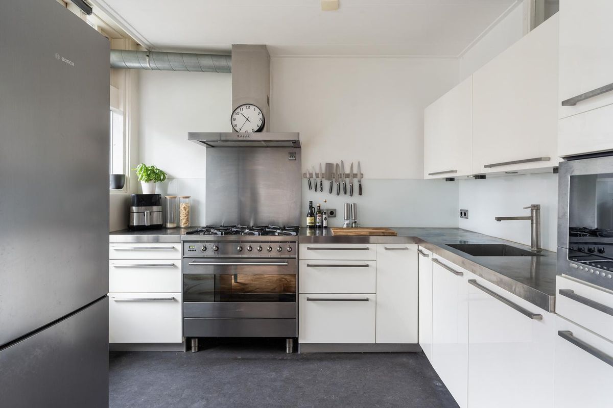 De open keuken is stijlvol en stoer uitgevoerd met wit hoogglans fronten, RVS werkbladen en glazen achterwanden. Het brede fornuis met zes pitten en oven vormt het hart van de keuken, aangevuld met een RVS achterwand, afzuigkap en inbouwapparatuur zoals een magnetron, koelkast en vaatwasser. Met volop kastruimte en een deur naar het royale terras is dit een keuken die net zo praktisch als indrukwekkend is.