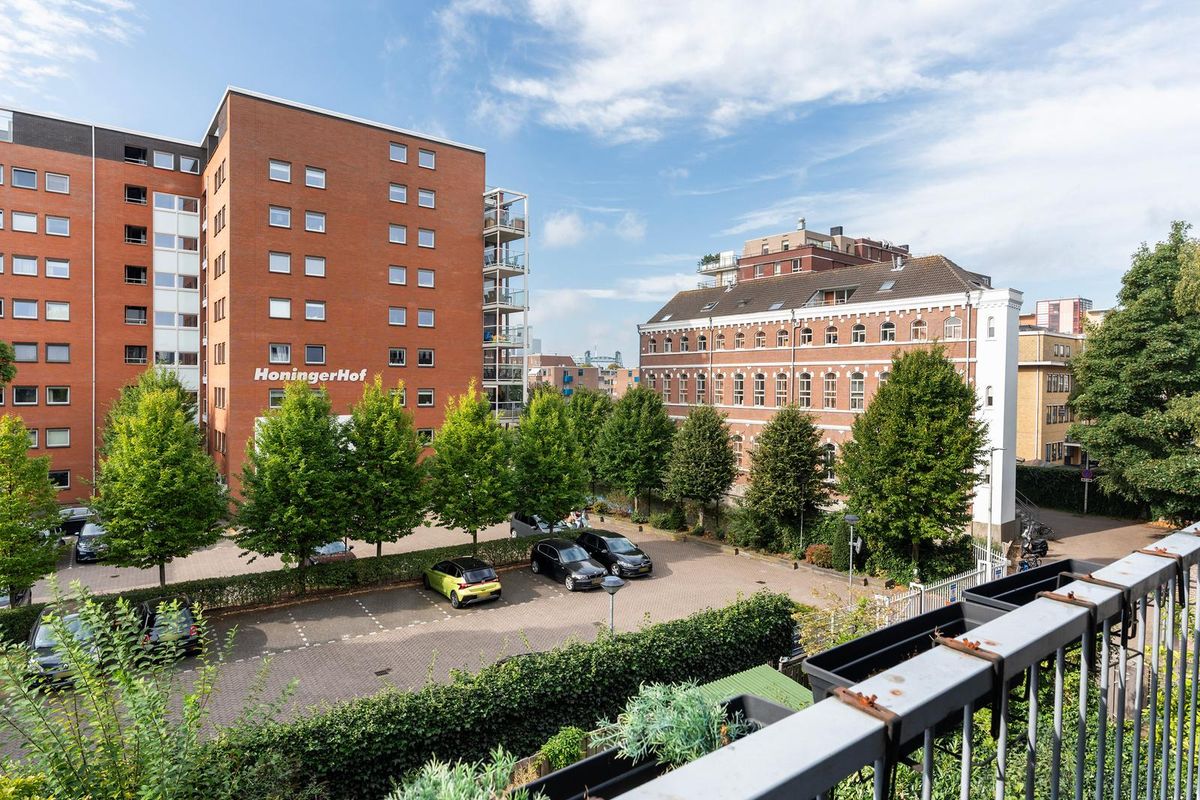 Vanaf het terras kijk je uit over het Honingerhof en kun je zelfs “De Hefbrug” zien: een heerlijk rustige plek midden in de stad.