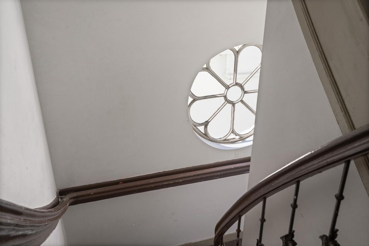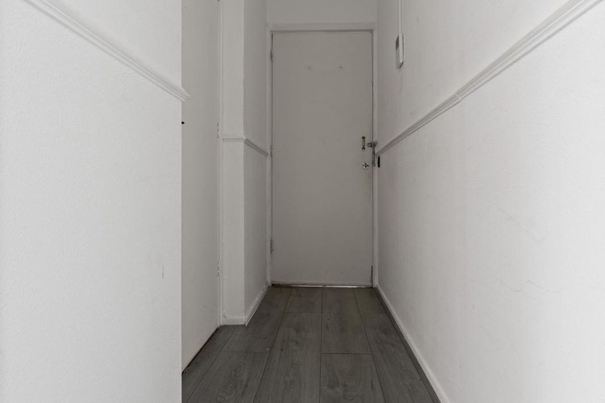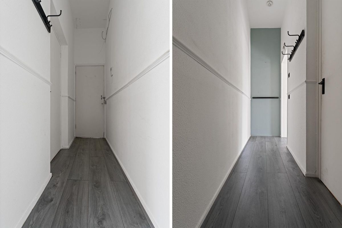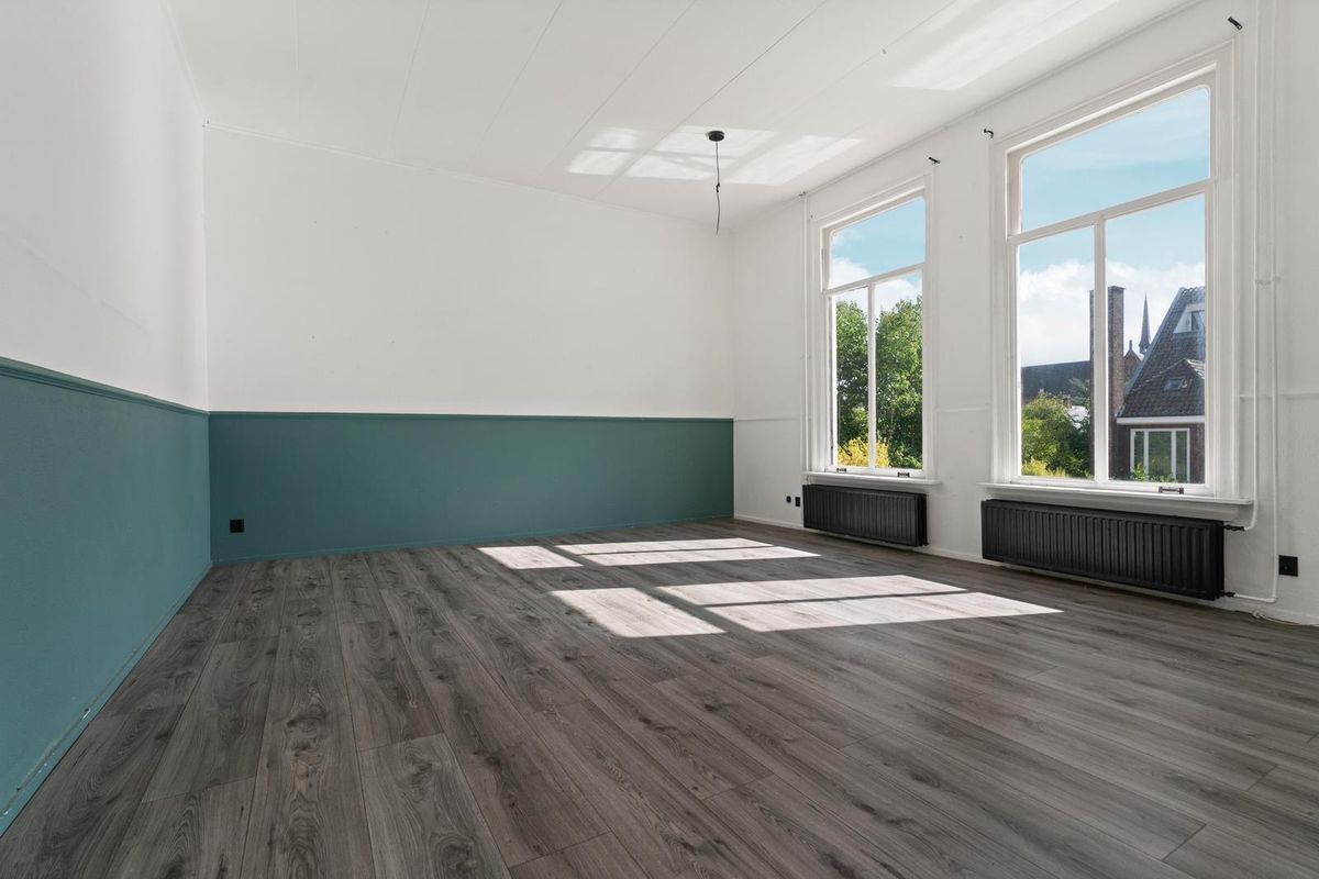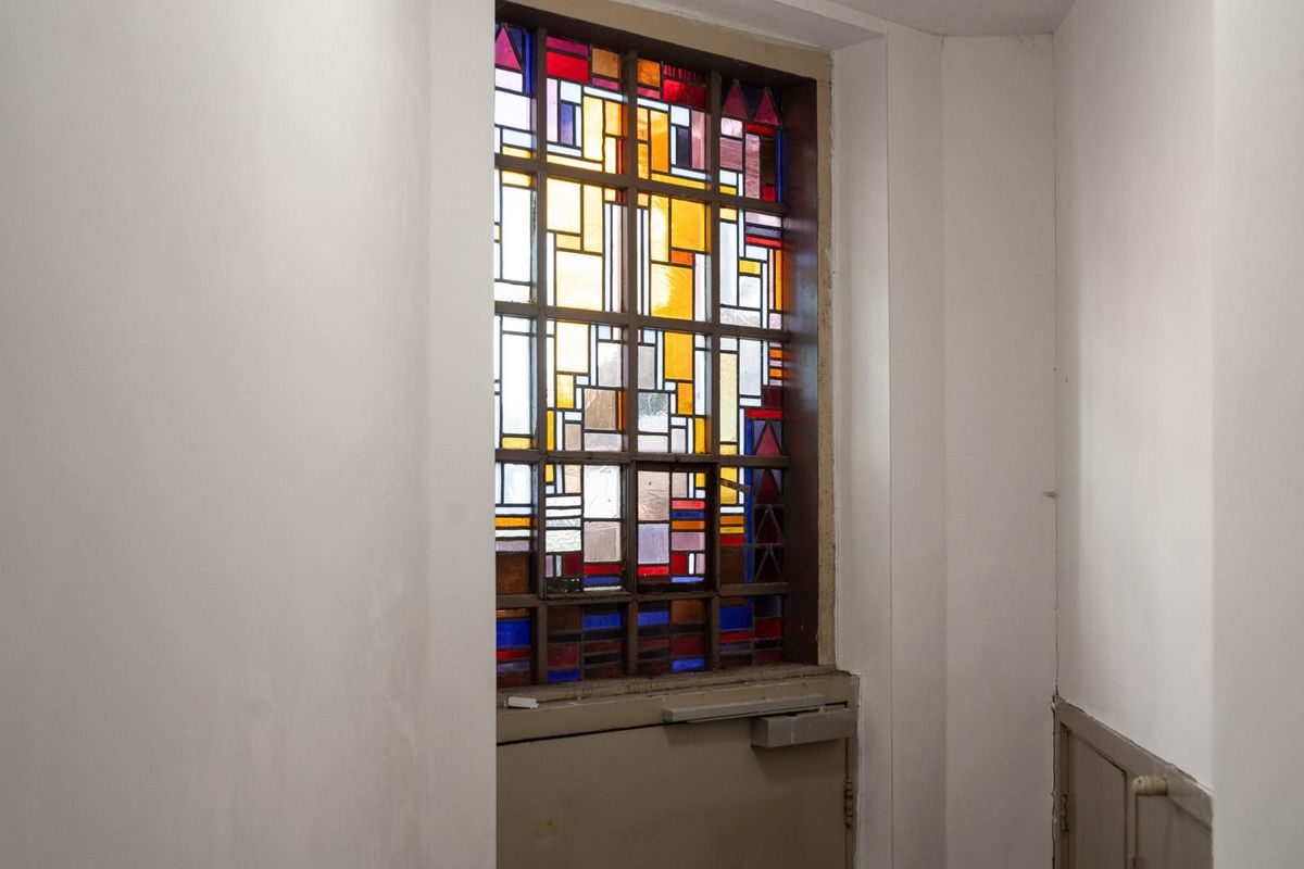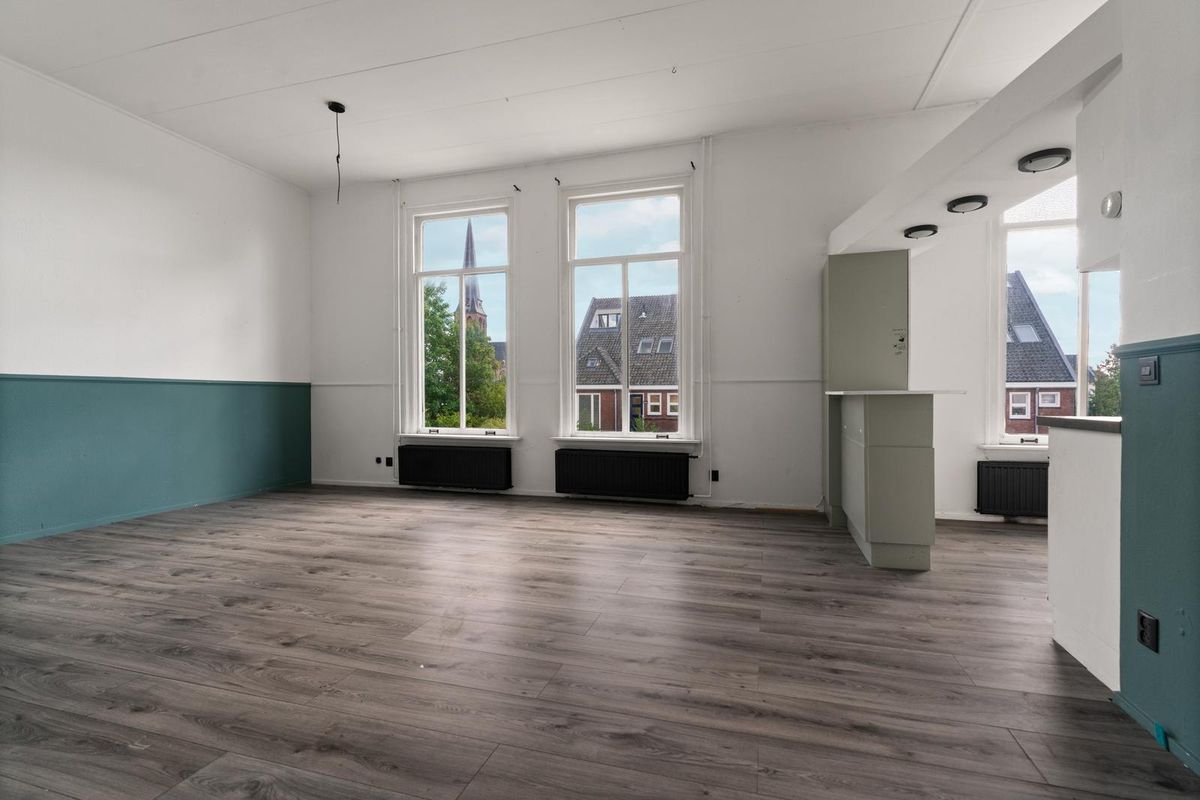 1e verdieping: hal met videofoon, deur naar badkamer/toiletruimte en de prachtige woonkamer. De woonkamer heeft authentieke schuiframen en een plafondhoogte van 3.22 m wat een heerlijk gevoel van ruimtelijkheid biedt. Er is vanuit de woonkamer zicht op de rijksmonumentale kerk Onze Lieve Vrouwe Visitatie in de Emmastraat.