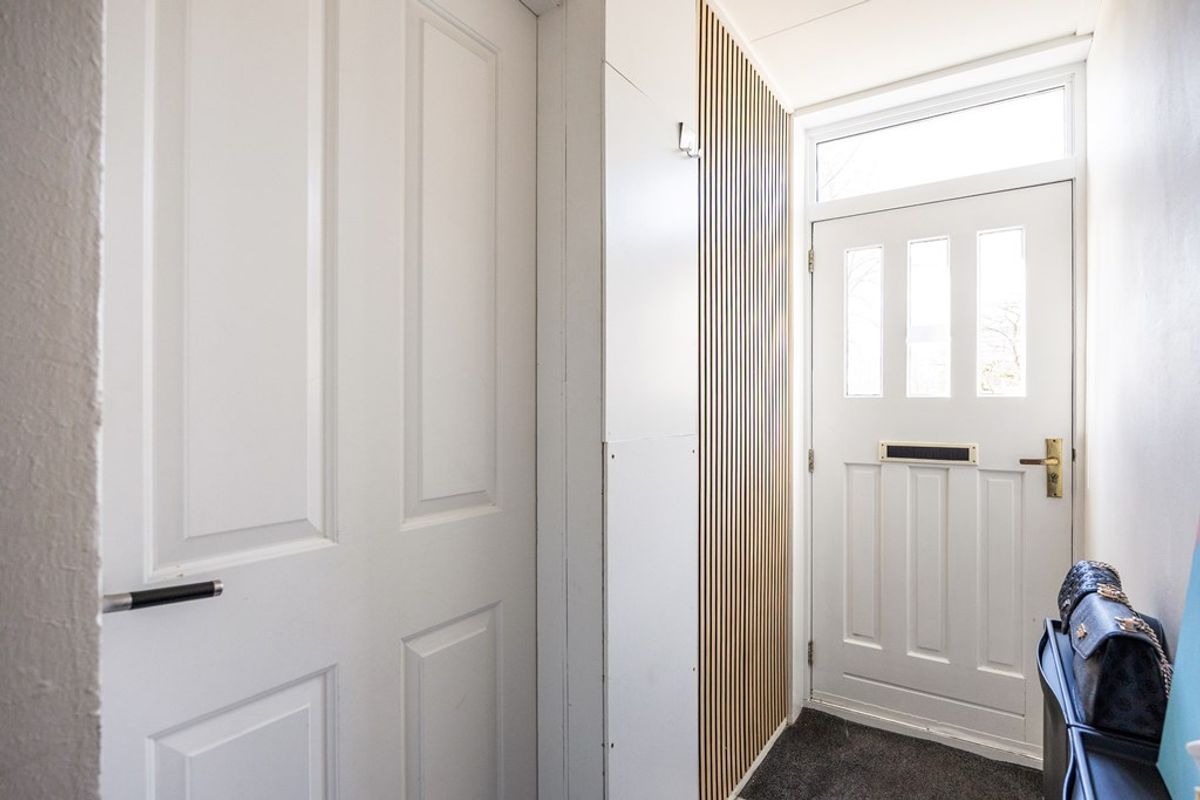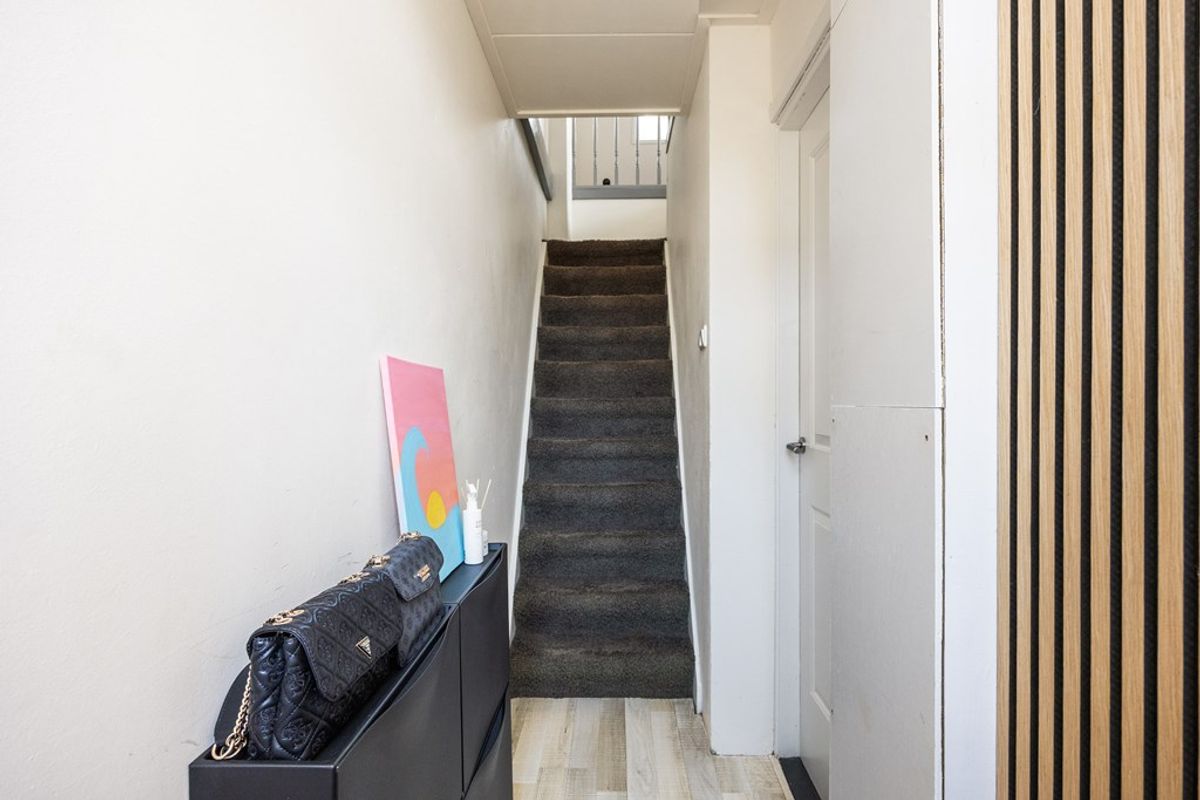 Aansluitend aan de keuken bevindt zich de achterhal met toilet, wasmachineaansluiting en toegang tot de tuin. Ook is er een handige trapkast aanwezig voor extra bergruimte.