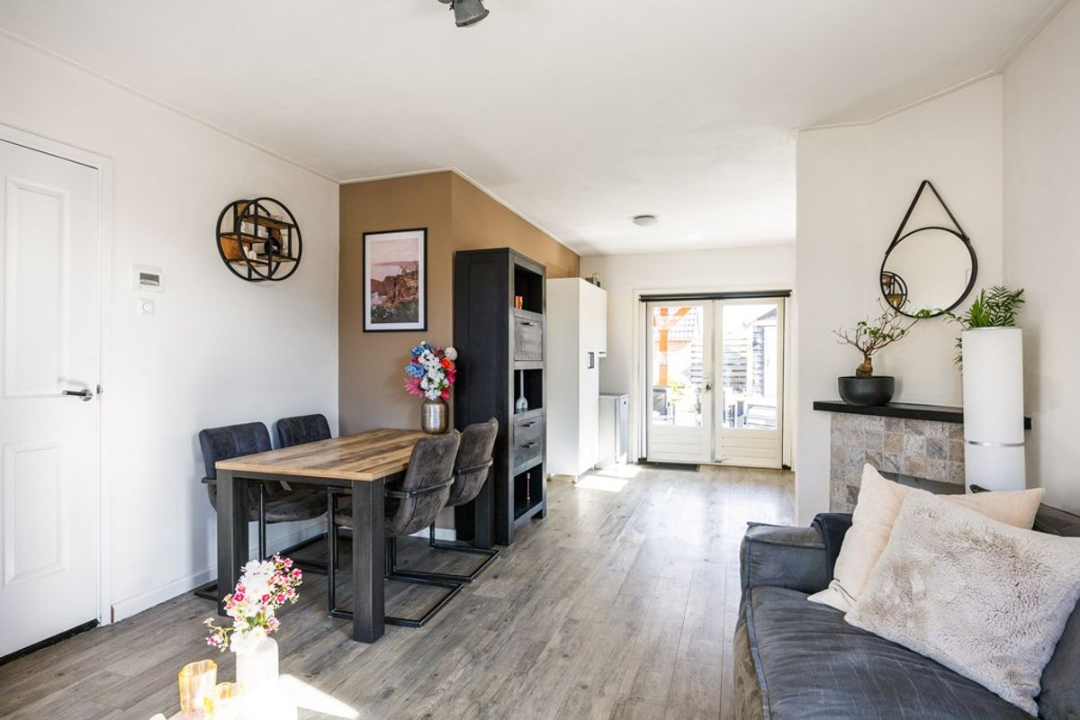 Bij binnenkomst treft u de entree met meterkast en trapopgang, waarna u doorloopt naar de woonkamer. De sfeervolle woonkamer staat in open verbinding met de keuken, waardoor een ruimtelijk en gezellig geheel ontstaat. De keuken is praktisch ingericht en voorzien van koelkast, vrieskast, gasstel en losstaande vaatwasser. Via openslaande deuren vormt de keuken een direct verbinding met de achtertuin, waardoor binnen en buiten op prettige wijze in elkaar overlopen.
