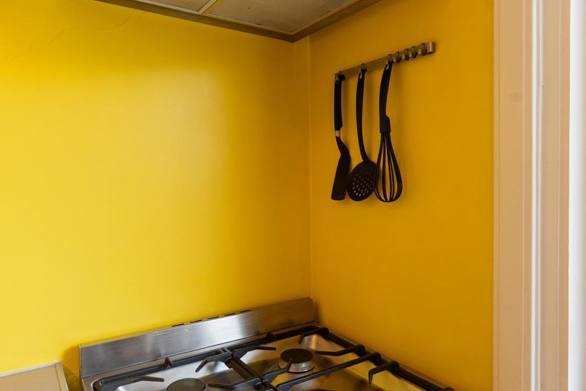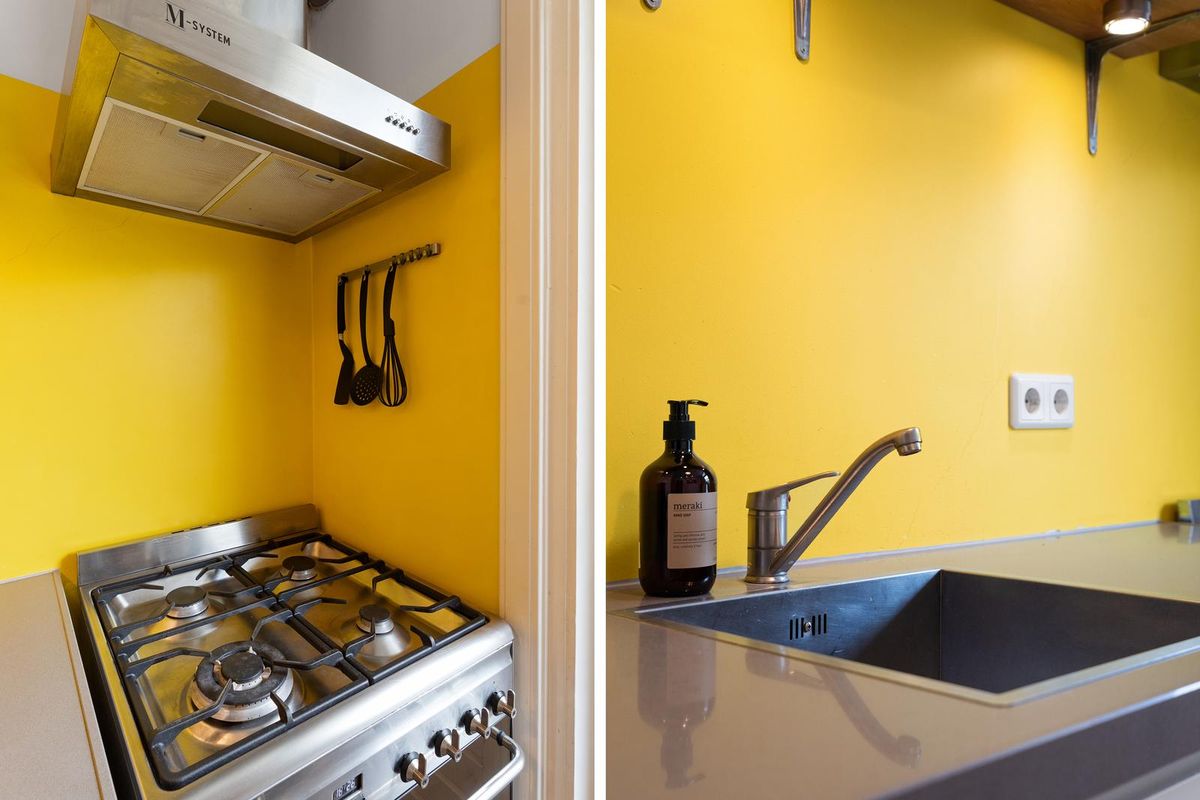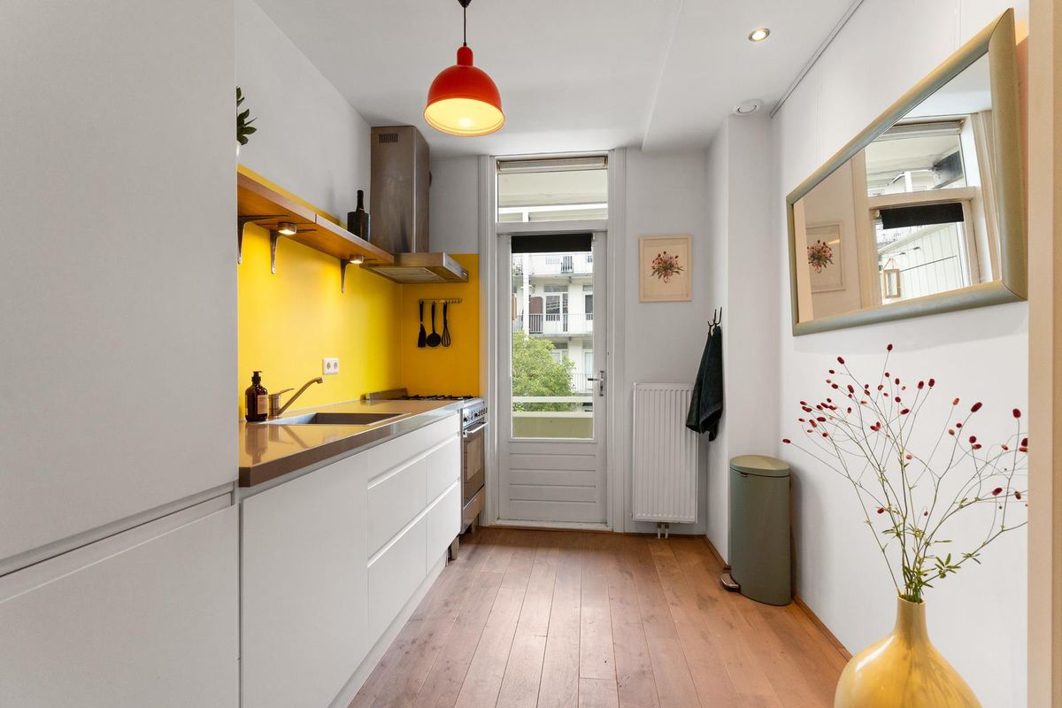 Aan de achterzijde van het appartement bevinden zich zowel de slaapkamer als de keuken. De keuken dateert uit 2011 en beschikt over inbouwapparatuur zoals een 4-pits gasfornuis, ruime koelkast en vriezer, vaatwasmachine en oven. De keuken is bij de renovatie in 2011 vergroot en de leidingen zijn daarbij in de muur verwerkt.