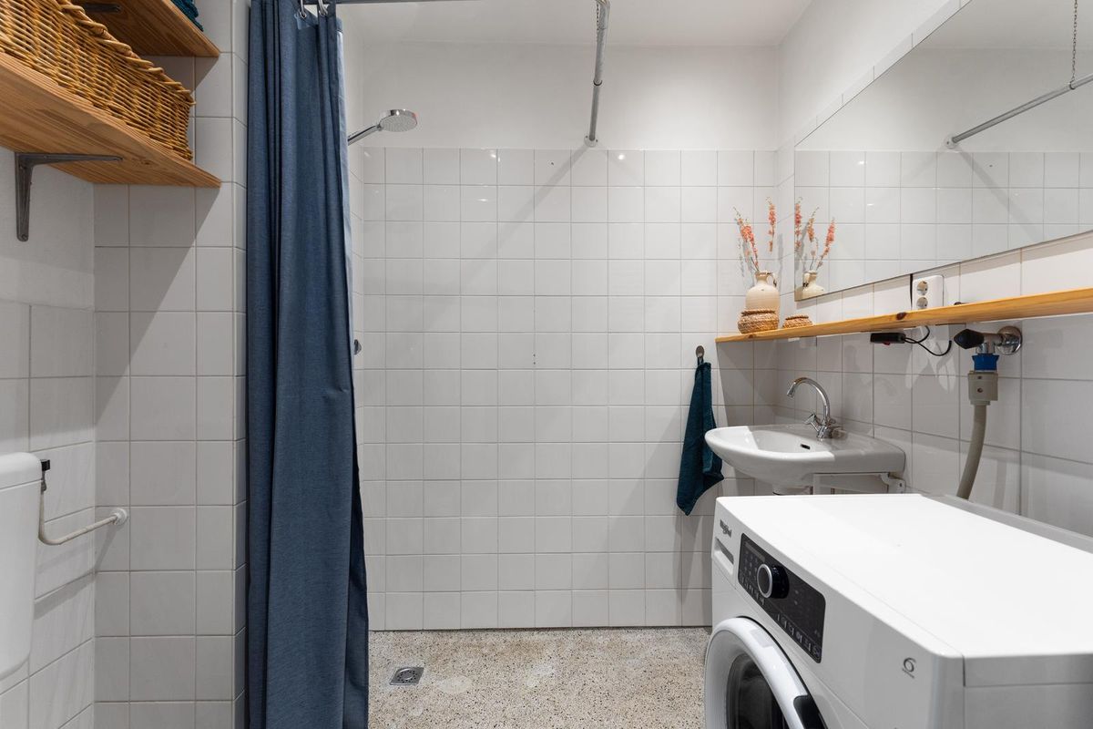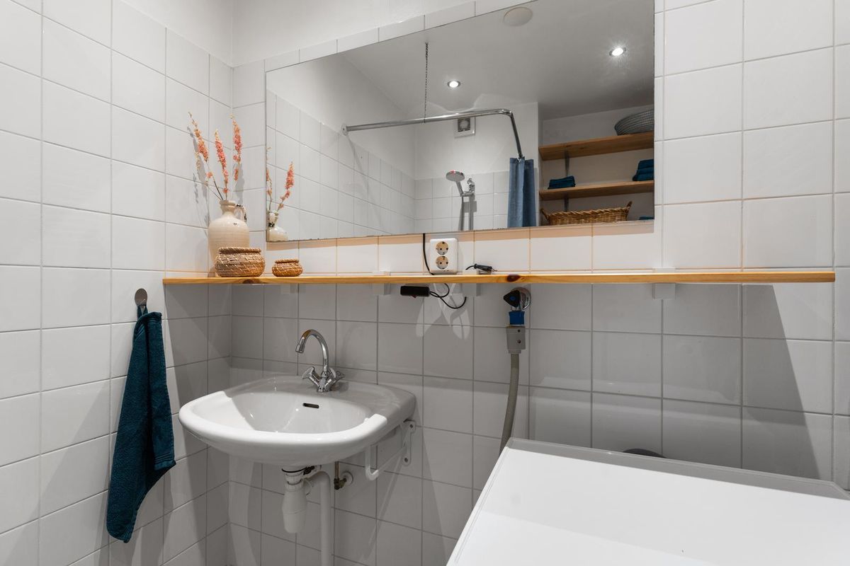 De badkamer is ten slotte te bereiken via de entreehal, en beschikt over een inloopdouche, wastafel, toilet en wasmachineaansluiting. Ten slotte beschikt het appartement over een eigen berging op de bovenste verdieping, van ca. 9m².