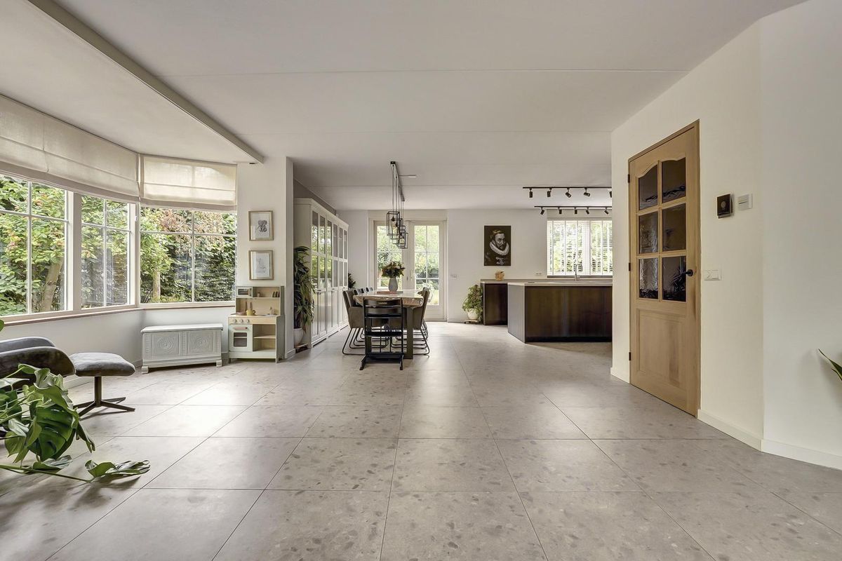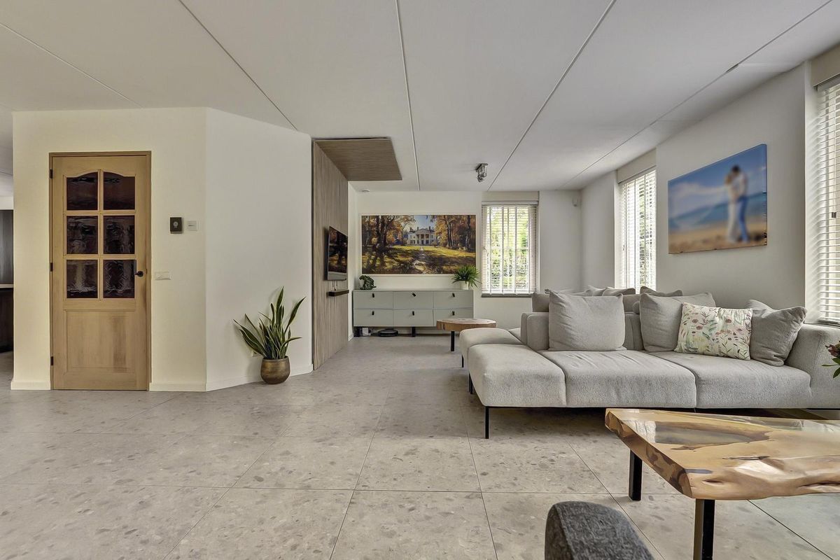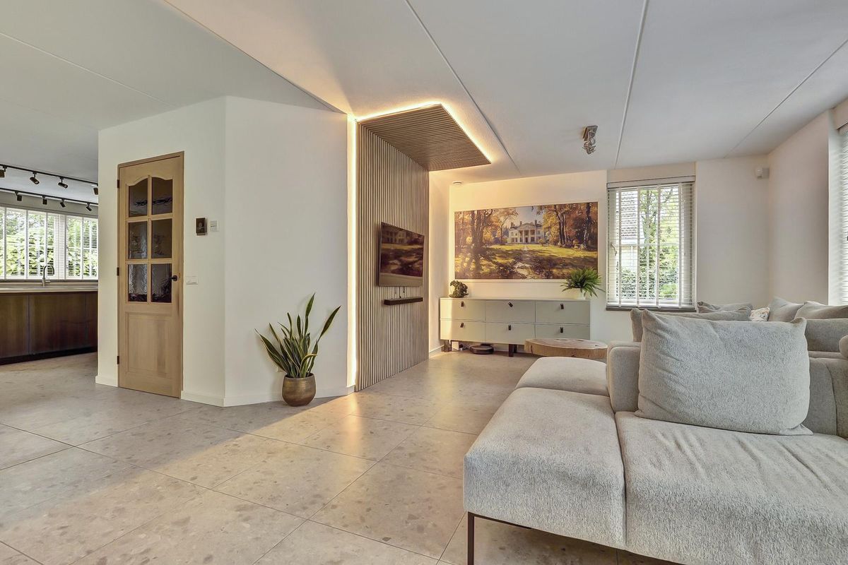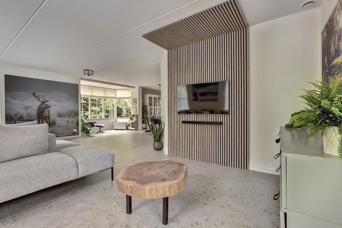 De woonkamer is een heerlijke leefruimte met een sfeervolle erker, grote raampartijen en moderne afwerking. De lichte tegelvloer in natuursteenlook met nieuwe vloerverwarming (2024), de strakke witte wanden en een imposante wanddecoratie creëren een stijlvolle en eigentijdse sfeer. Een opvallend detail is de tv, fraai weggewerkt in houten wandpanelen met subtiele ledverlichting. Dankzij de indeling is er plek voor zowel een royale zithoek als een aparte lees- of werkhoek.