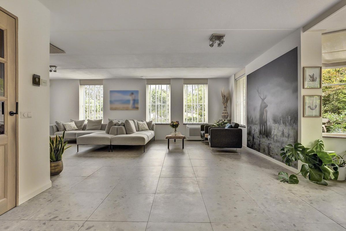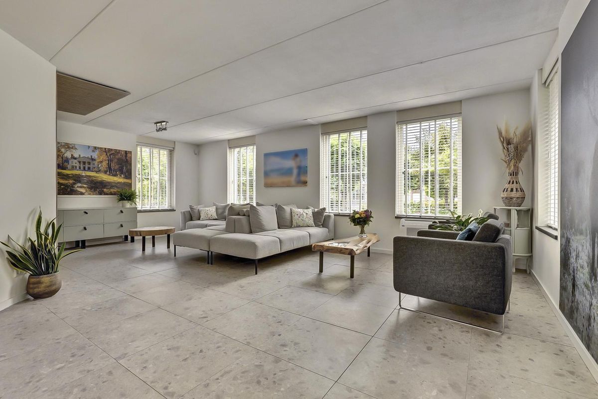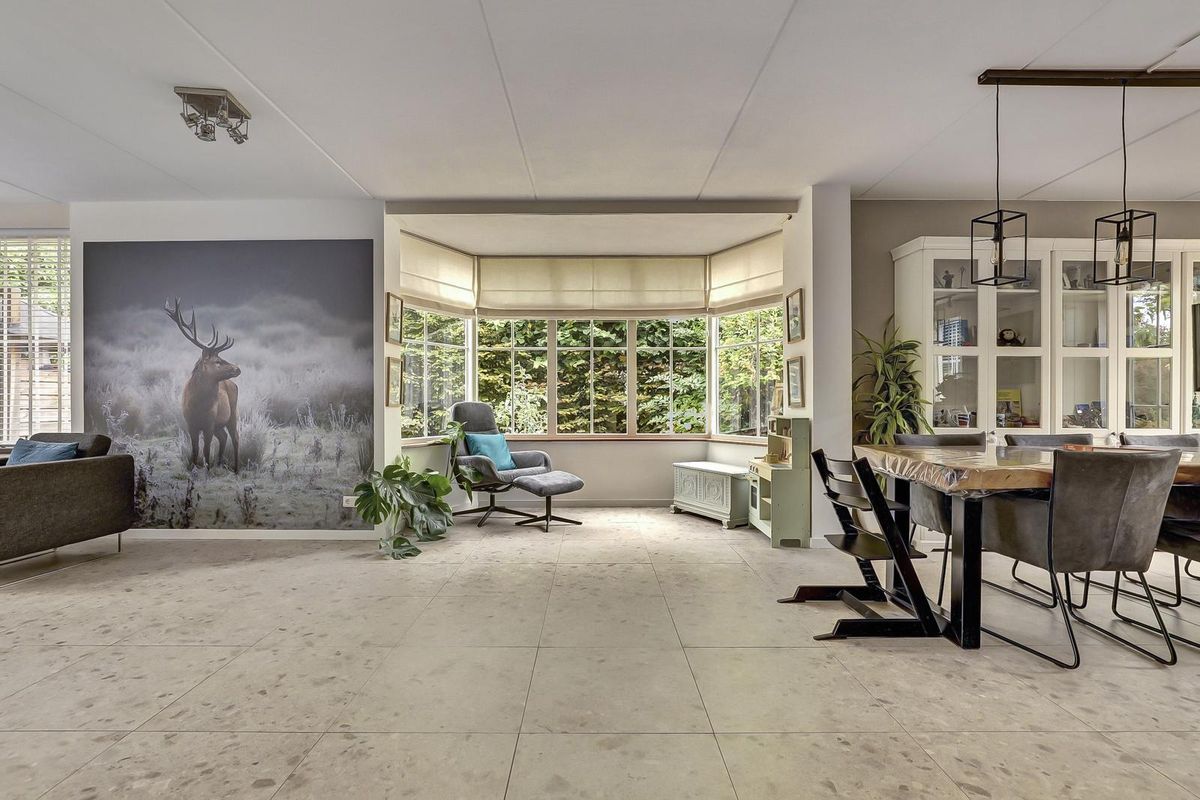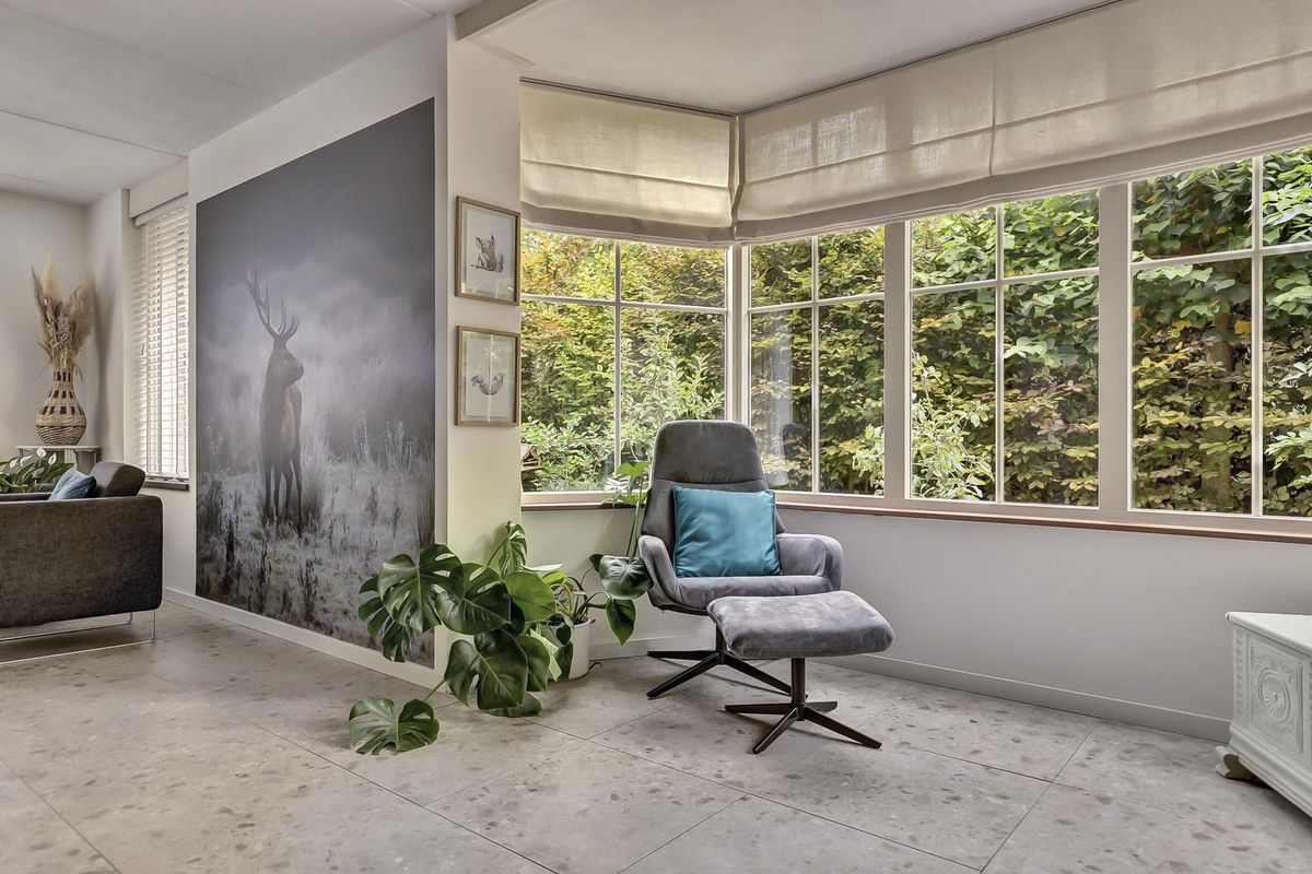 De woonkamer is een heerlijke leefruimte met een sfeervolle erker, grote raampartijen en moderne afwerking. De lichte tegelvloer in natuursteenlook met nieuwe vloerverwarming (2024), de strakke witte wanden en een imposante wanddecoratie creëren een stijlvolle en eigentijdse sfeer. Een opvallend detail is de tv, fraai weggewerkt in houten wandpanelen met subtiele ledverlichting. Dankzij de indeling is er plek voor zowel een royale zithoek als een aparte lees- of werkhoek.