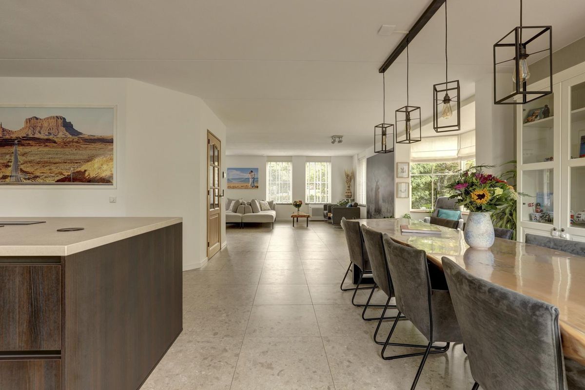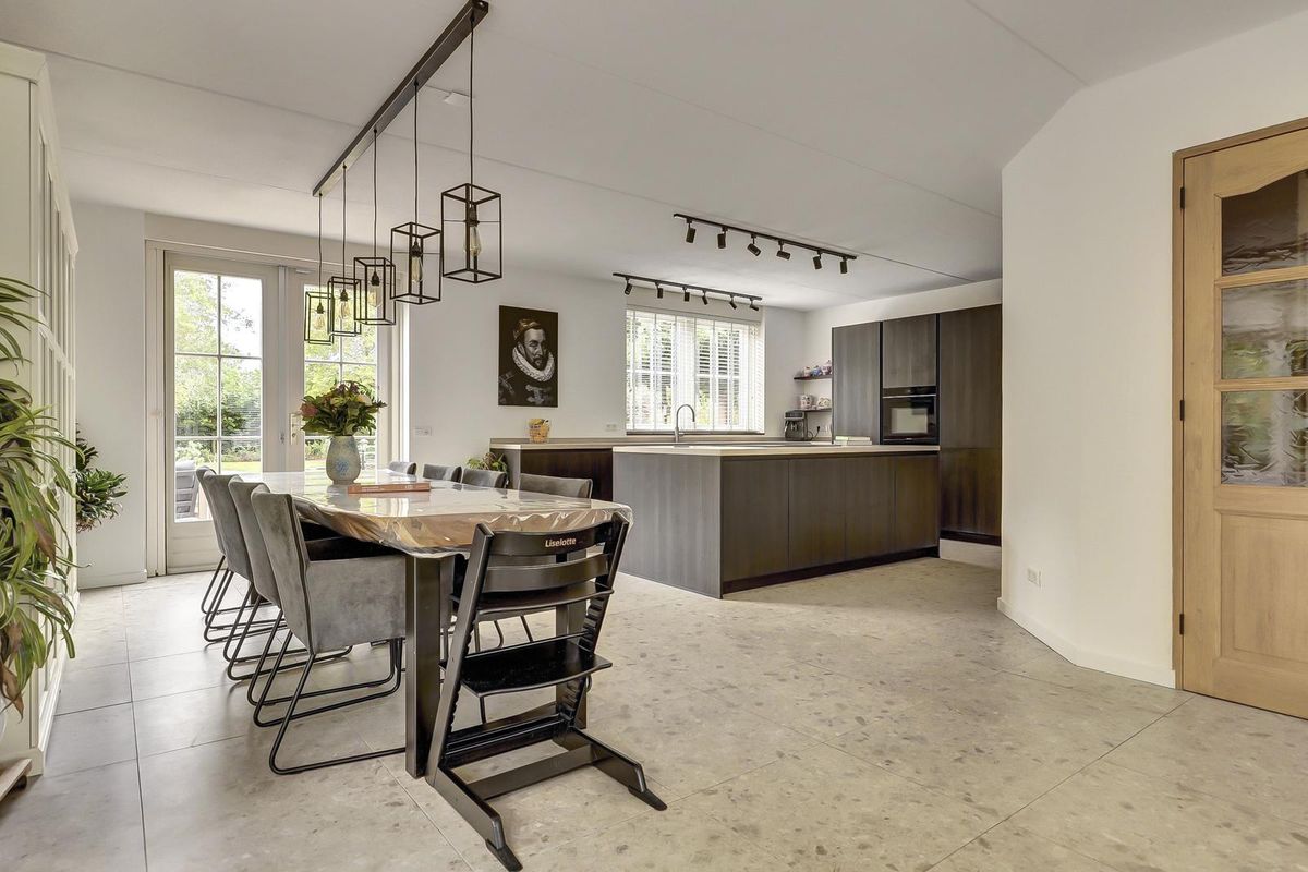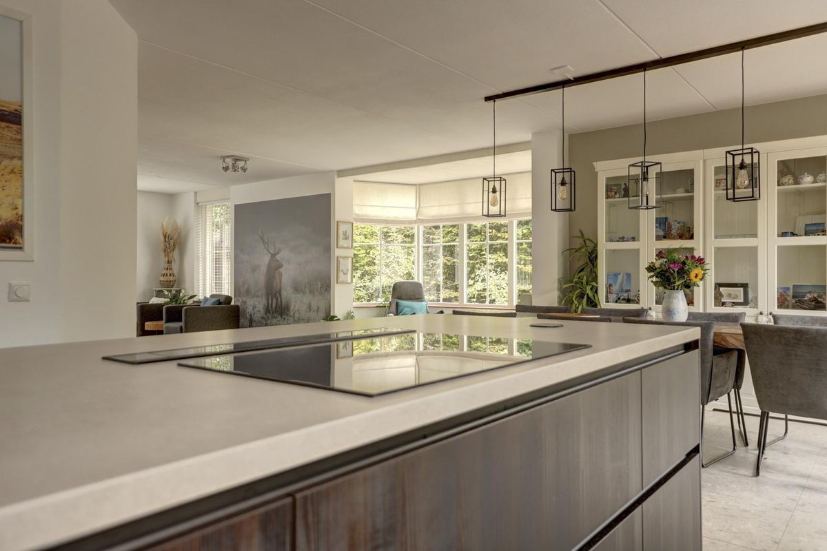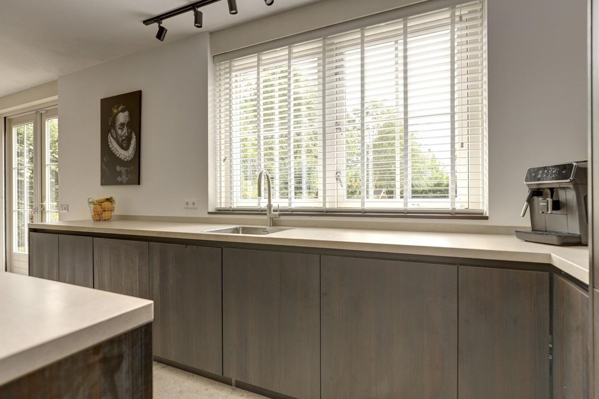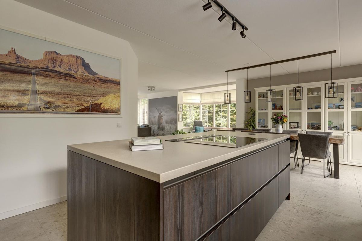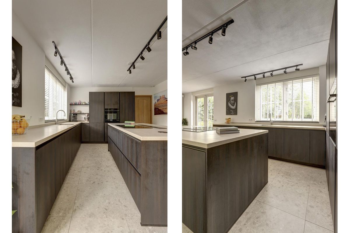 De woonkeuken vormt het hart van de woning, strak uitgevoerd met donkere fronten, een licht werkblad en een centraal kookeiland. De combinatie van warme houttinten en moderne verlichting geeft de keuken een luxe uitstraling. Grote ramen en tuindeuren zorgen voor veel licht en een prettig contact met buiten. De keuken is voorzien van hoogwaardige inbouwapparatuur: inductiekookplaat met geïntegreerd afzuigsysteem, combi-oven, vaatwasser, koelkast, vriezer en Quooker. Hier is ruimte voor een royale eettafel waar u met familie of vrienden uitgebreid kunt dineren. Aangrenzend bevindt zich de bijkeuken, ideaal als extra bergruimte of voor een tweede koelkast/vriezer. Vanuit hier bereikt u de inpandige, volledig geïsoleerde garage met elektrische garagedeur.
