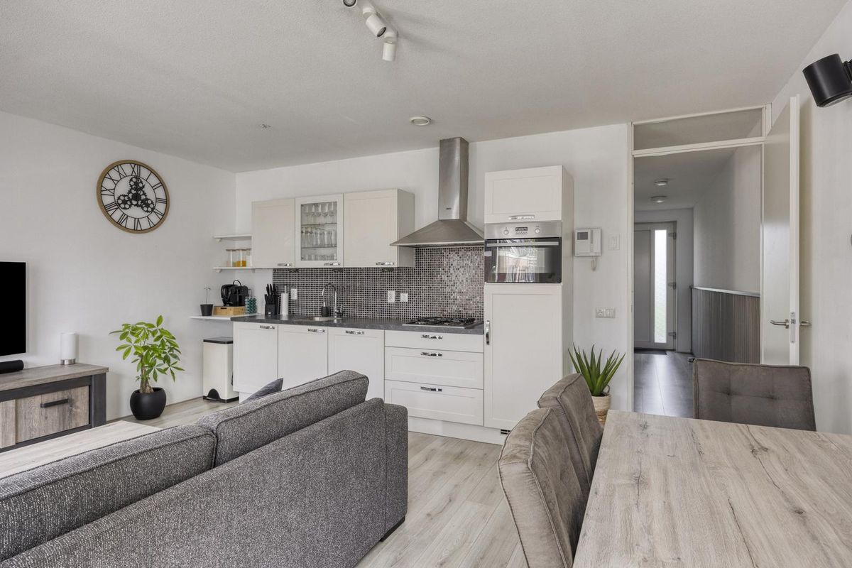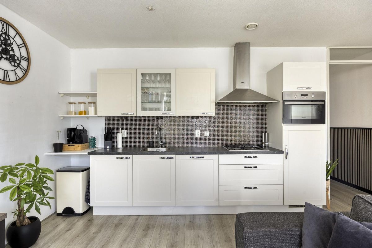 De open keuken sluit naadloos aan op de woonkamer en is modern ingericht met een strakke opstelling en diverse inbouwapparatuur.