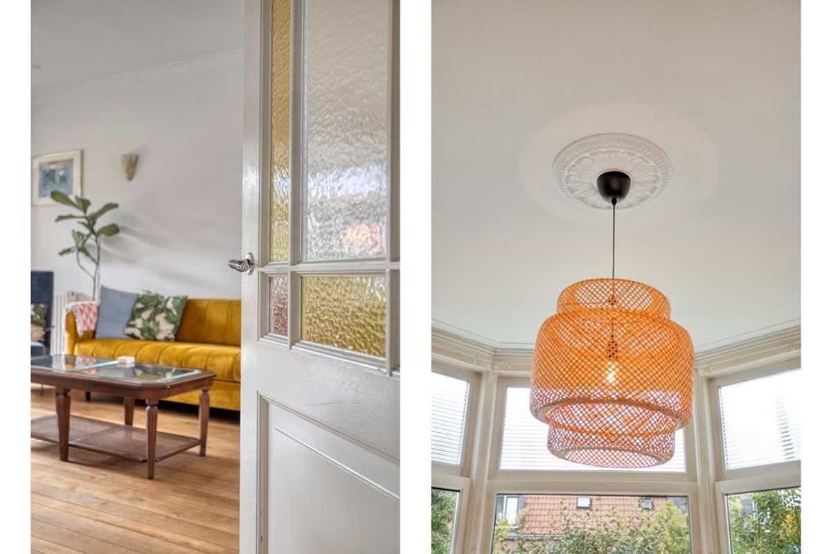 We komen binnen in de hal, waar direct de kenmerkende jaren ’30 details opvallen: de fraaie deurkozijnen, de brede trapopgang en de details op de trapleuning. De hal is royaal van formaat en voorzien van een uitgebreide meterkast, handige trapkast en een net, ruim toilet met een fonteintje.