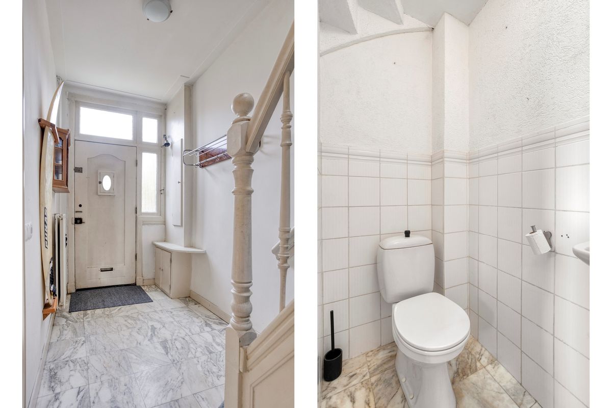 We komen binnen in de hal, waar direct de kenmerkende jaren ’30 details opvallen: de fraaie deurkozijnen, de brede trapopgang en de details op de trapleuning. De hal is royaal van formaat en voorzien van een uitgebreide meterkast, handige trapkast en een net, ruim toilet met een fonteintje.