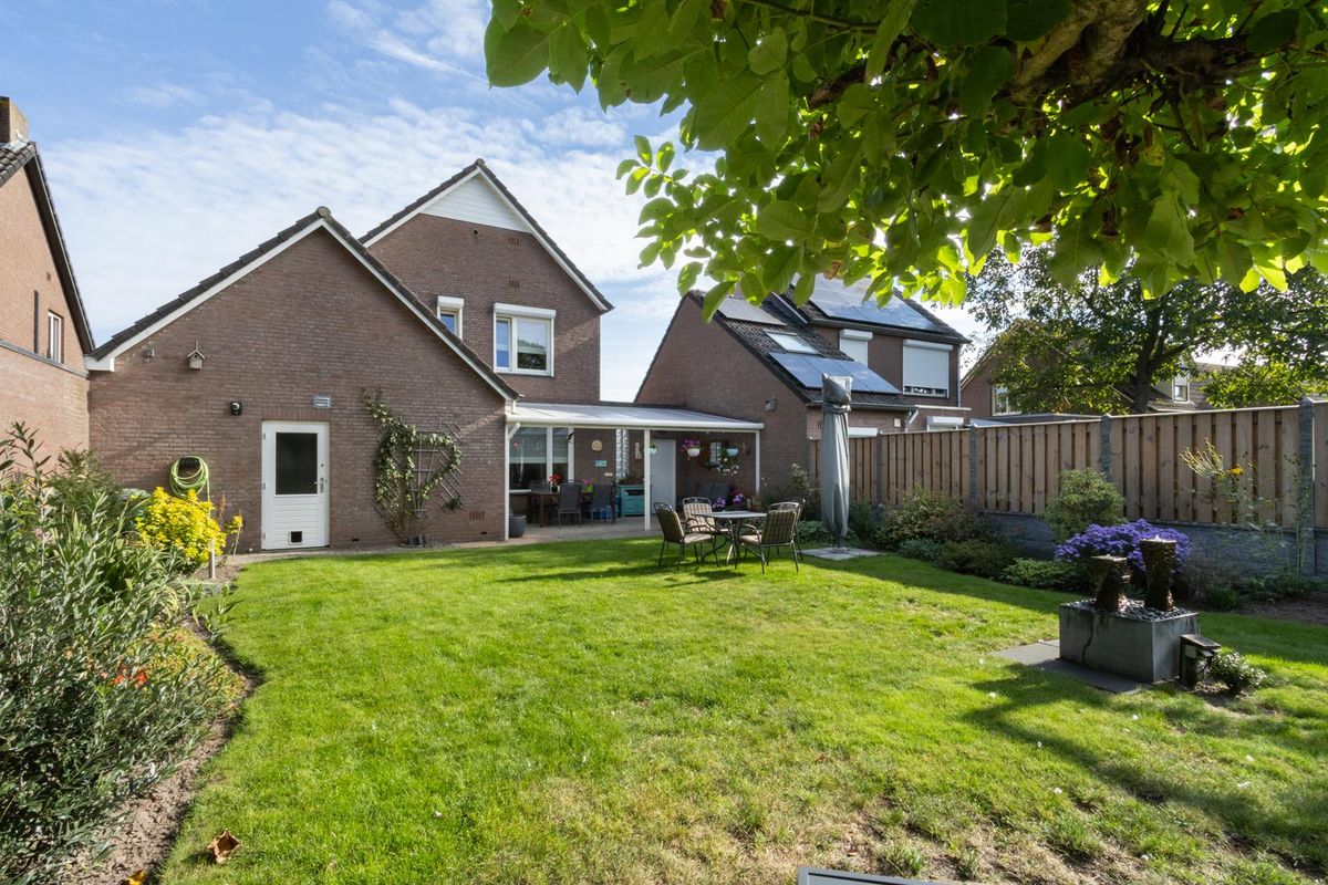 Aansluitend via de keuken is aan de achtergevel een fijne overkapping geplaats van waaruit een werkelijk magnifiek uitzicht over de mooie tuin en achter gelegen landerijen geboden wordt. Deze tuin heeft een heerlijke zonne-ligging en biedt optimale privacy.
