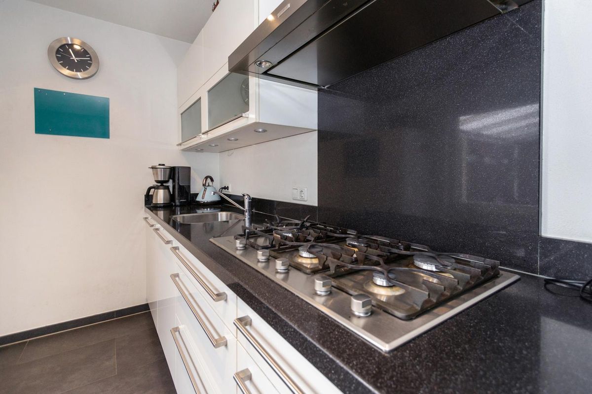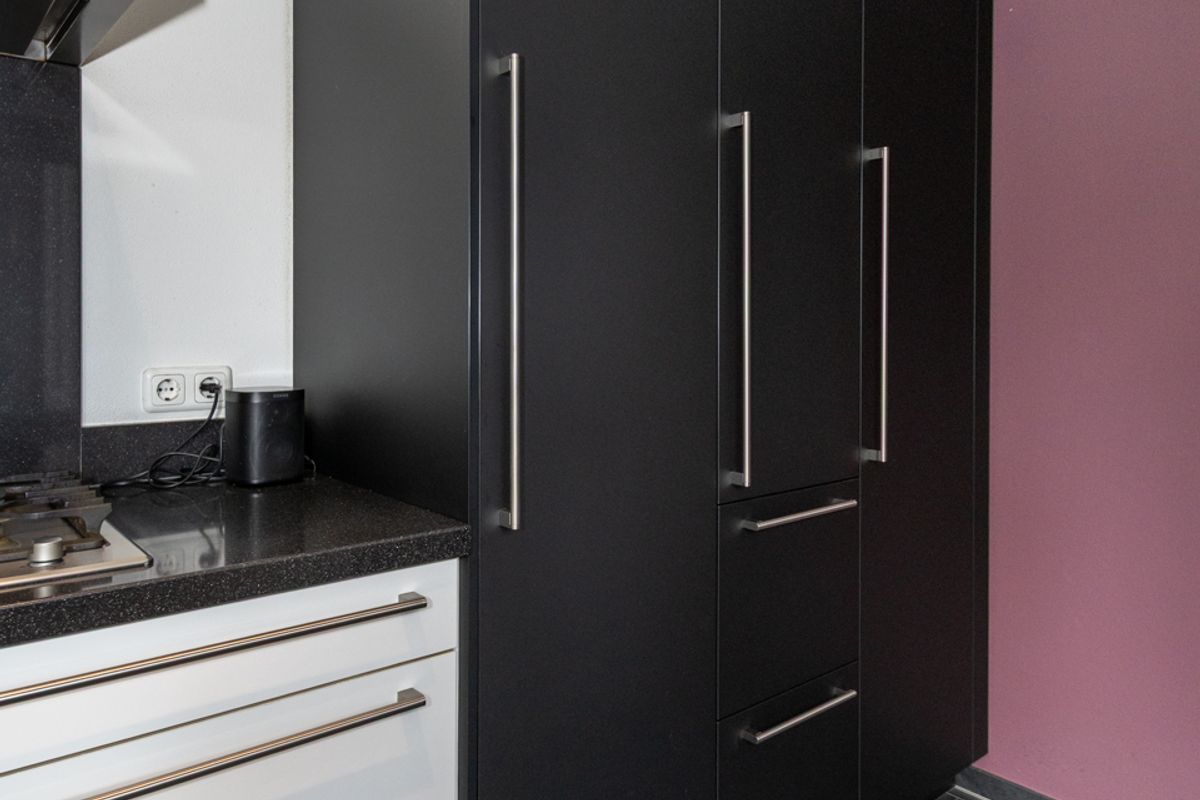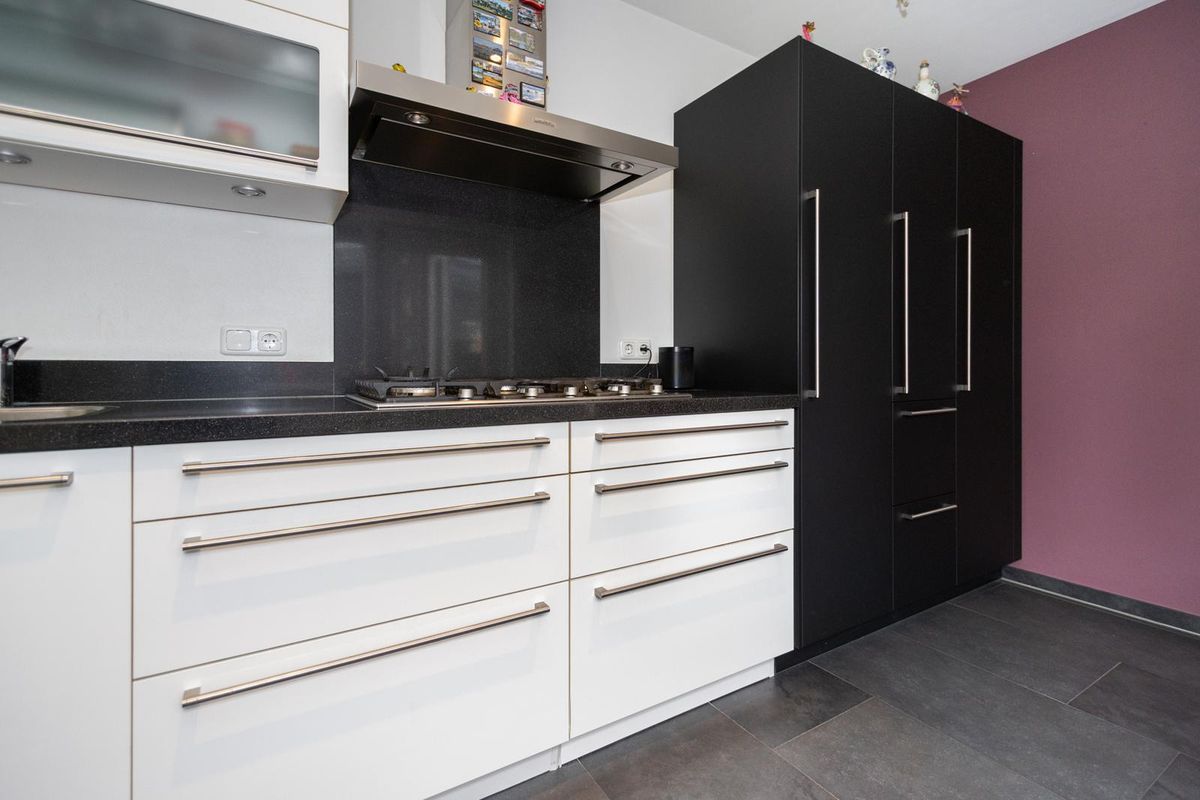 Aansluitend aan achterzijde/zijkant komt de keuken met een royale L-vormige opstelling en die is uitgevoerd in gebroken wit en contrasterende moderne donkere kastenwand en groot composiet werkblad. De keuken is van alle gemakken voorzien met een 5-pits gaskookplaat, afzuigkap, combi-oven, vaatwasser en koelkast.